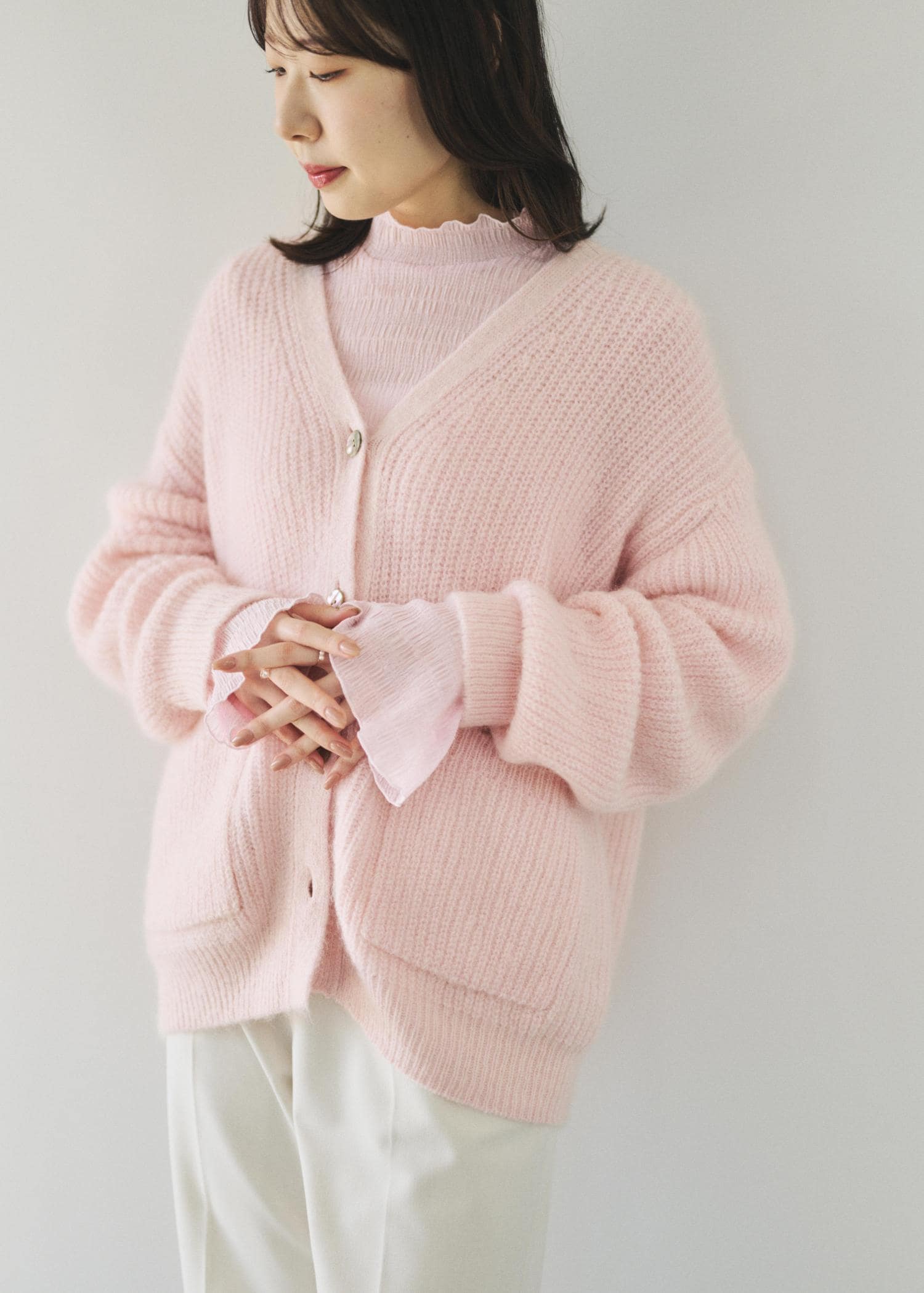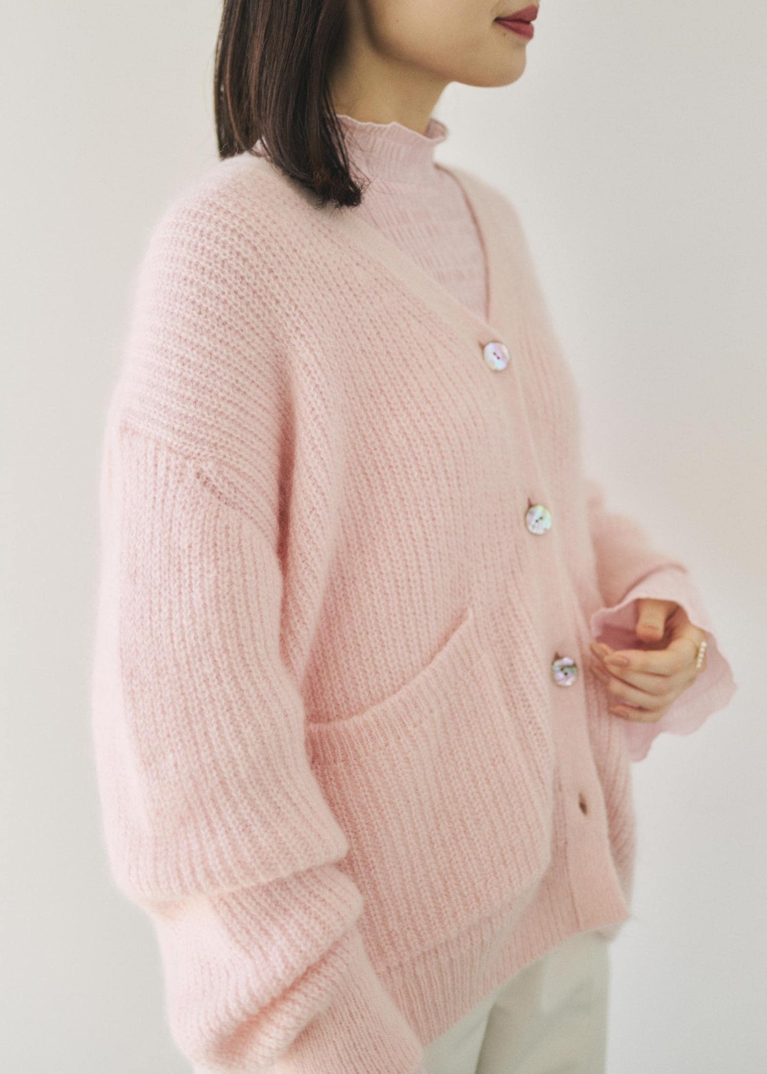 モヘア素材のふわっとした肌触りで、軽くて柔らかいニットカーディガンです。