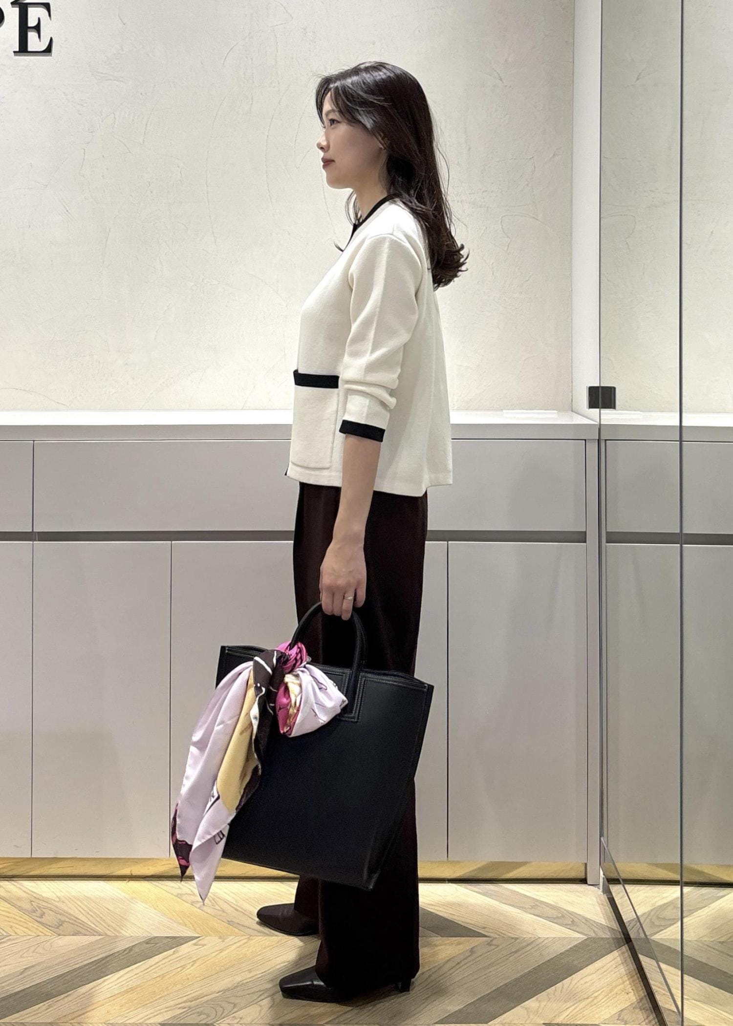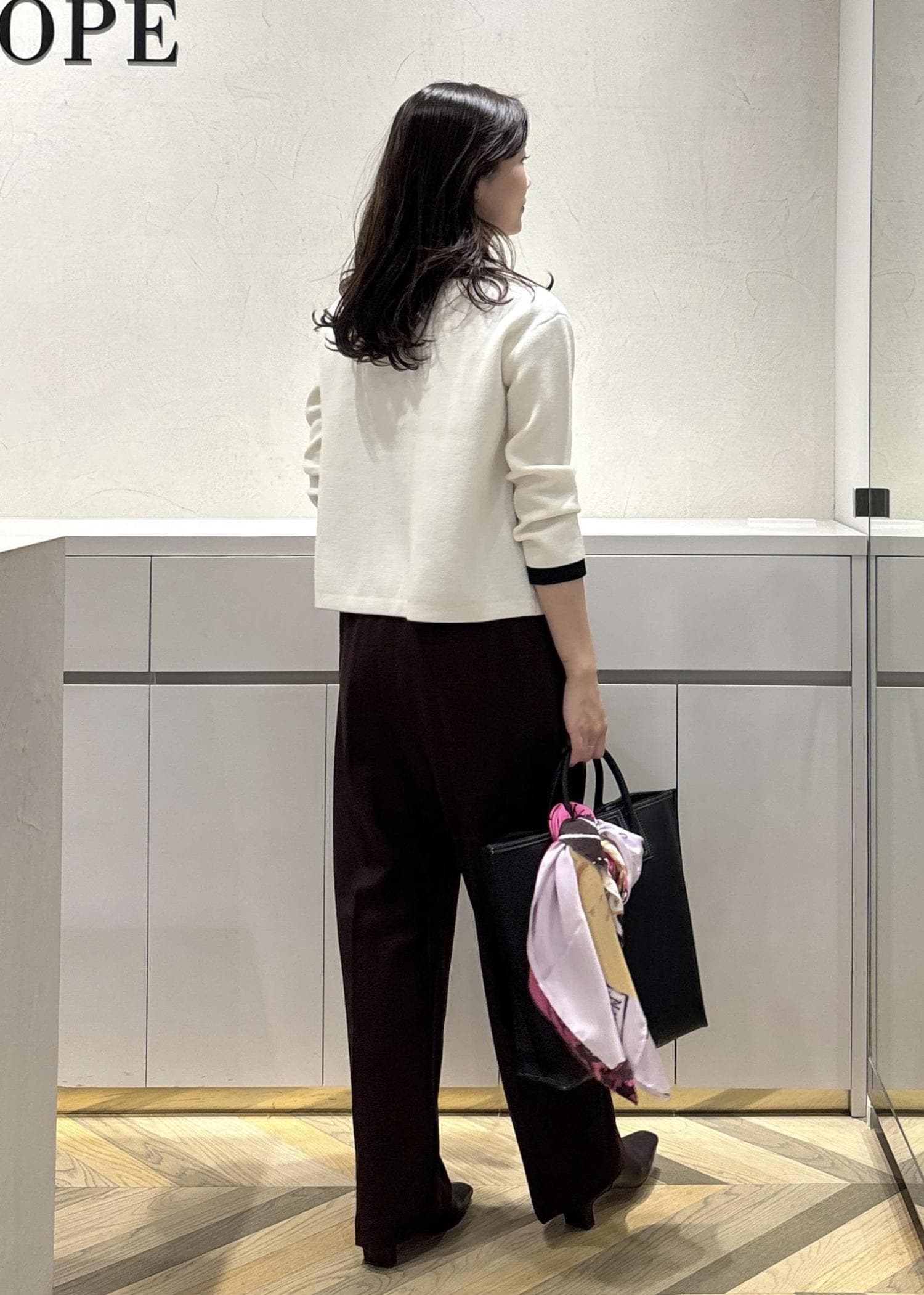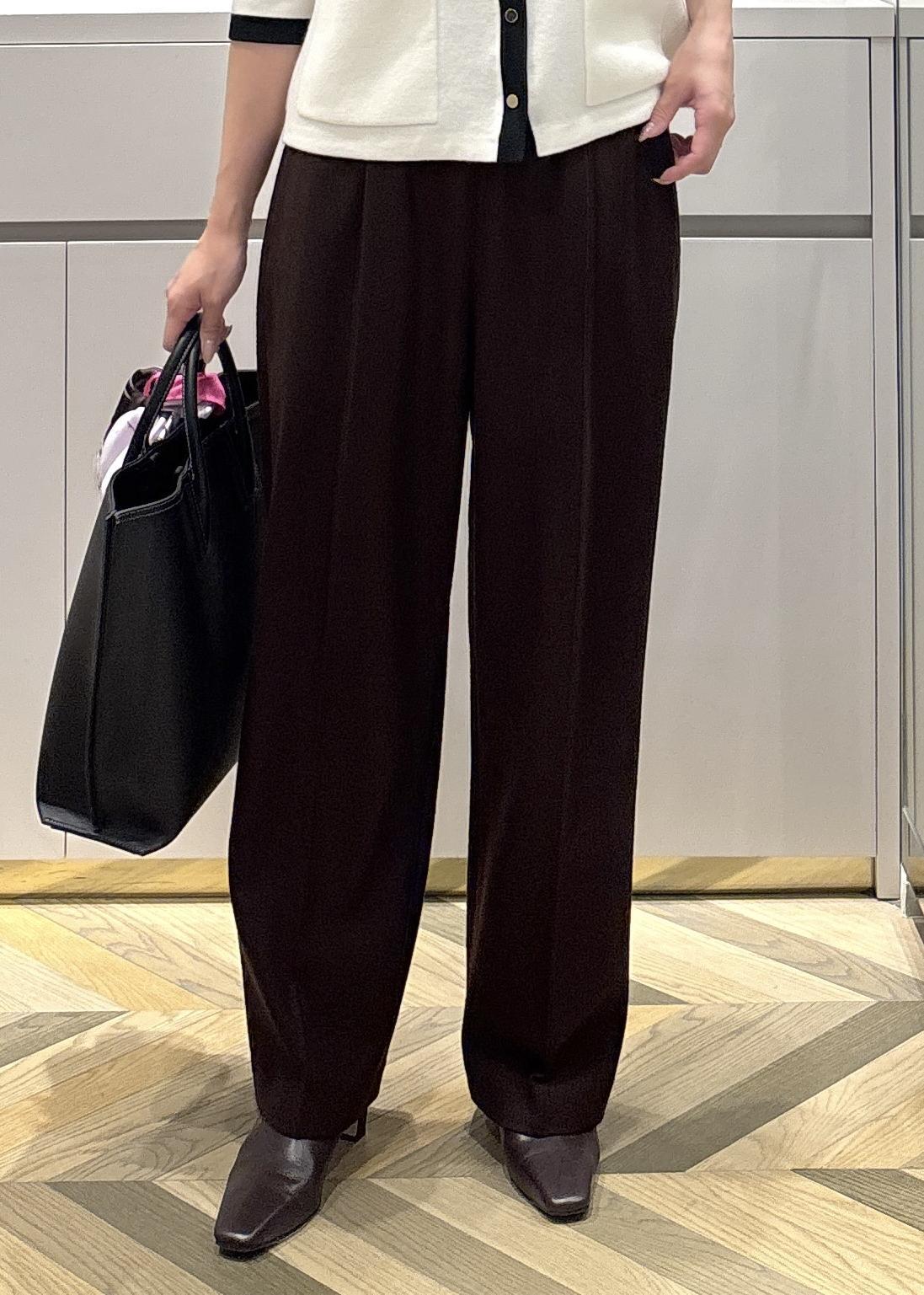 ROPÉウールフランネルタックイージーパンツ/イージーケア・セットアップ対応ダークブラウン / 38¥25,300レビュー柔らかくふっくら感のあるフラノ素材で軽く暖かい着心地です。ウエストは総ゴムで内側にドロストの紐があり調節できる仕様。裾にかけてまっすぐ落ちるシルエットです。全体のサイズ感はややゆったり、着丈は長めでヒールに2cmほどかかるあたり。