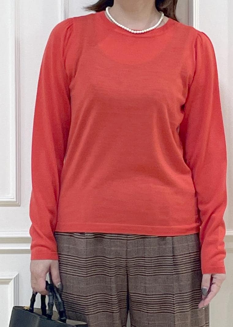 ROPÉ袖ギャザークルーネックニットプルオーバー/イージーケアレッド / F¥19,800レビューフリーサイズ着用。