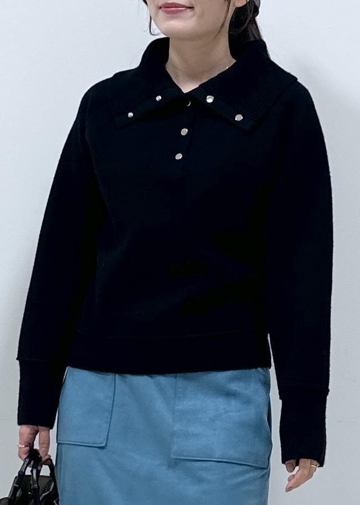 大きめの襟が華やかさをプラスし、ゴールドスナップがアクセントになる着映えニットです!