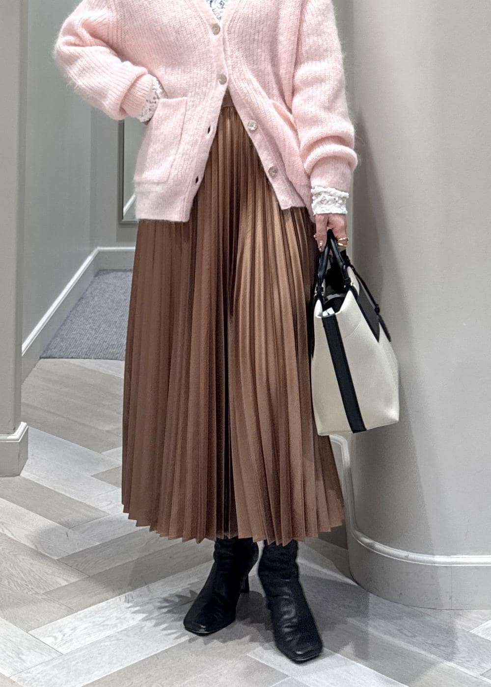 ROPÉシャイニープリーツスカート/イージーケアキャメル / F¥26,400レビュー程よい光沢感が上品な素材感。