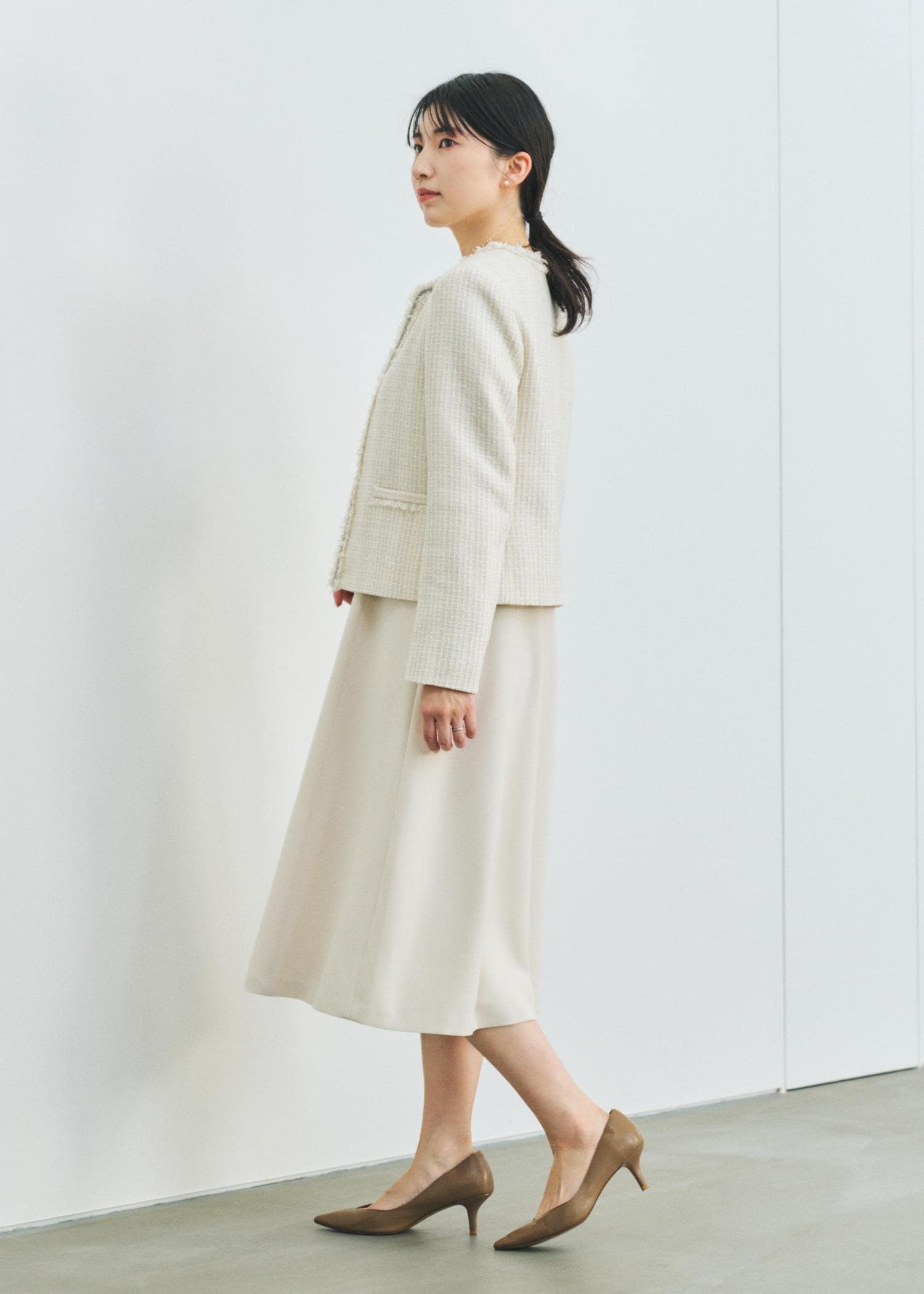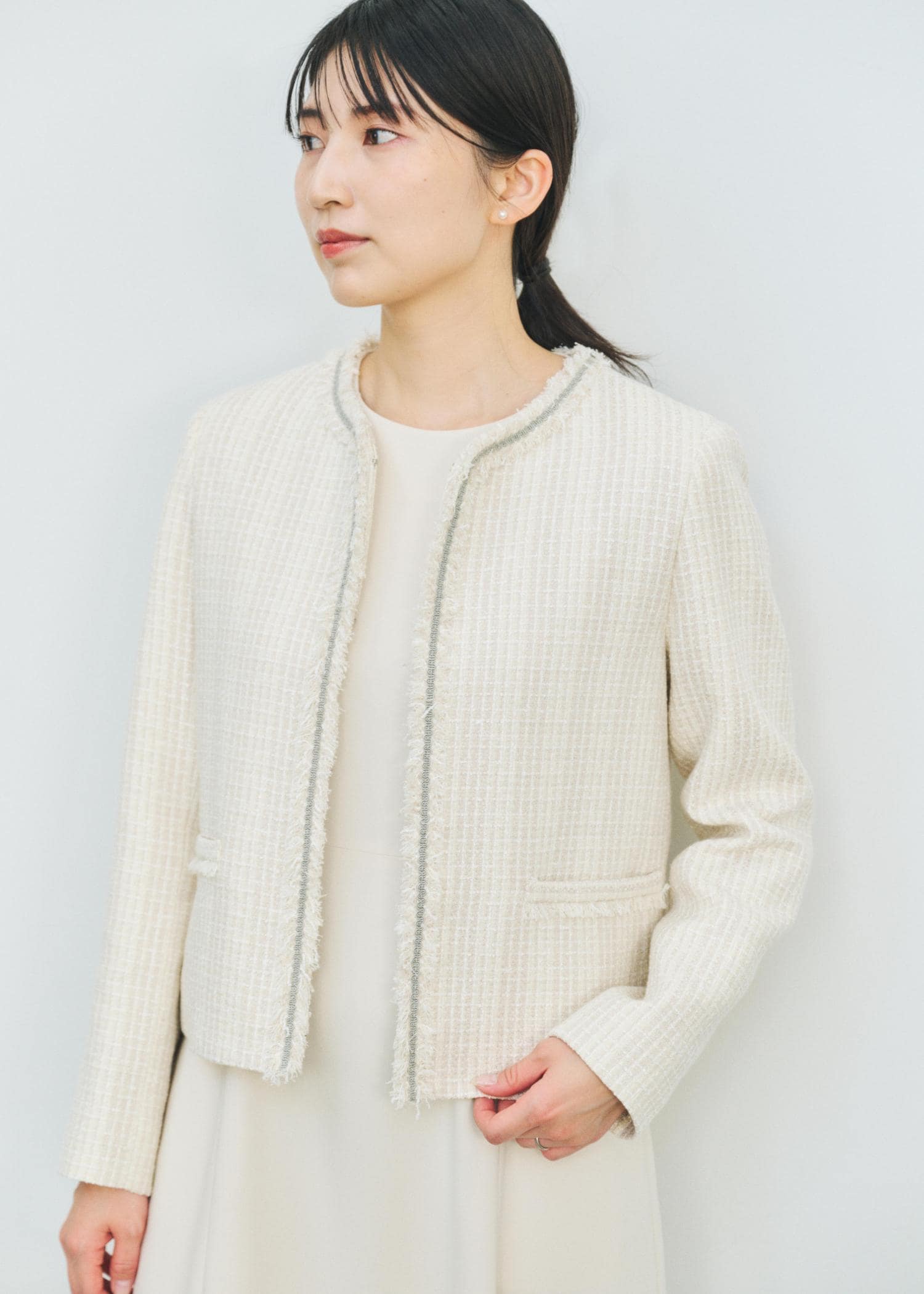 予約ROPÉミックスツイードノーカラージャケット/26SSオフホワイト / 38¥42,900レビュー身長164㎝、普段38サイズ着用。