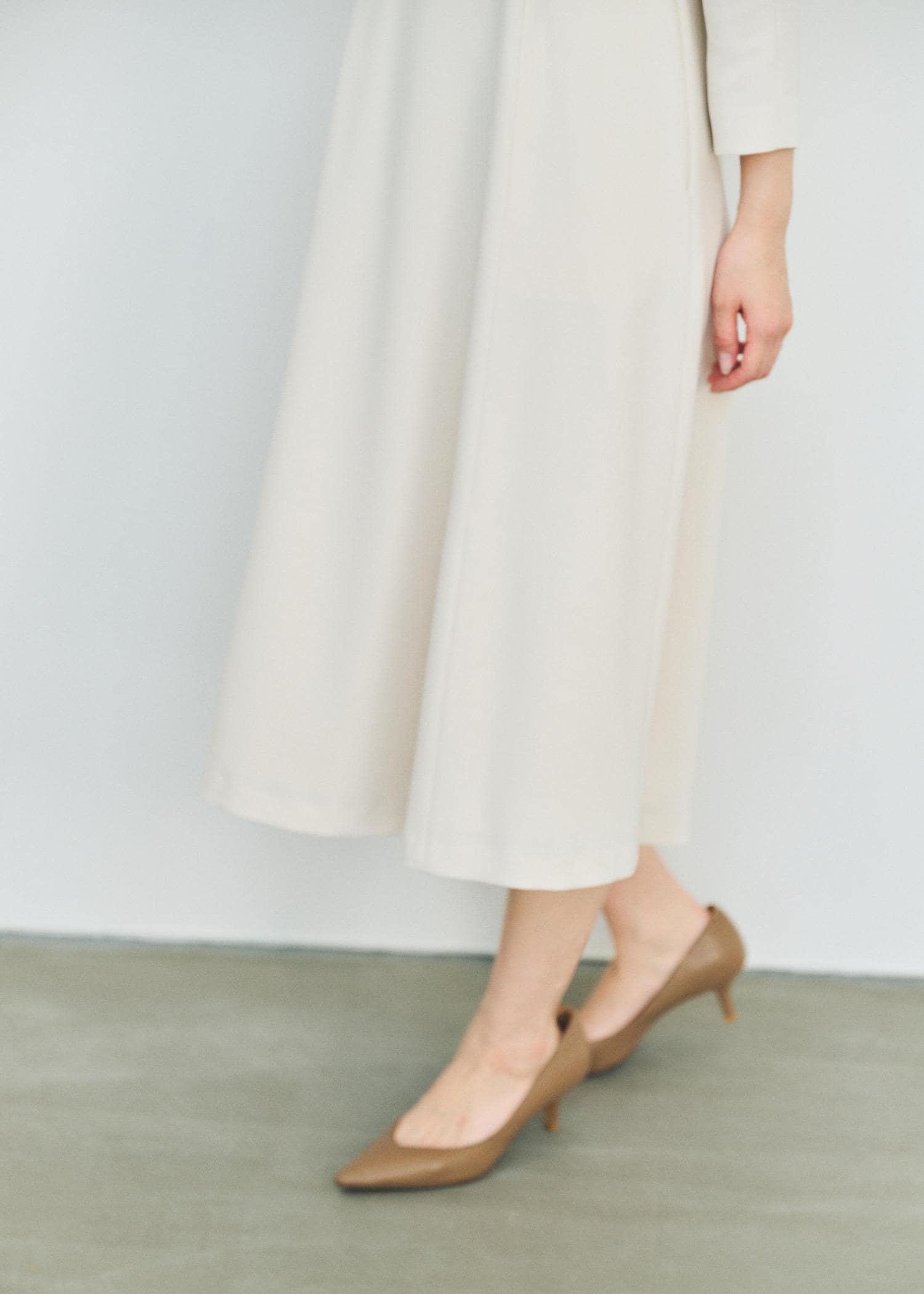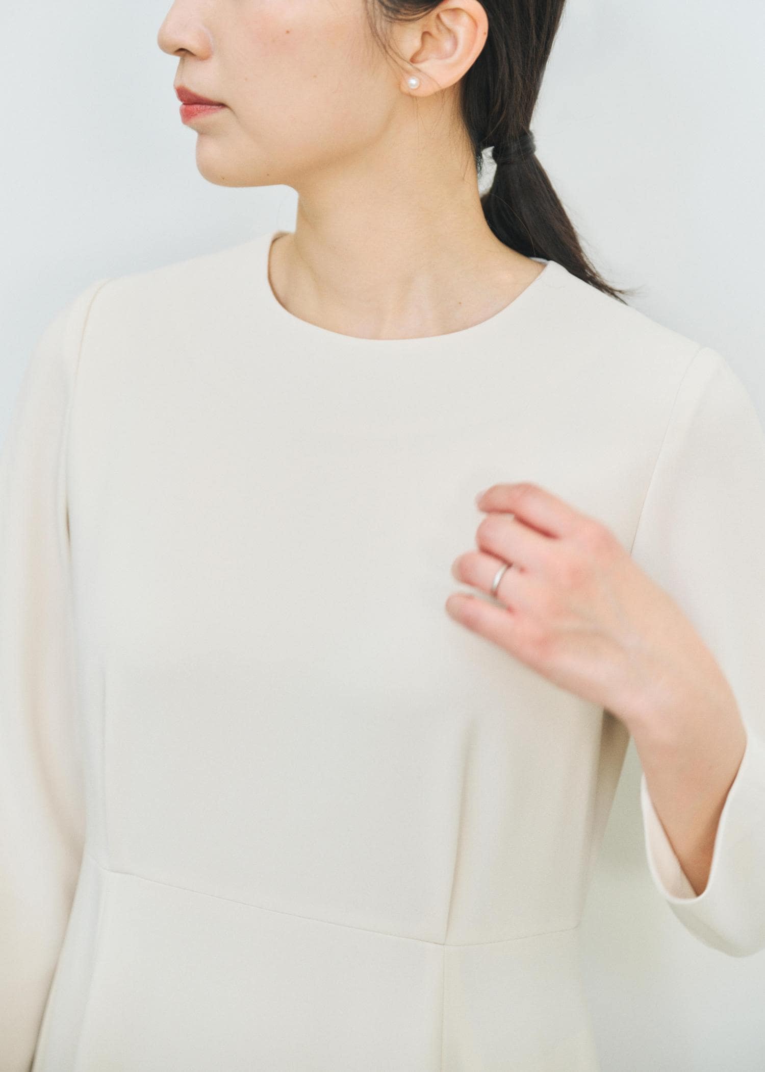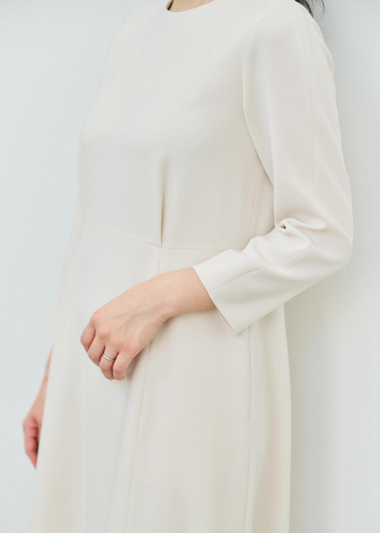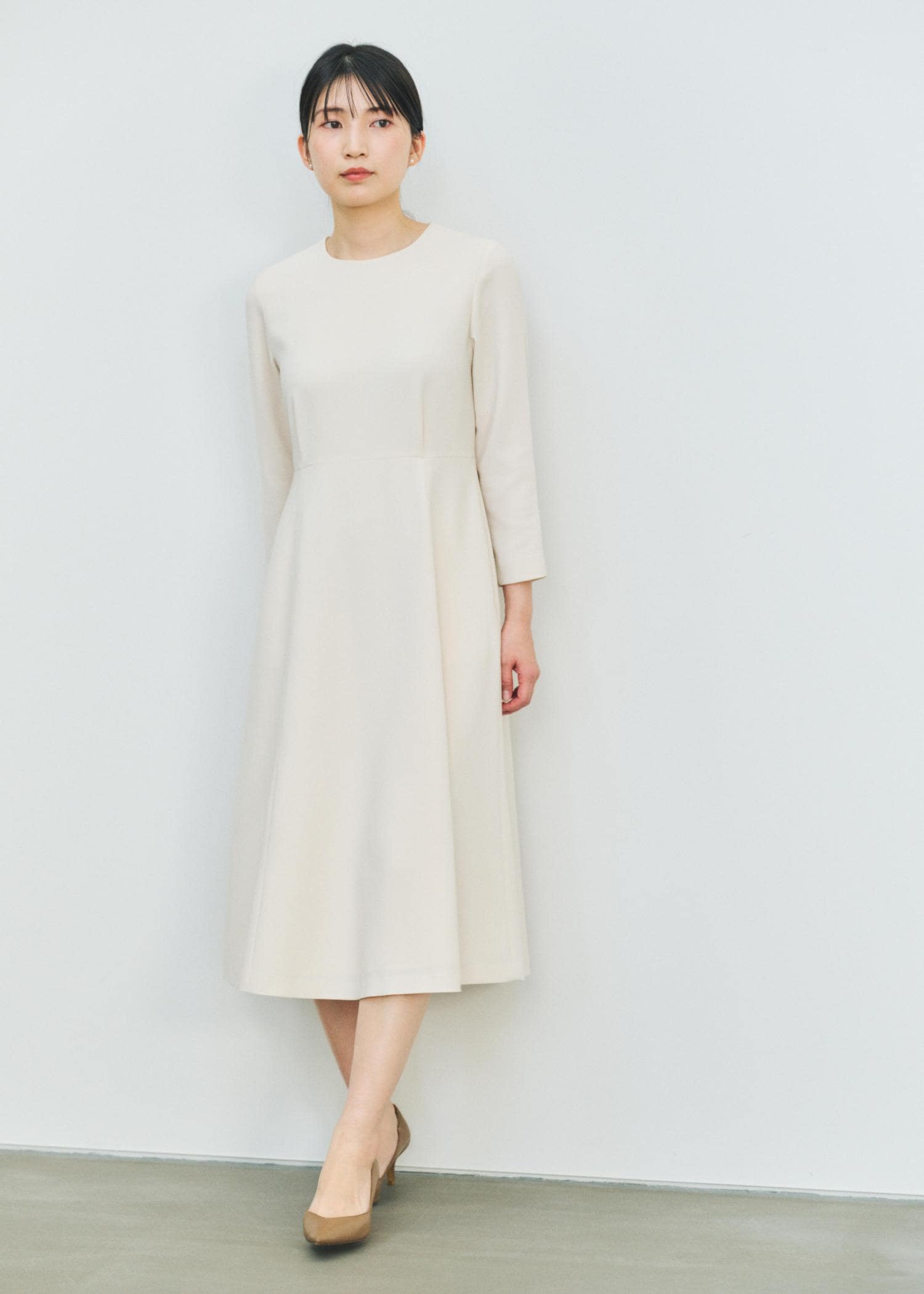 鎖骨の出ない開きのシンプルなクルーネックに、ウエストが程よく絞られ、裾にかけて緩やかに広がるフレアシルエット。