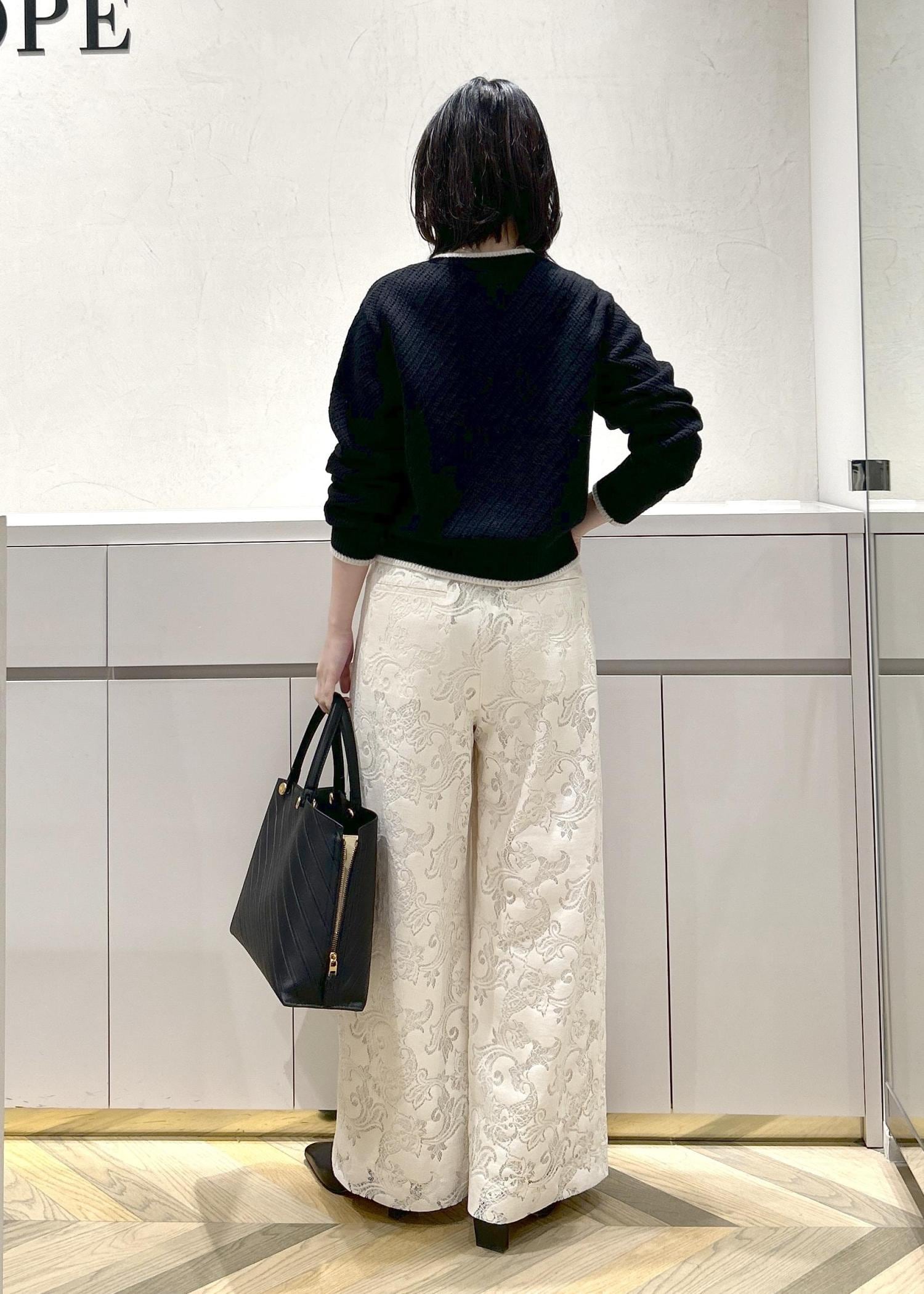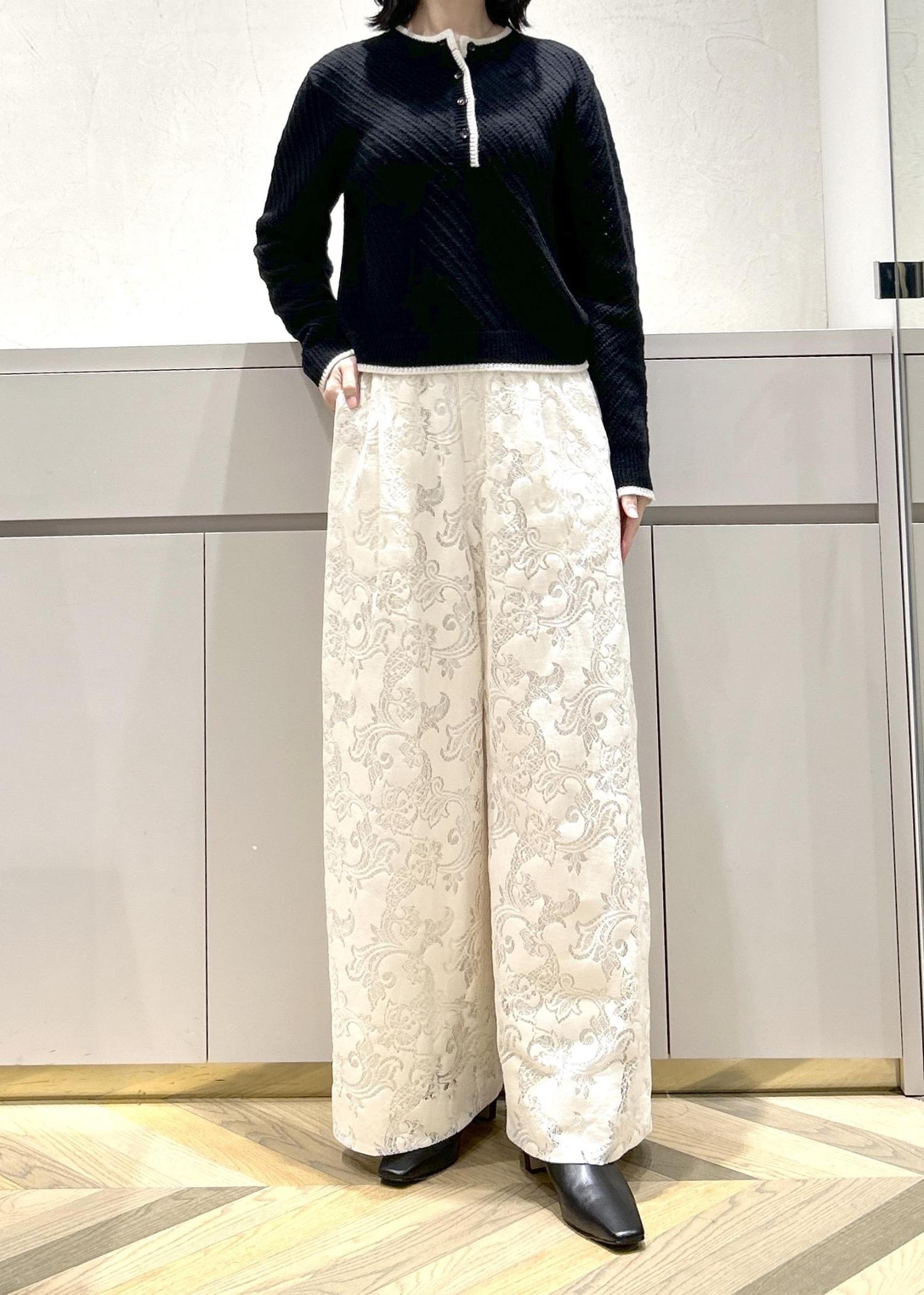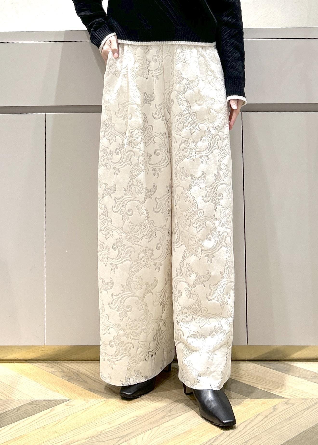ROPÉフラワーレースイージーパンツホワイト系 / F¥29,700レビュードロストなのでウエストは絞って調節していただけます。全体的にゆとりがありました。少しハイウエストでスタイルアップもして見えます。裏地がついているので透けは気にならなかったです。フラットシューズを履いて床ギリギリくらいの長さでした。