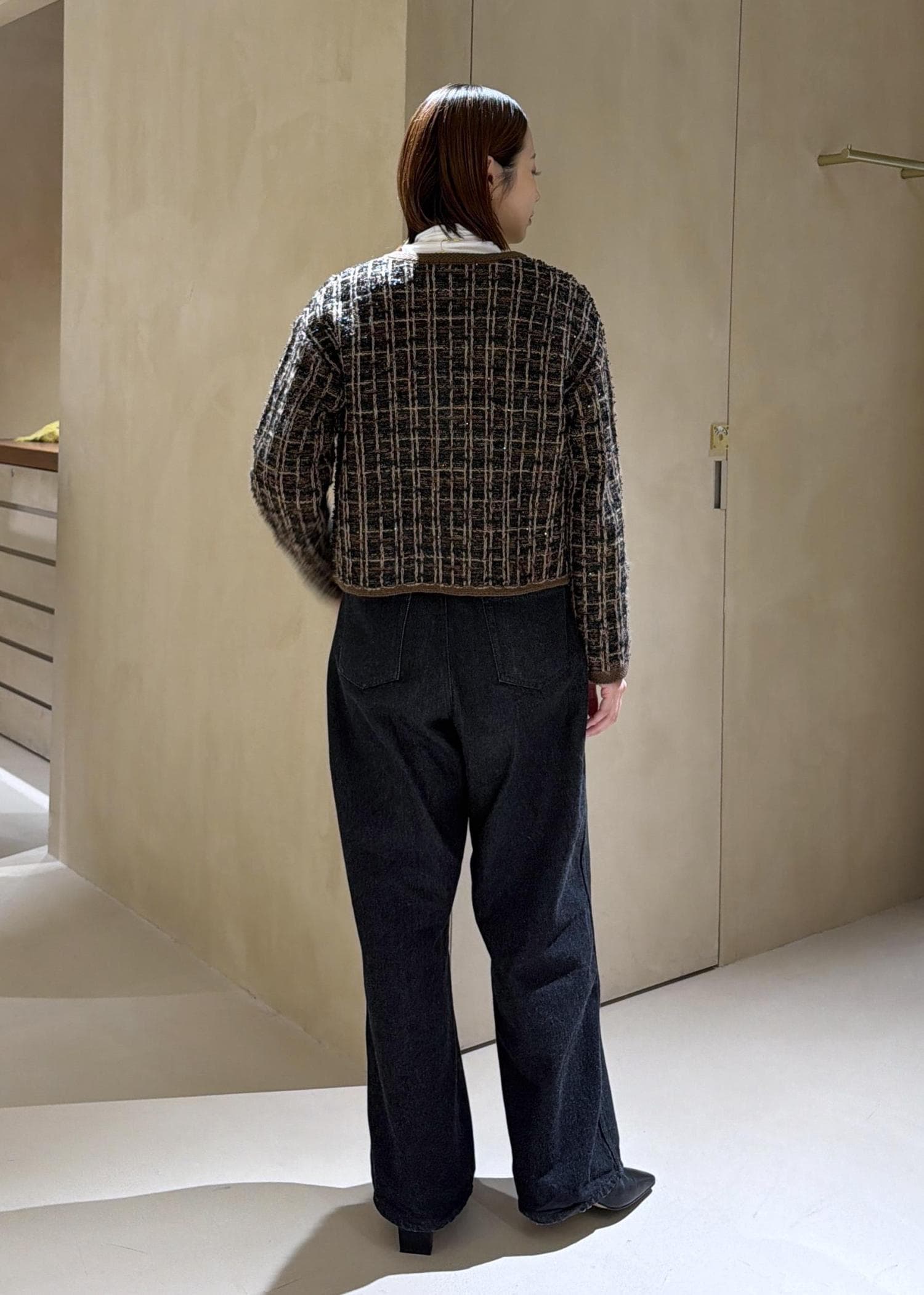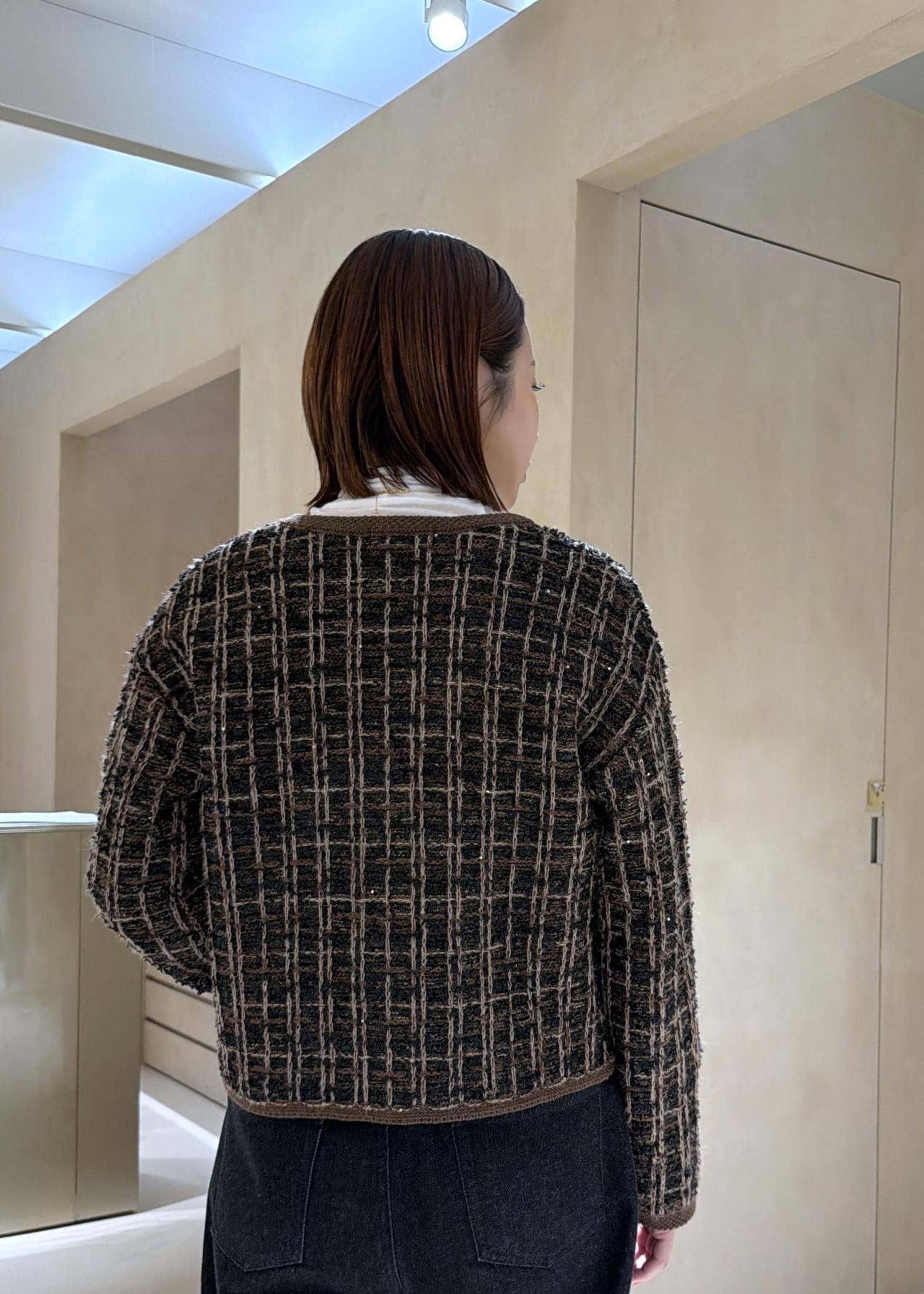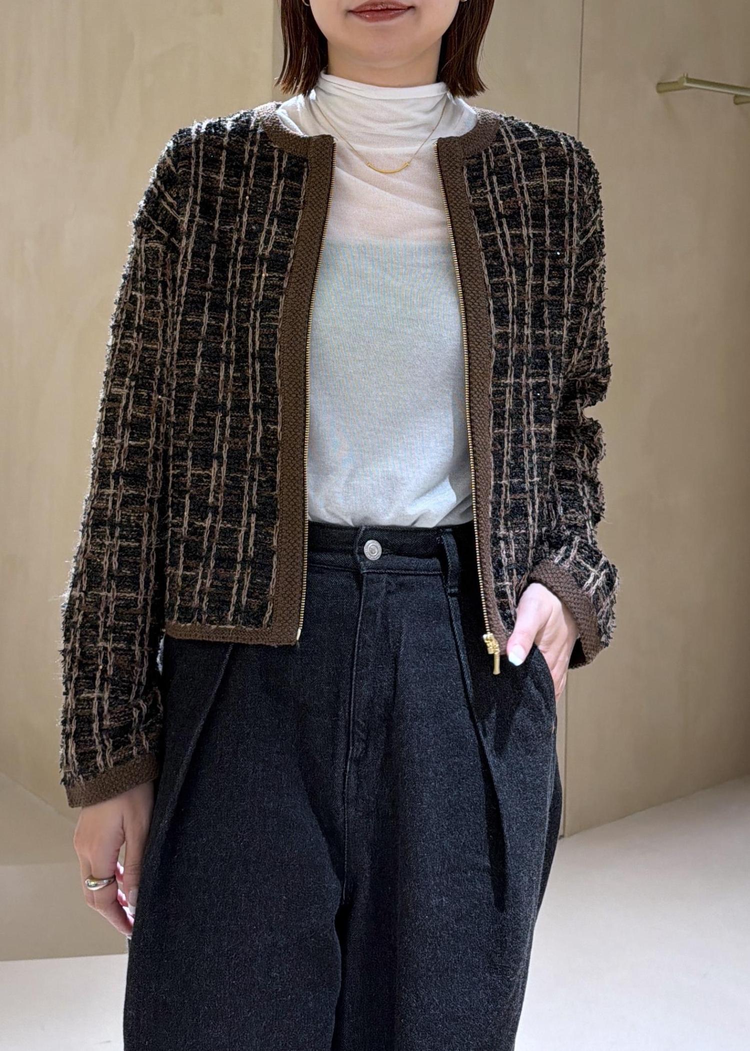 ROPÉツイードZIPノーカラーカーディガン/イージーケアブラウン / F¥25,300レビューブルゾンですがとても軽くカーディガン感覚で羽織ることができます。普段ツイードジャケットを羽織らない方にもおすすめしたいツイードブルゾンです!