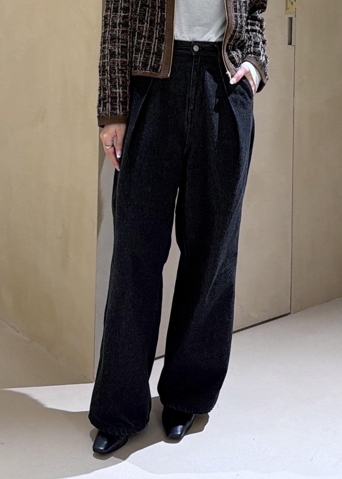 ROPÉ【洗える】ワンタック ワイドデニムパンツブラック / 38¥27,500レビュー161cmで38サイズを着用。