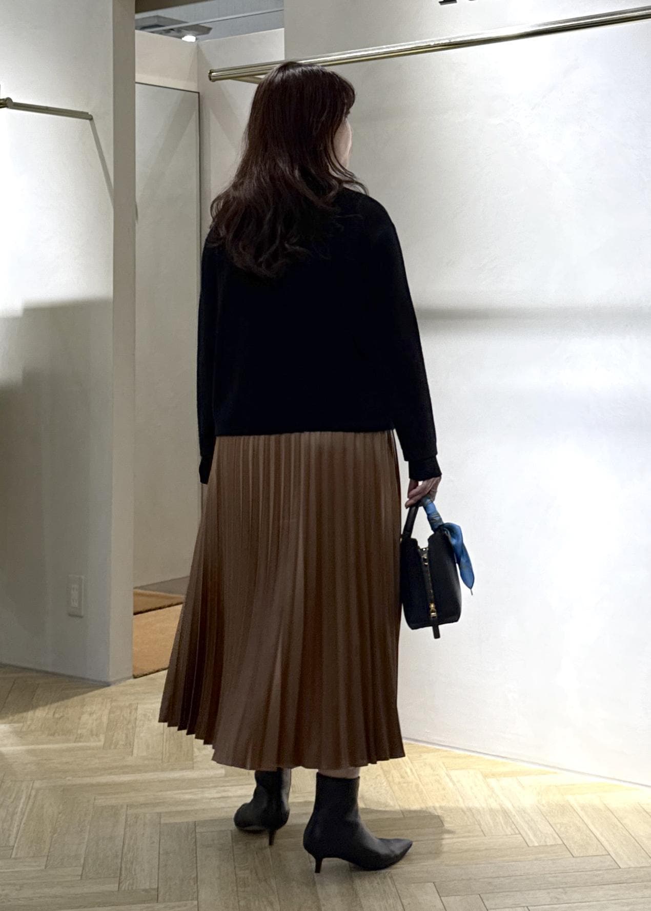 ツヤがレザー見えするようなシンプルながらも素材で遊べるスカート。ニットやスウェットなどこれからの時期に出番の多くなるトップスとの相性良いです◯