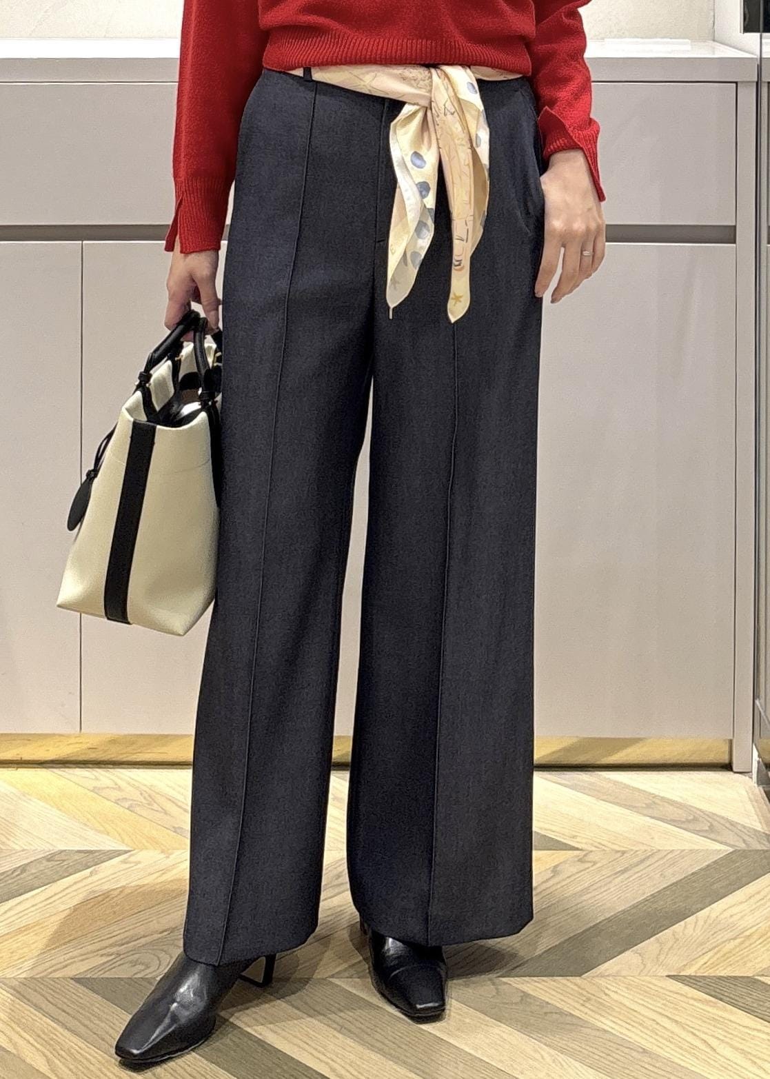 ROPÉ梳毛ギャバ プリーテッド ワイドパンツネイビー / 38¥29,700レビュータック無しのシルエットが綺麗なパンツ。ウール100%で暖かい着心地かつ、表面は起毛感無く肌あたりも滑らかです。程よく艶感もありシーズンの幅も広く合わせられると感じました。全体のサイズ感はジャスト。ウエストは後ろ側のみゴムで前側はぴしっと見え。骨盤が広めの体型ですが窮屈感は無く、着丈は私の身長でかかとから1cmほど上あたり。