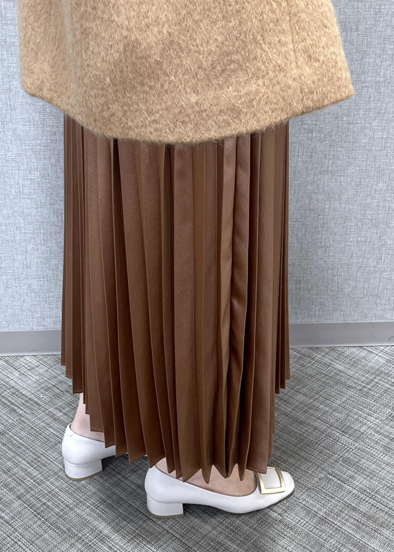 ROPÉシャイニープリーツスカート/イージーケアキャメル / F¥26,400レビューシルクのようなツヤ感があり、モノトーンコーデはもちろんカラーコーデにも活躍してくれるスカートです。ウエストは後ろゴムなので着脱しやすいです。