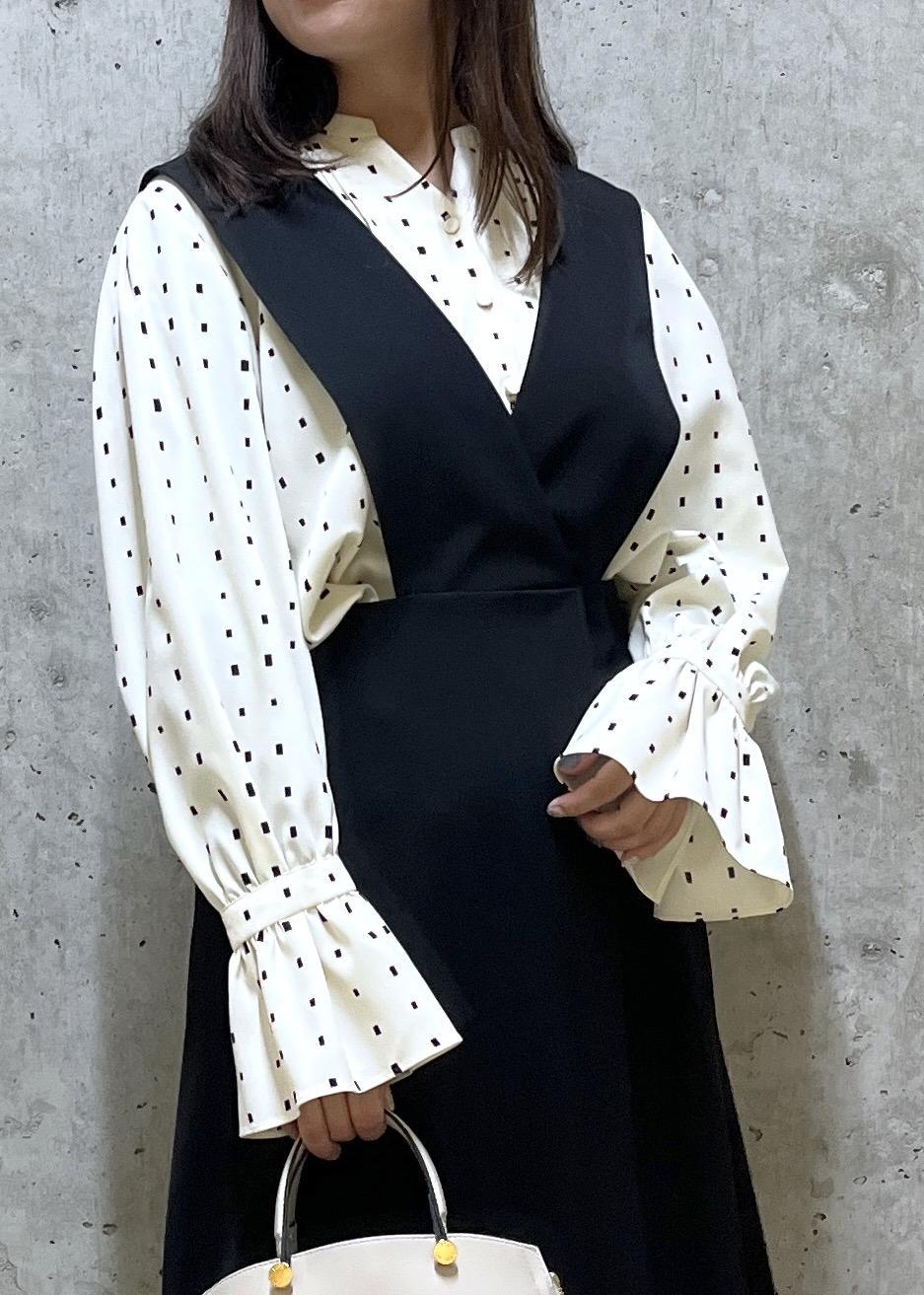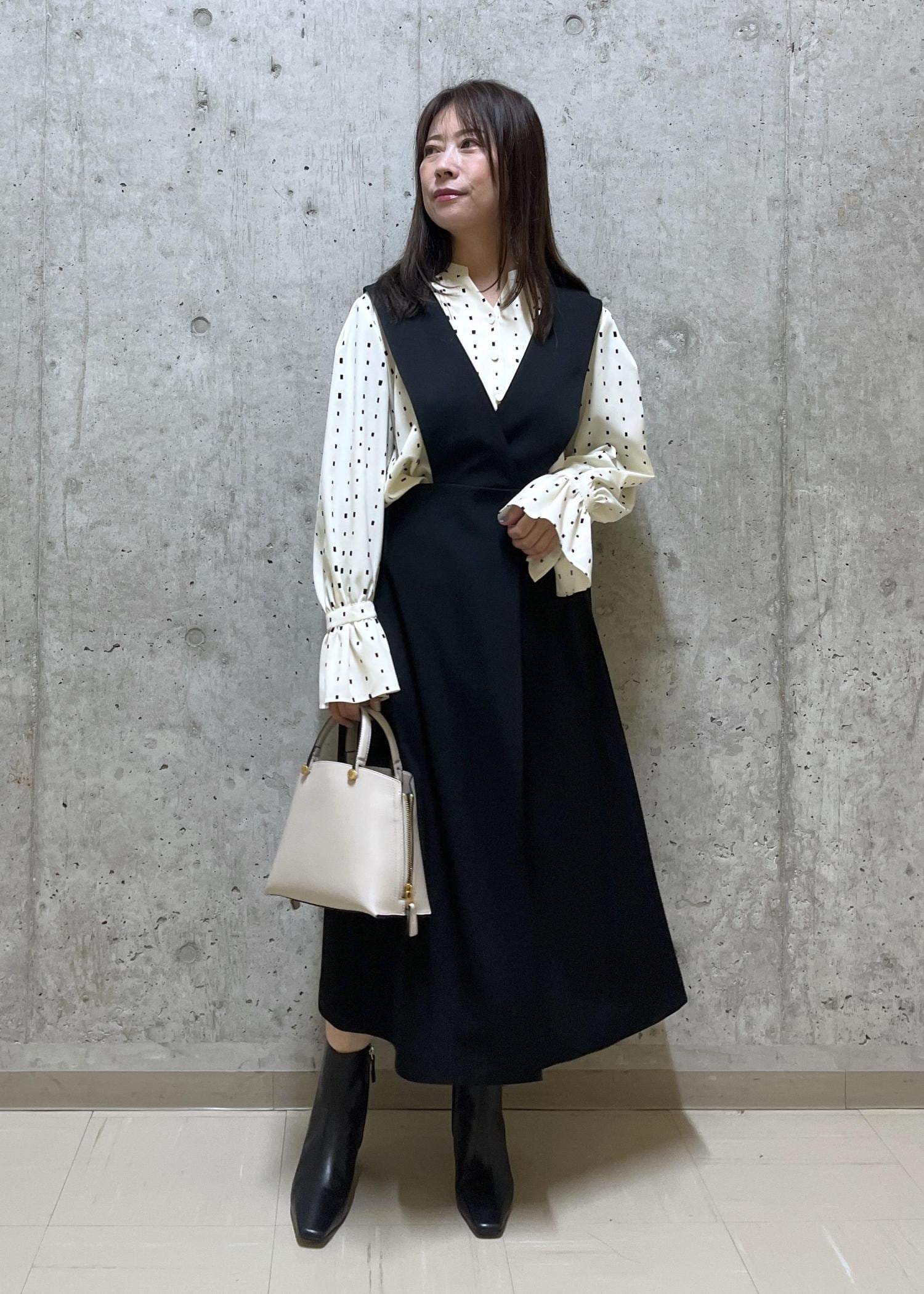 モノトーンの中にドットのブラウスを合わせて、可愛らしい雰囲気にしました。