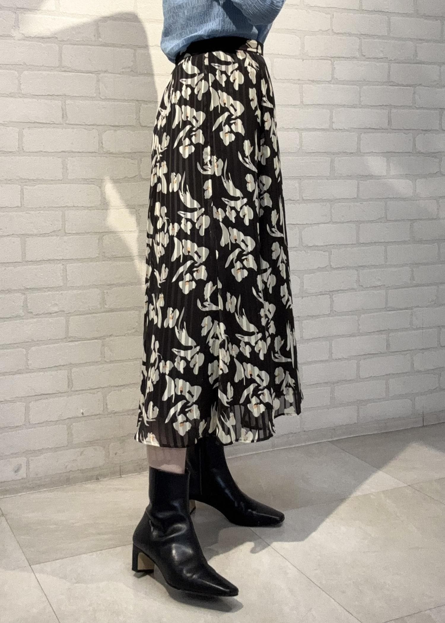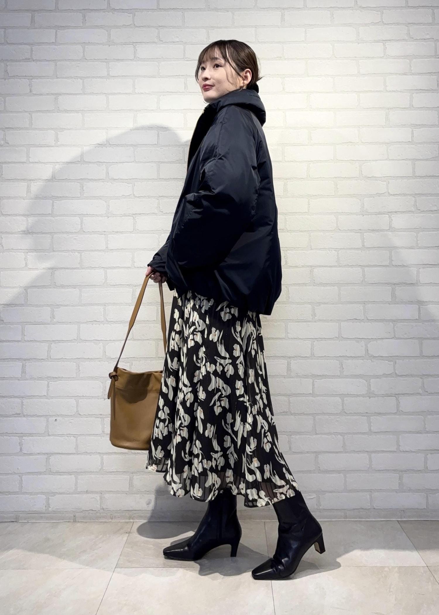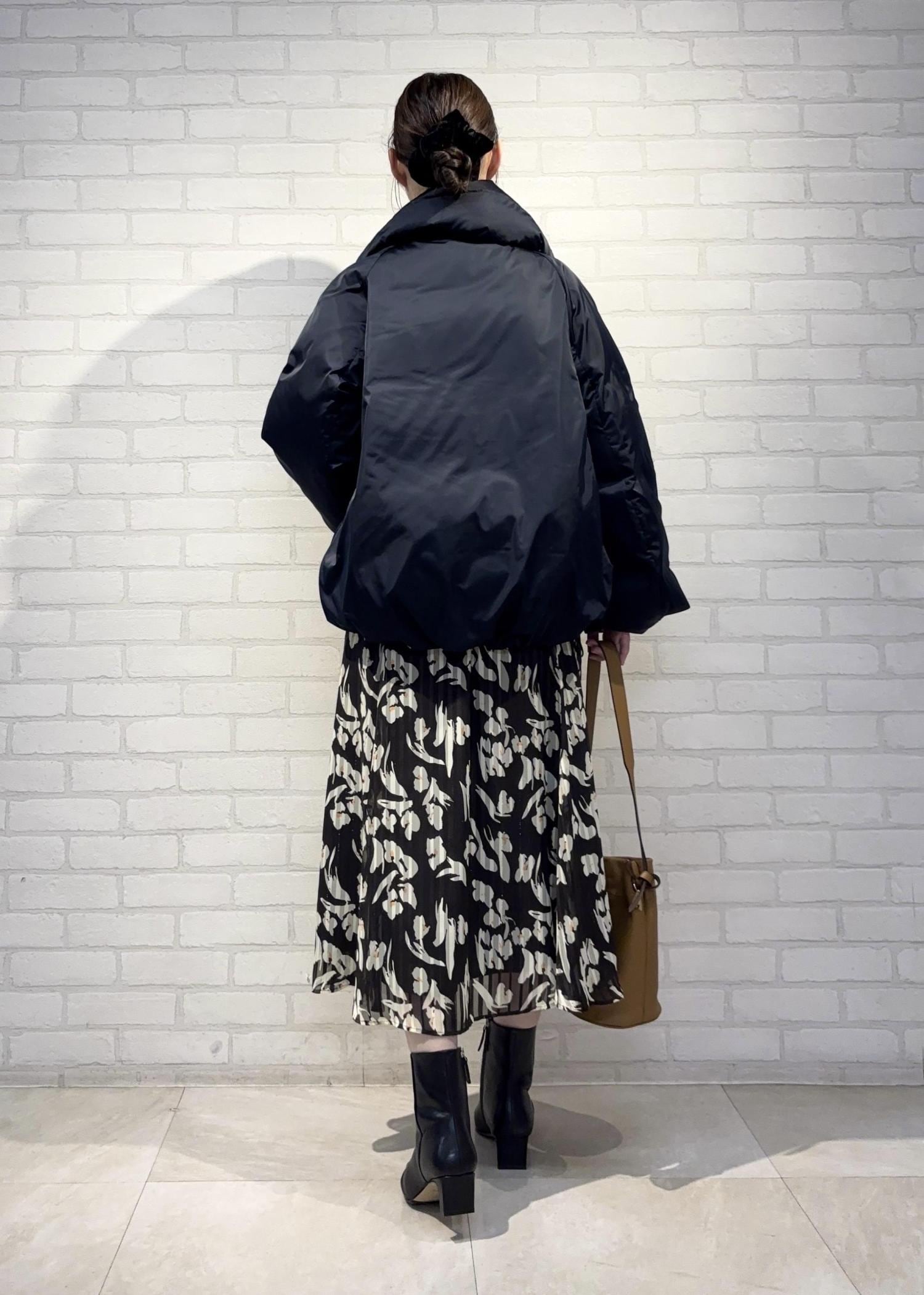 裾に向かってやや広がりのあるマーメイドシルエットです。着丈はふくらはぎにかかるくらいの長さなのでショートブーツとの合わせが素敵です◎