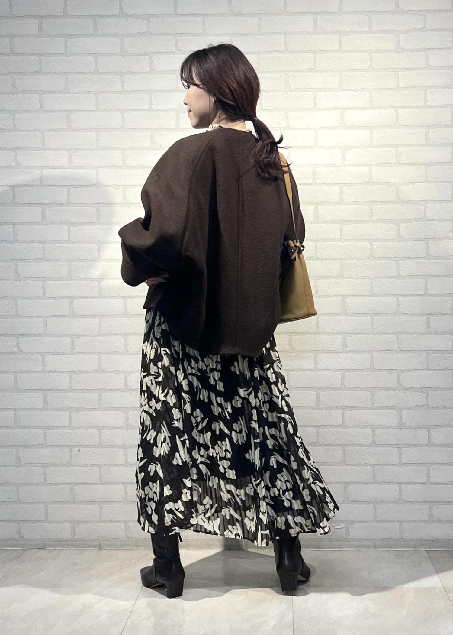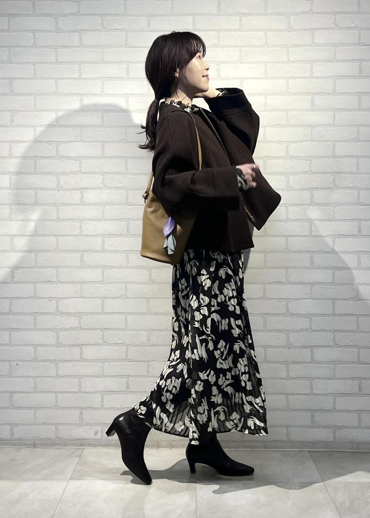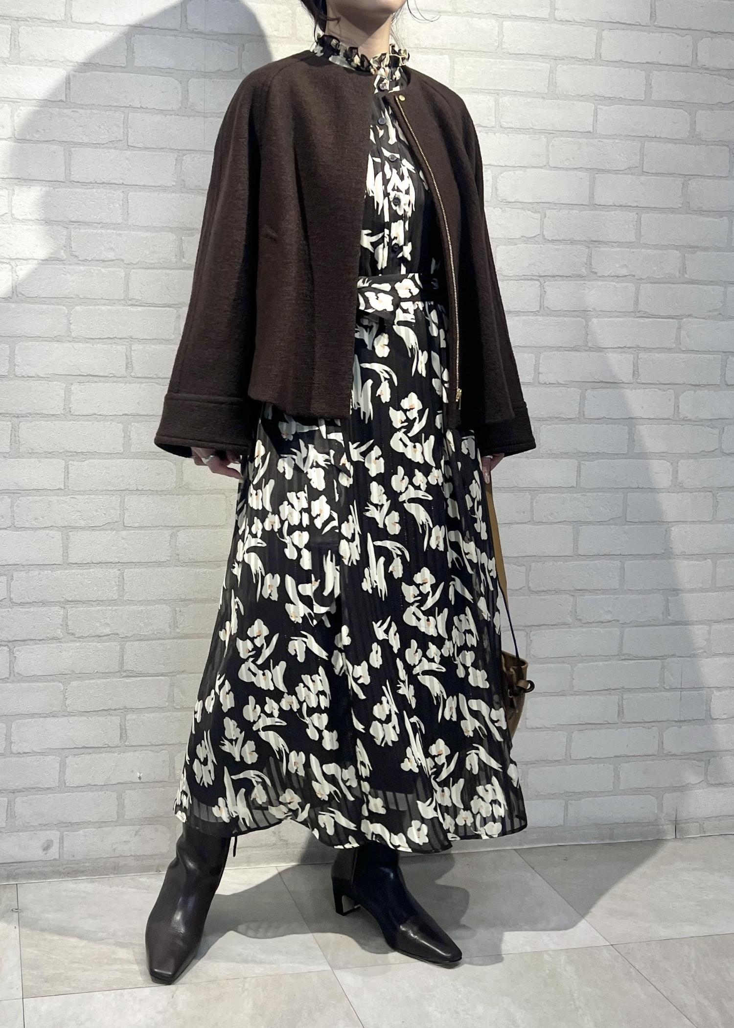 ROPÉフラワープリントタックワンピース/イージーケアダークブラウン系 / F¥47,300レビュー着丈はふくらはぎの半分までのミモレ丈。長すぎないので小柄な方でも大きくなりすぎずオススメ◎