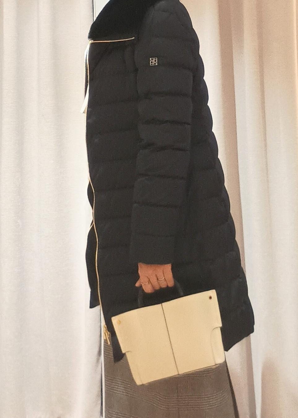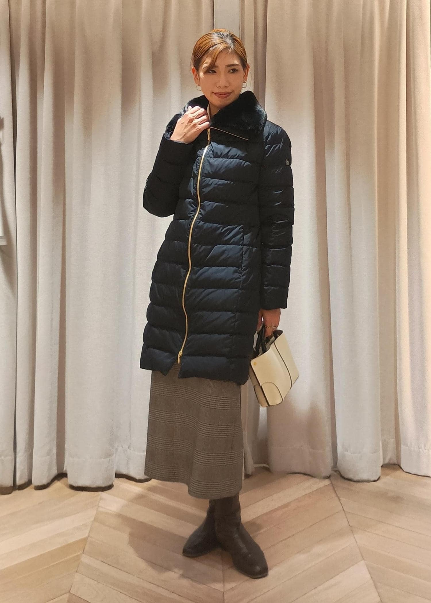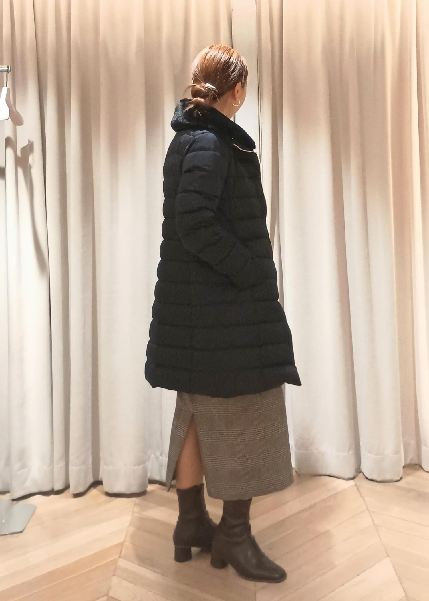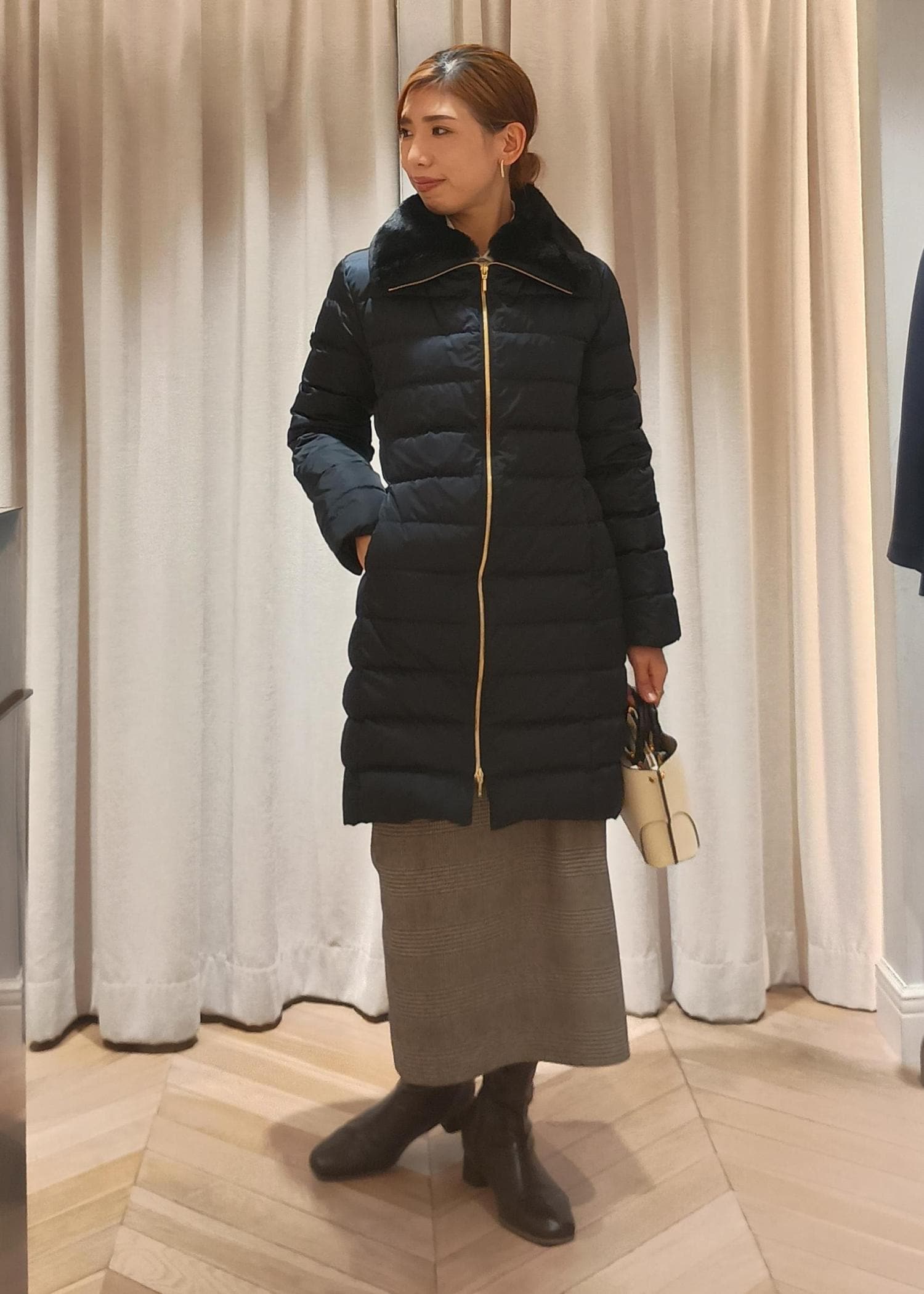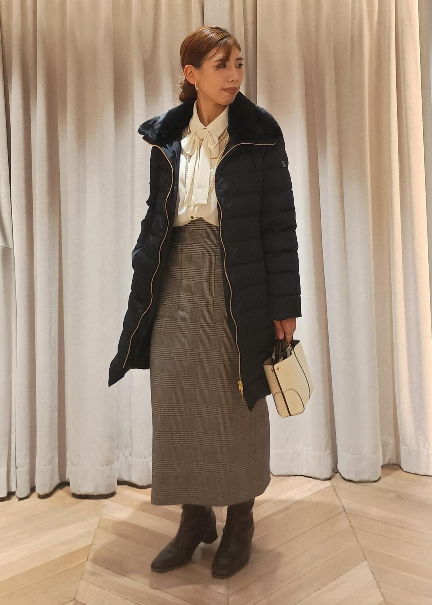 着膨れしないスッキリとしたシルエットのダウンコートを合わせたキレイめスタイル。通勤シーンにもオススメのスタイリングです。しっかり防寒もしつつキレイめに見せられる、オンでもオフでも使えるロングダウンはひとつあれば着回しを幅広く楽しめます!