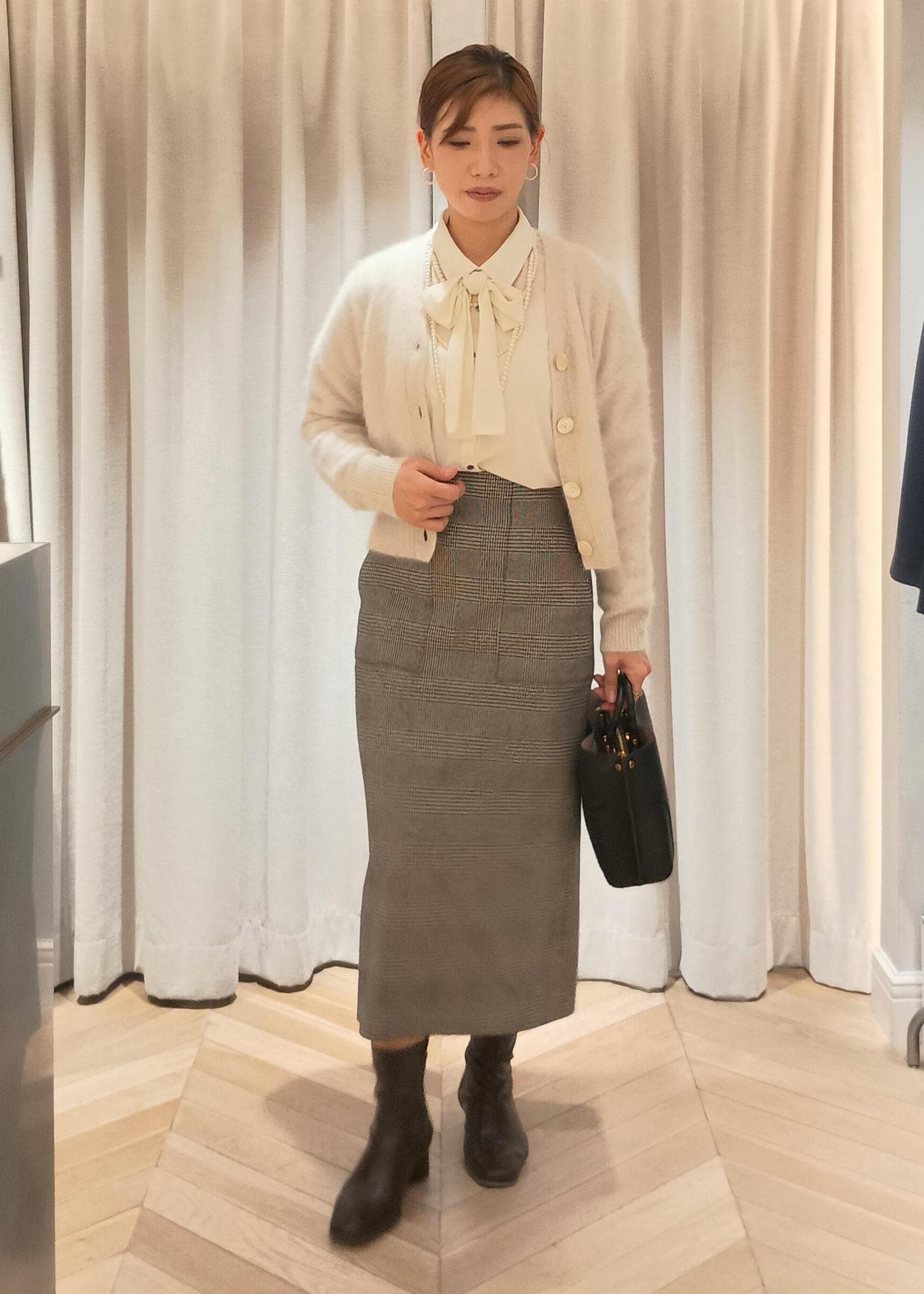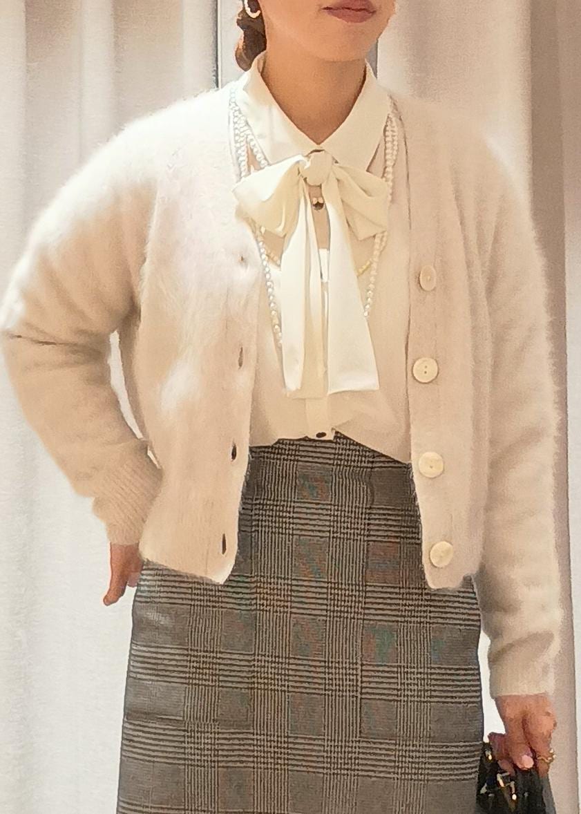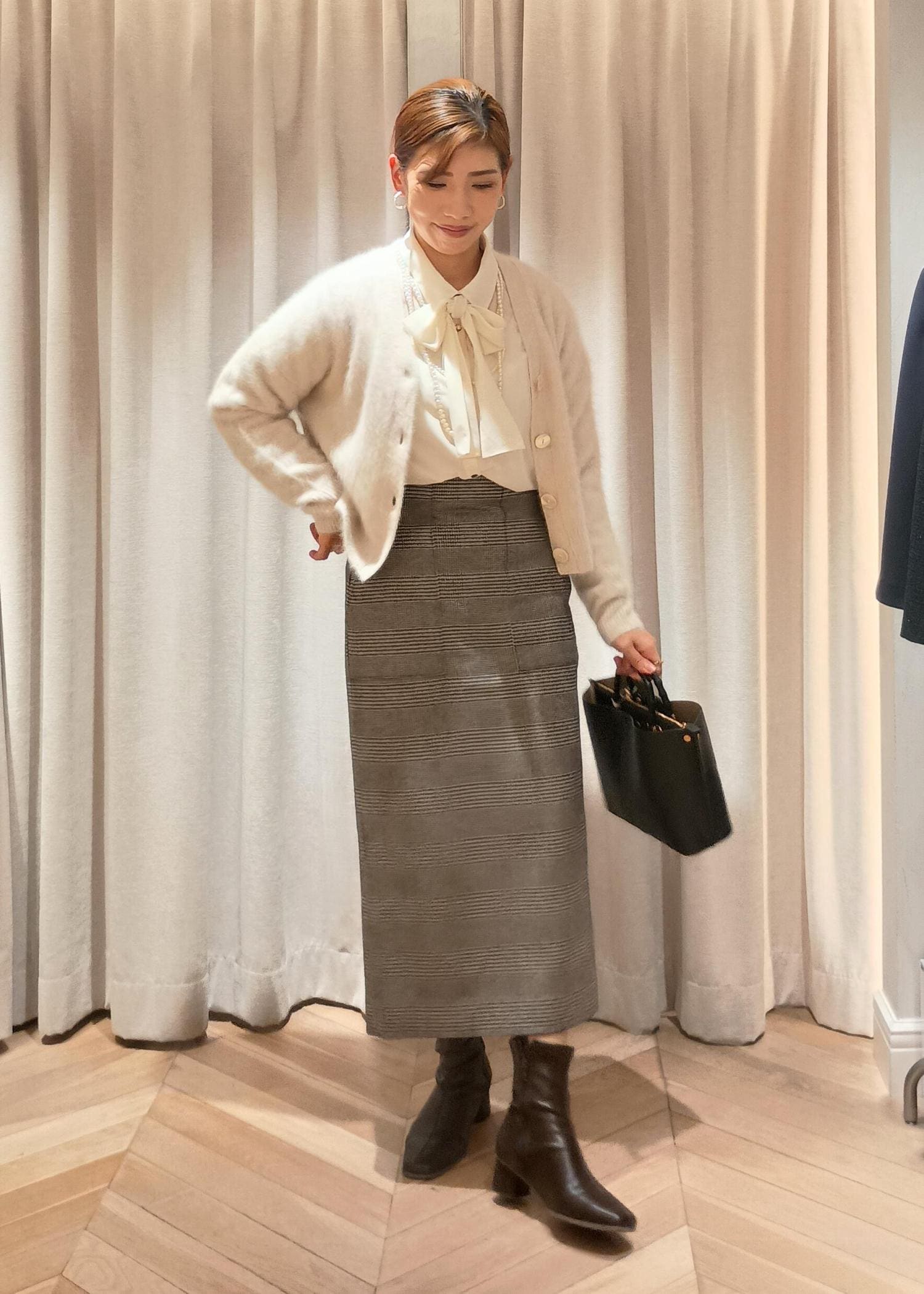 きちんと感があるオフィスシーンにぴったりなキレイめスタイルに、ふんわりとした素材感のカーディガンをプラスした、温かみを感じられるコーディネートです。