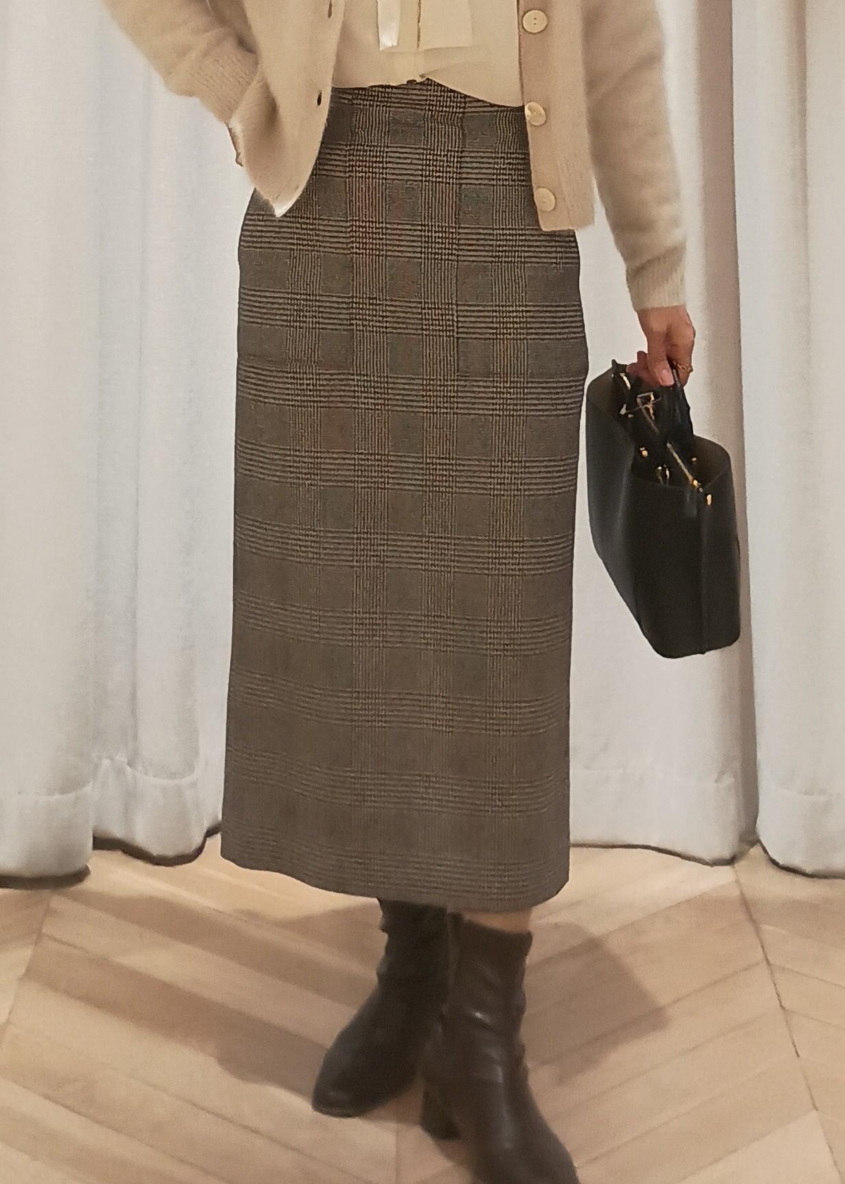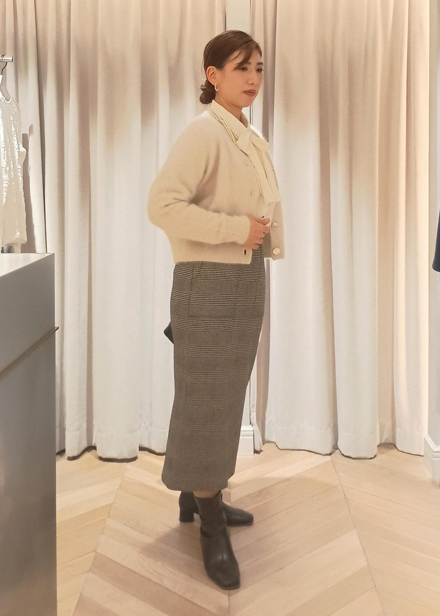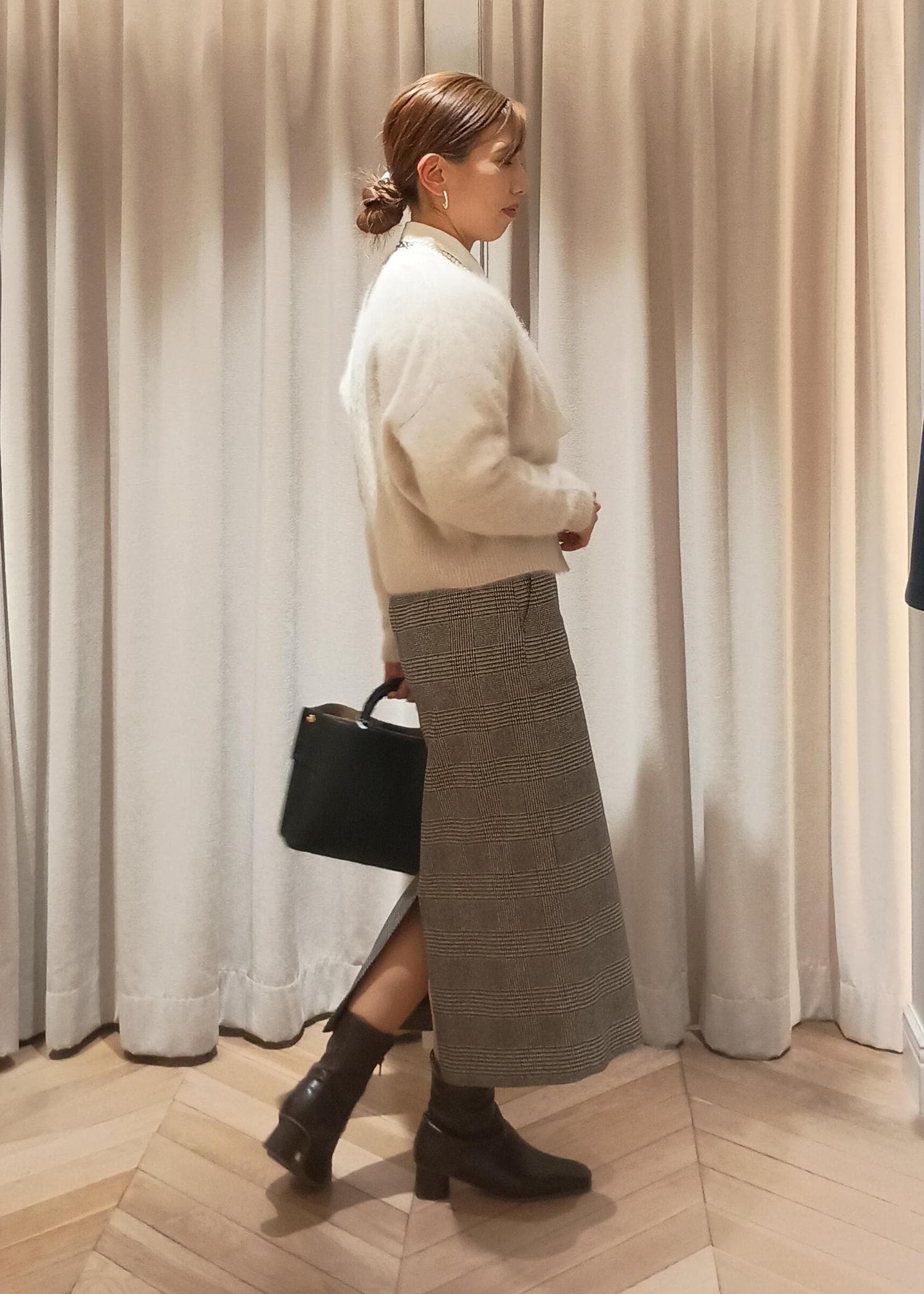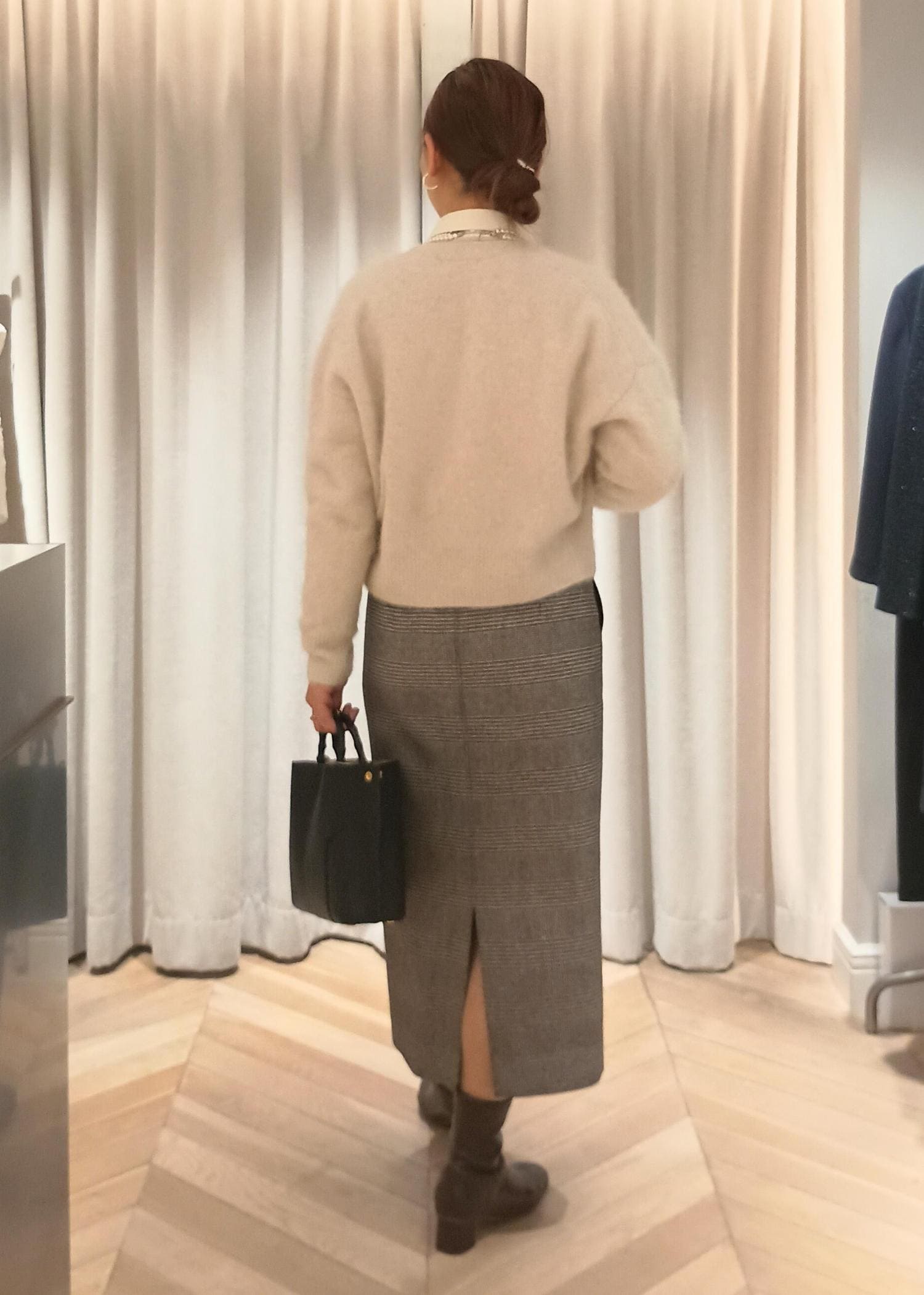 ROPÉ[美人スカート]ウールレーヨンポケット付きタイトスカート(ヘリンボーン/グレンチェック)/セットアップ対応ブラック系 / 38¥25,300レビューウエスト位置が高く見え脚長効果も期待できます。ウエストうしろにはゴムが入っているので、フィット感がありながらも窮屈さは感じにくいつくりです。ヒップ周りも肉感を拾いにくいキレイめシルエット。バックスリットが膝上まで入っているので足捌き良く動きやすく通勤シーンなどにもオススメです。