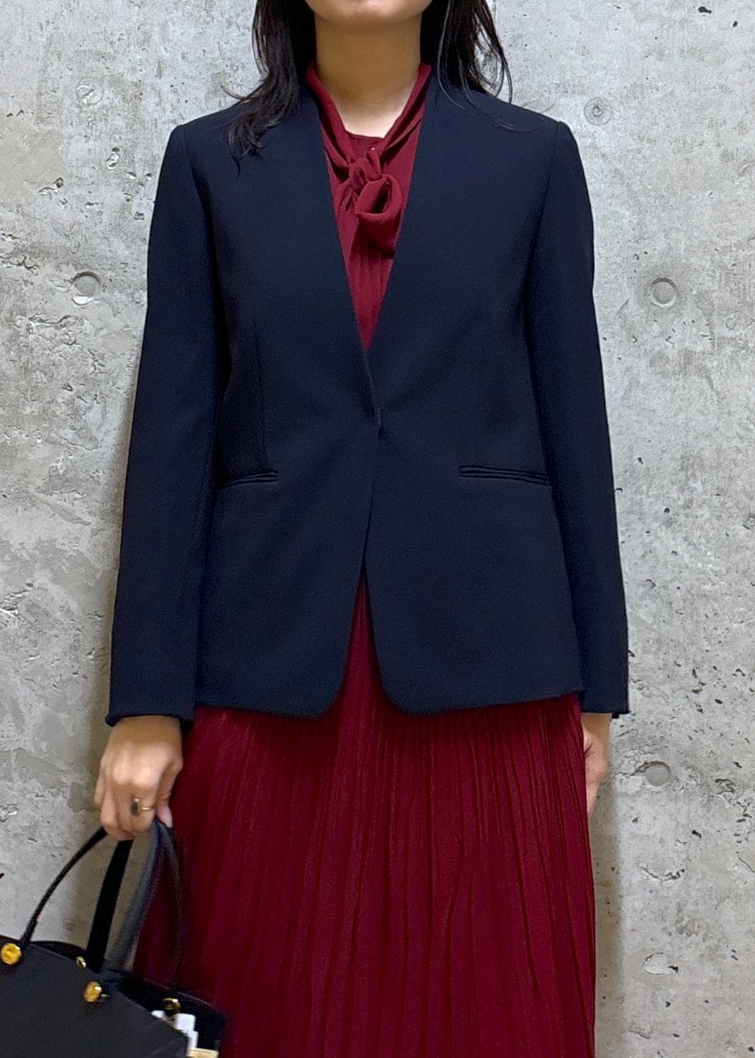 落ち感のあるボウタイが品よく顔まわりを華やかに見せてくれます。