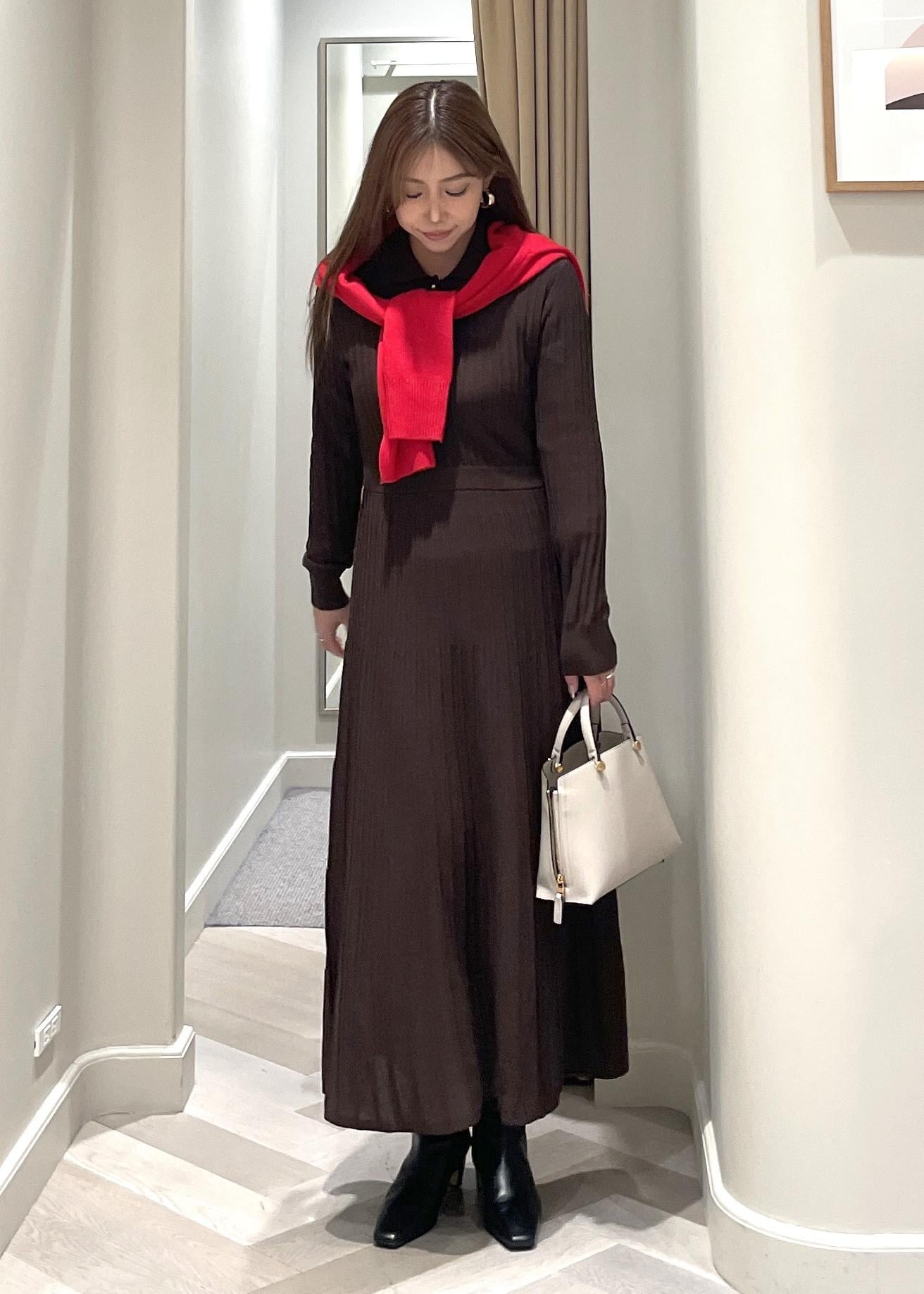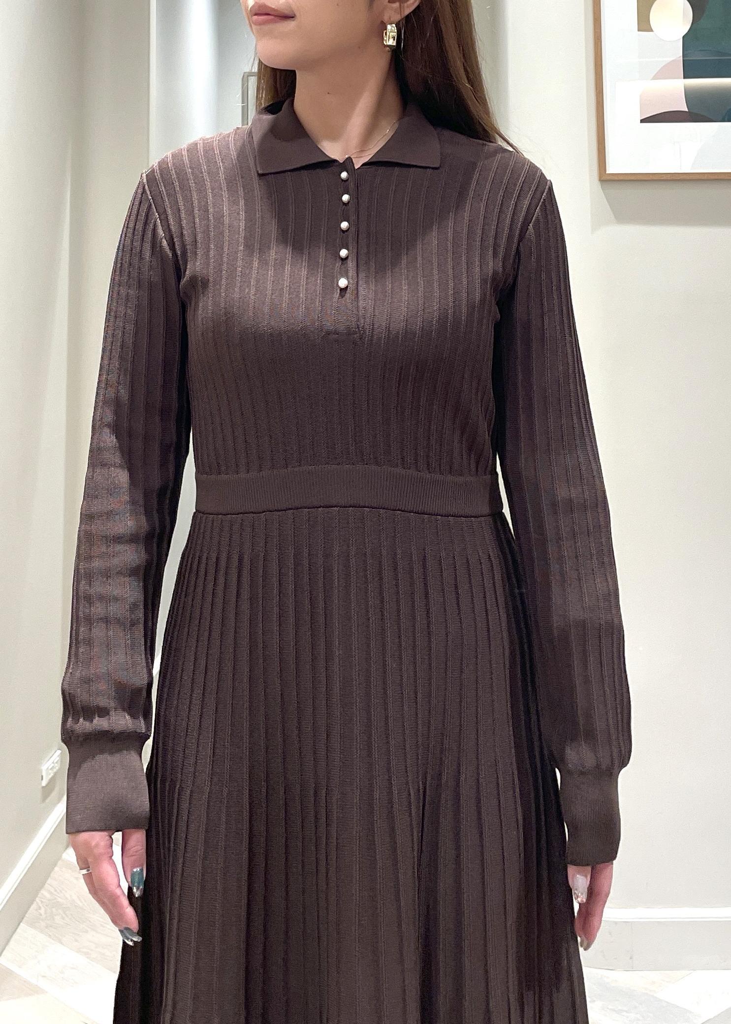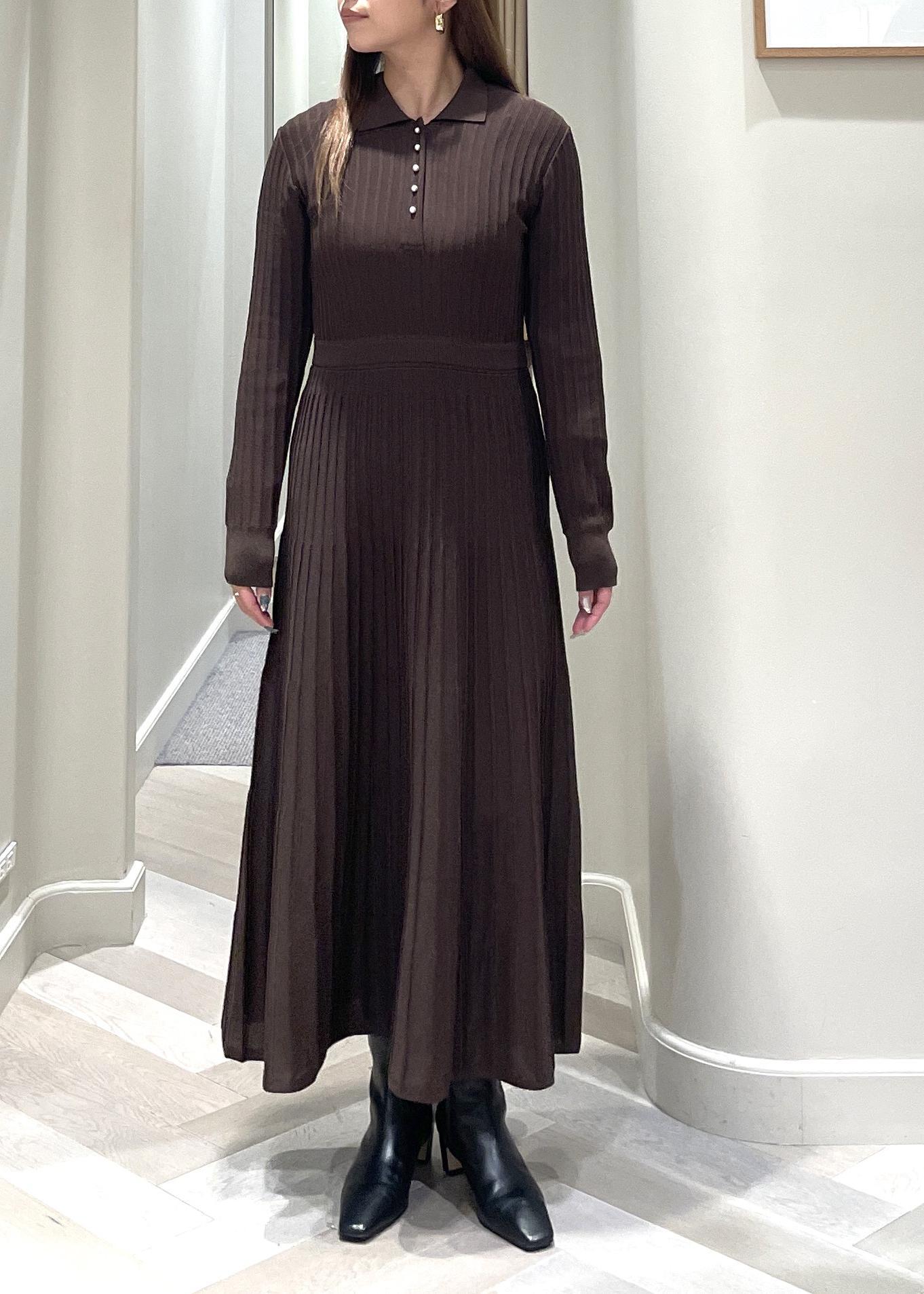 ROPÉパールボタンポロニットワンピース/イージーケアダークブラウン系 / F¥35,200レビュー丈感は160cmが着用で、足首から5cm上くらい。