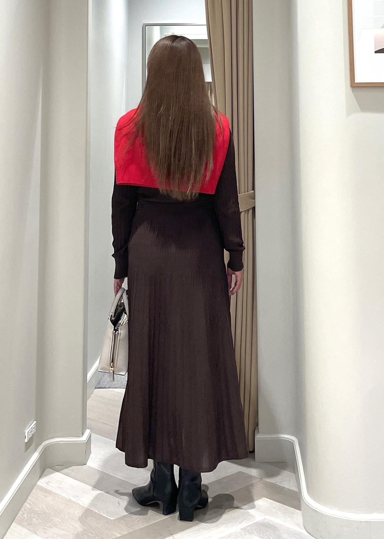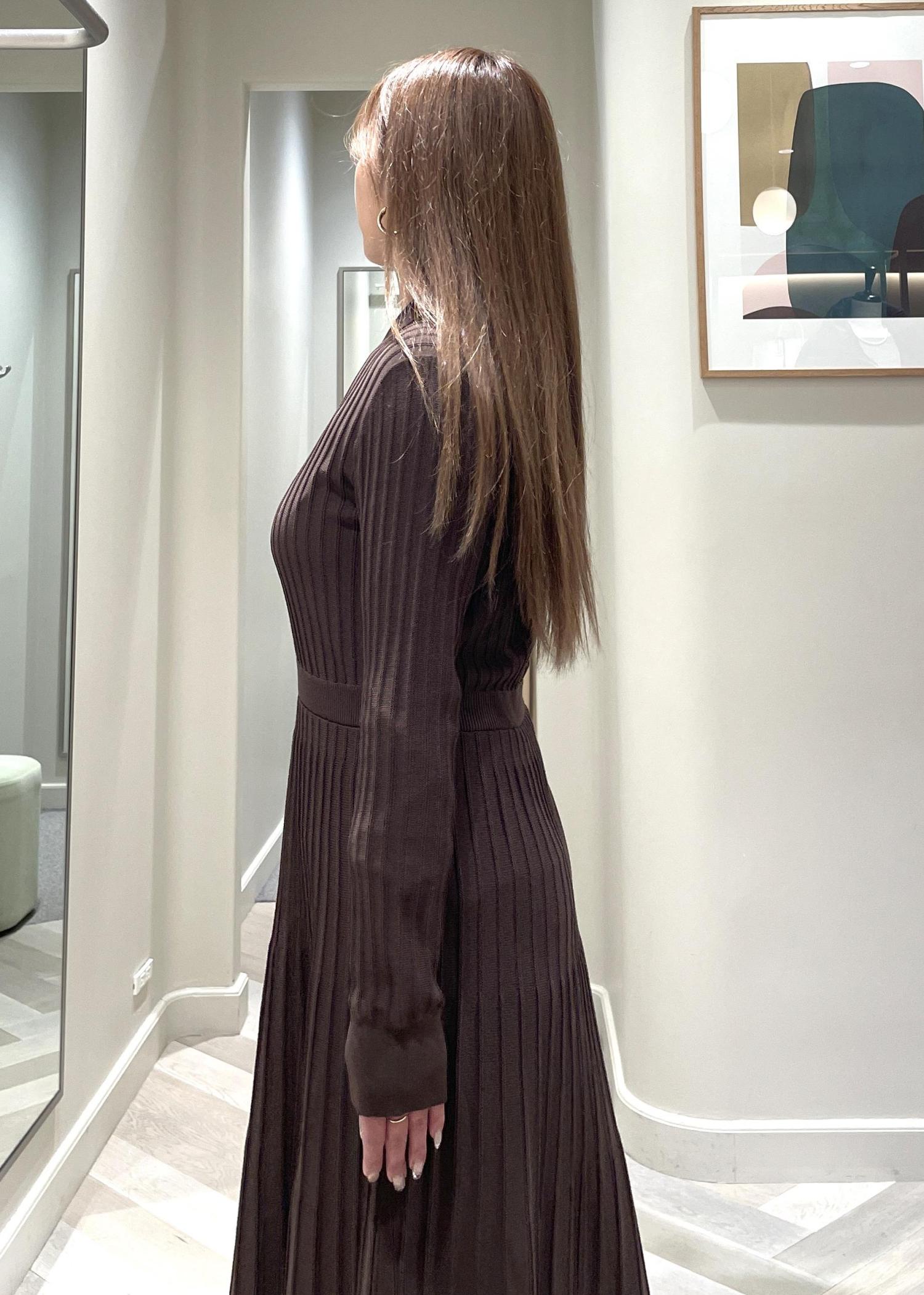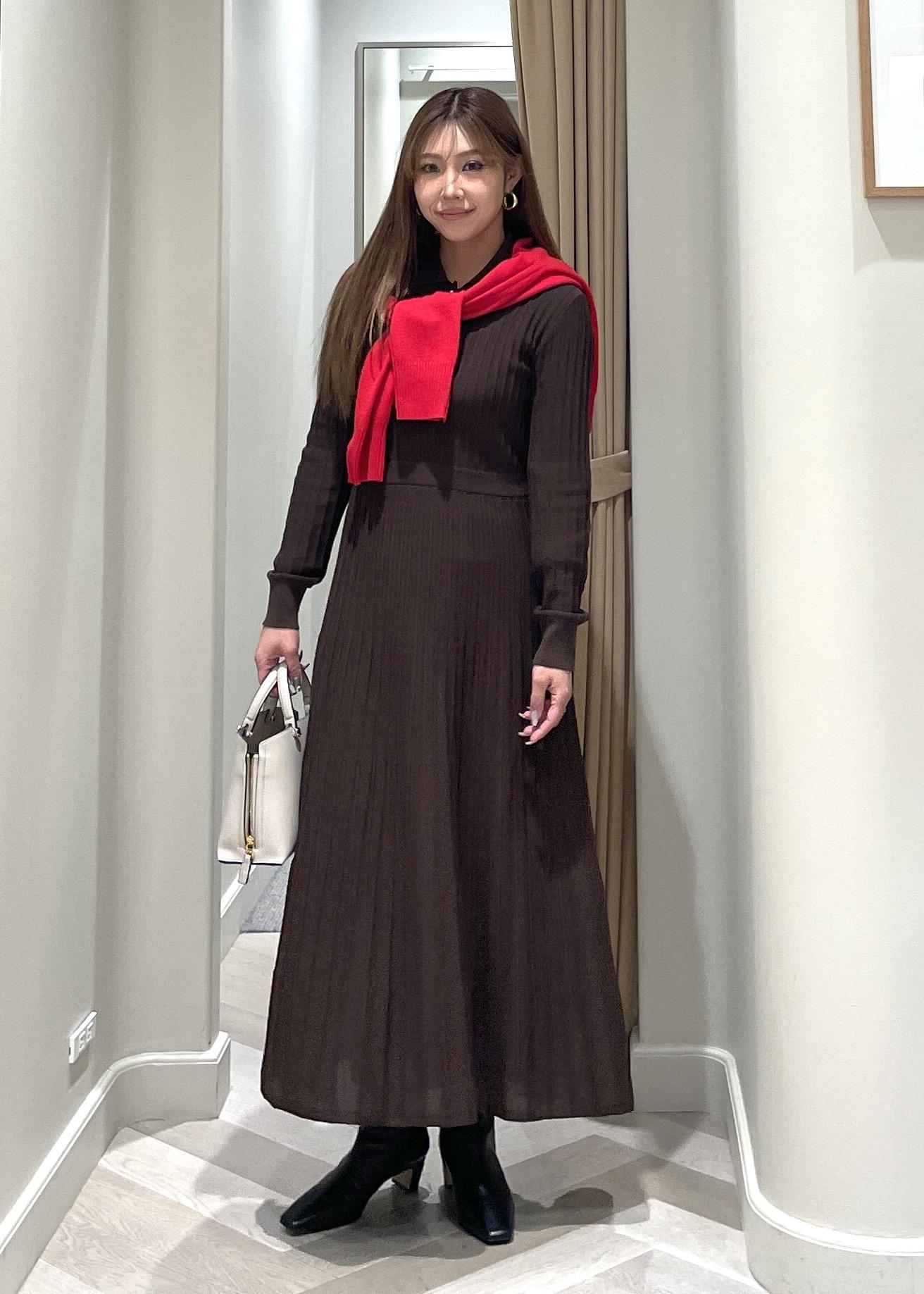 ROPÉパールボタンポロニットワンピース/イージーケアダークブラウン系 / F¥35,200レビュー丈感は160cmが着用で、足首から5cm上くらい。
