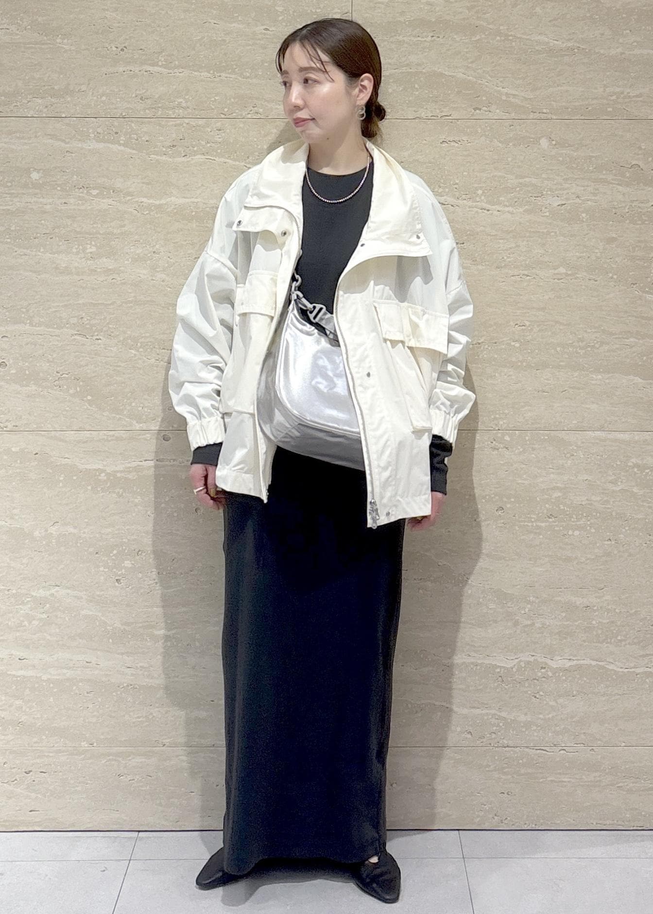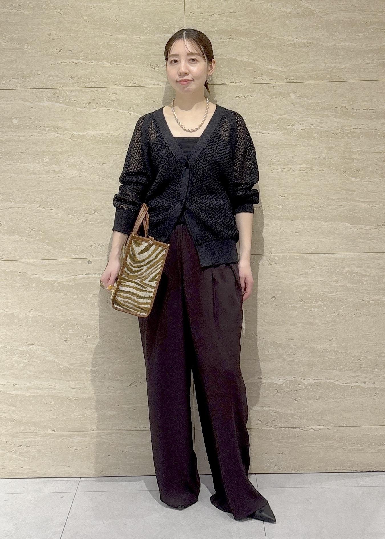 ワイドパンツのグレーカラーとグレーバッグで全体を柔らかくまとめたコーデです◎