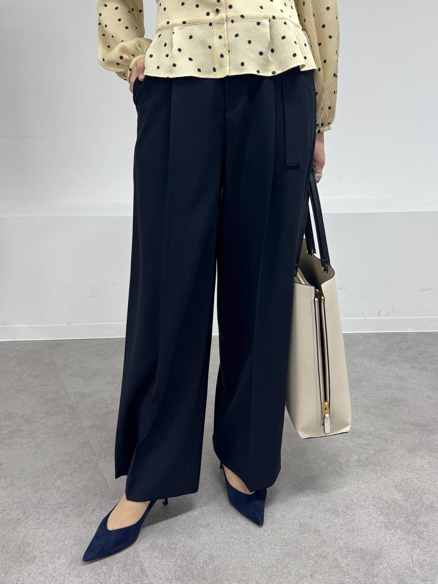 ROPÉノンミュールジングウール ストレートワイドパンツ/セットアップ対応ネイビー / 38¥27,500レビュータック入りのきれいめストレートパンツ。