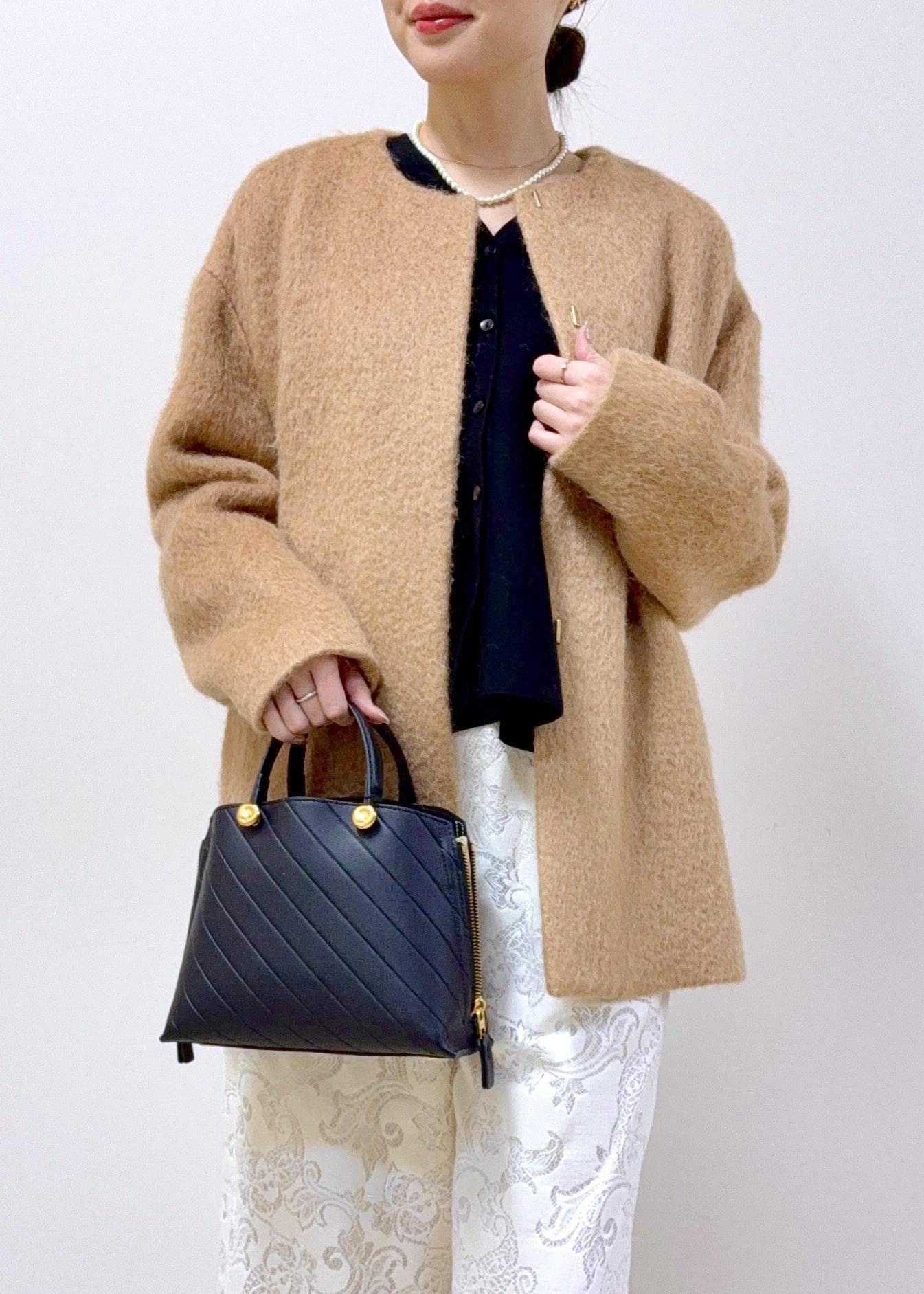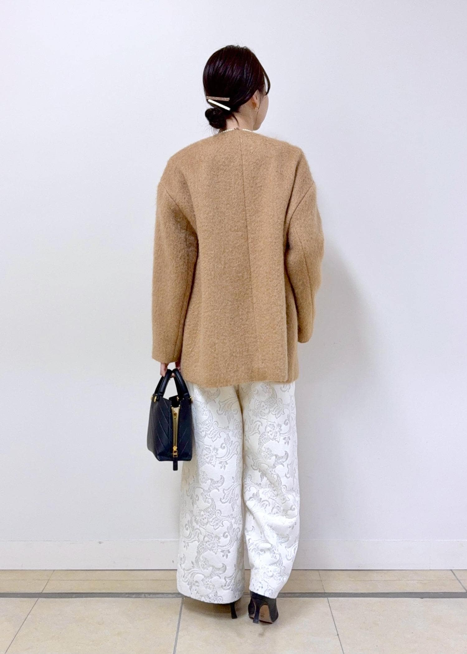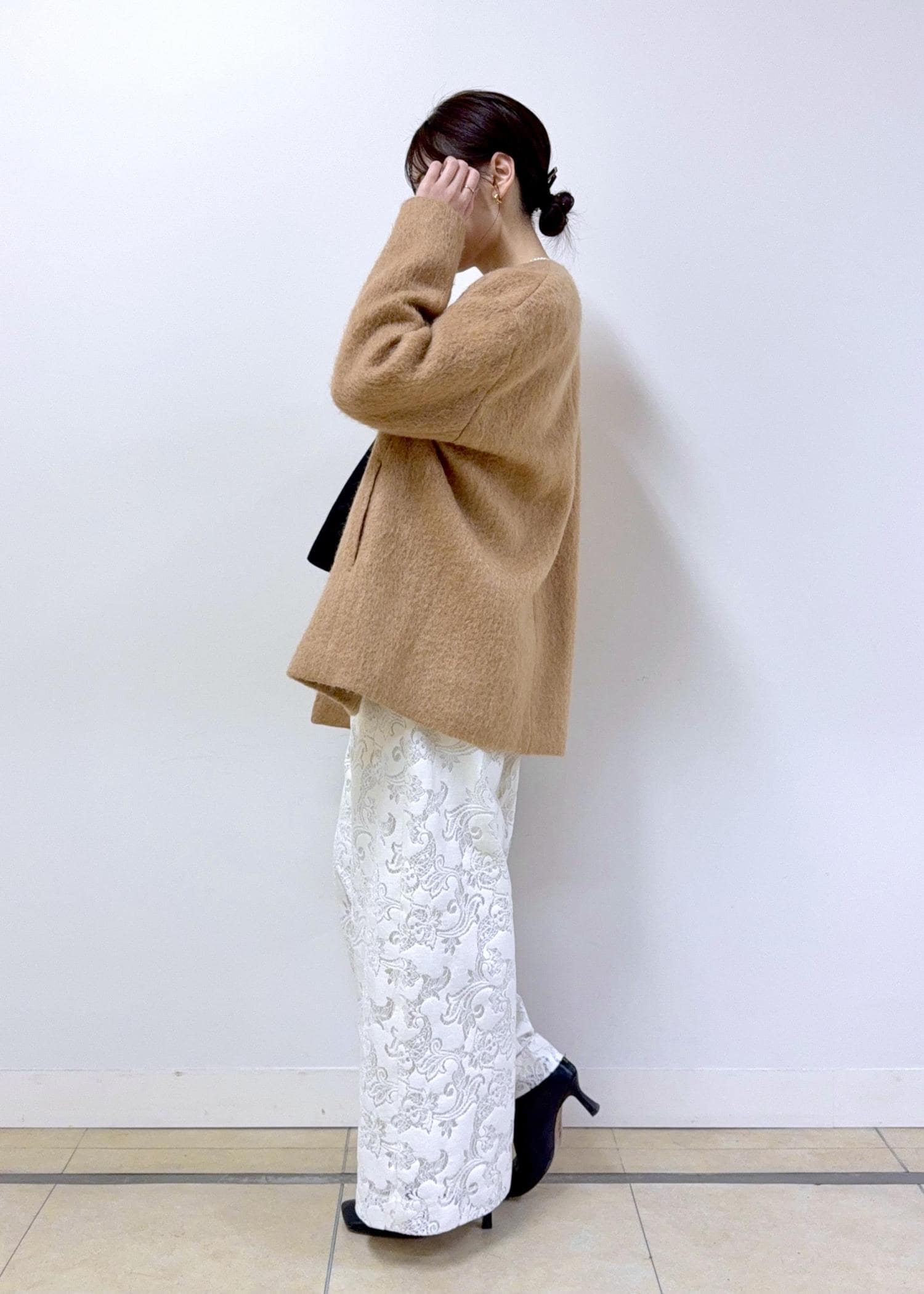 ふわっとしたモヘヤのアウターにレースのパンツを合わせてエレガントなスタイリングに♡