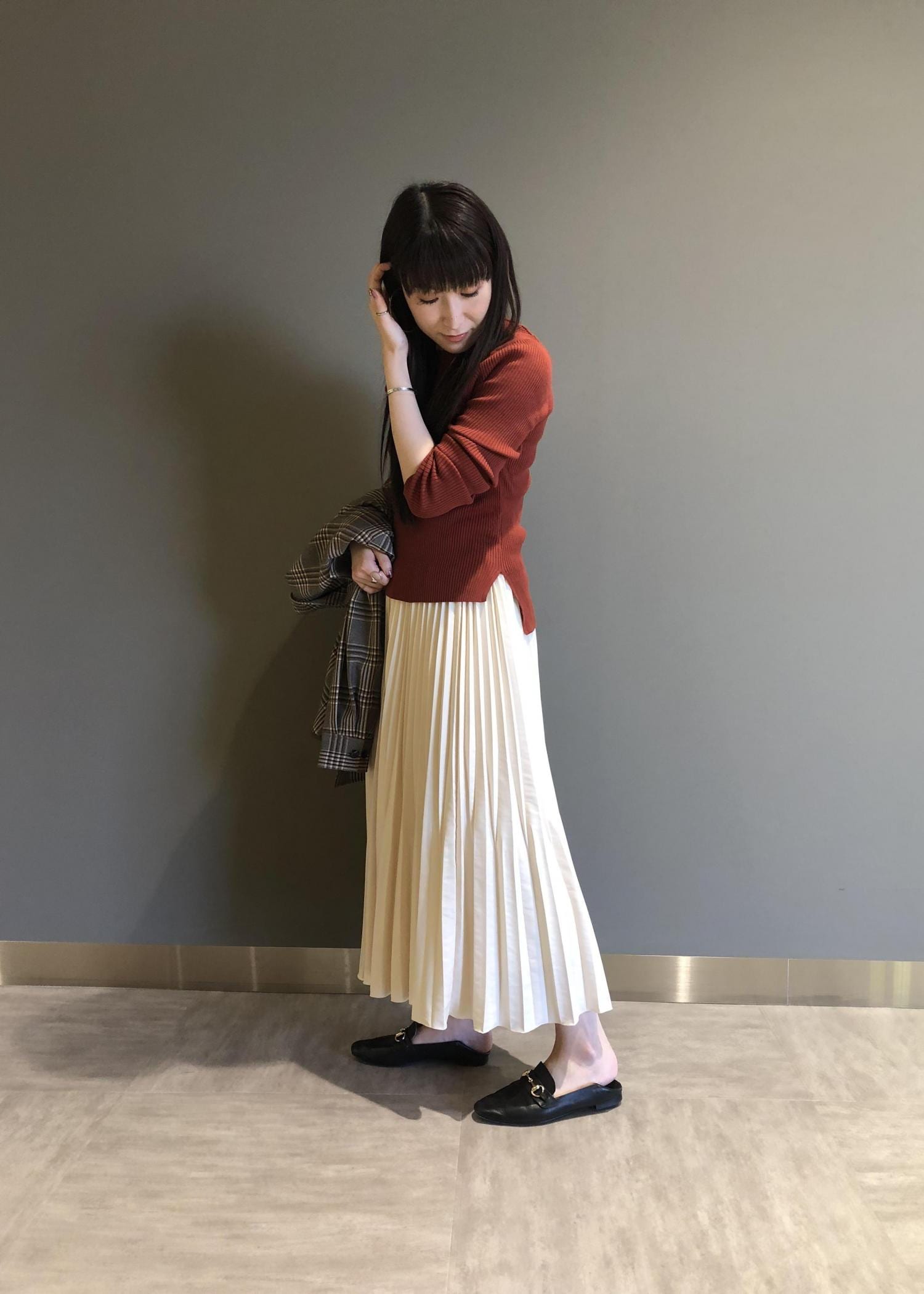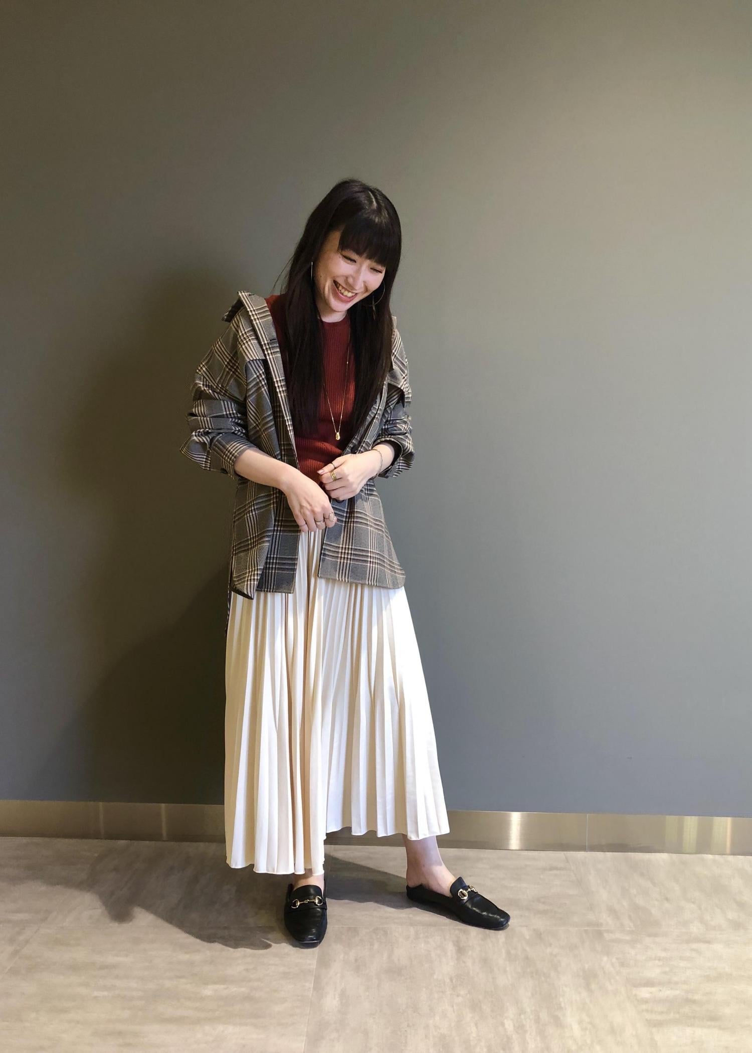 深みのあるカラーは白のボトムに合わせても秋らしさがあります。