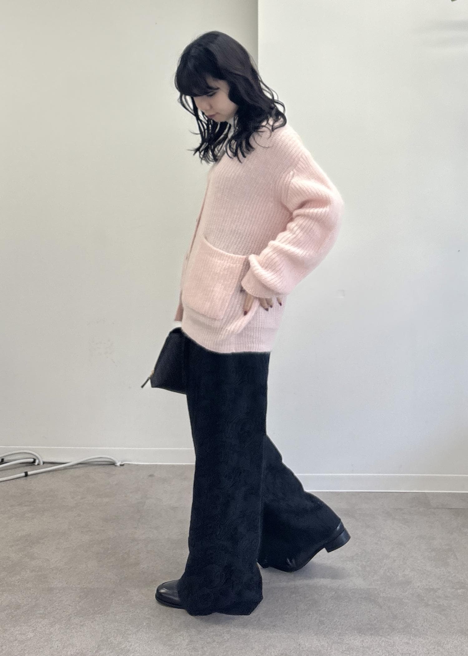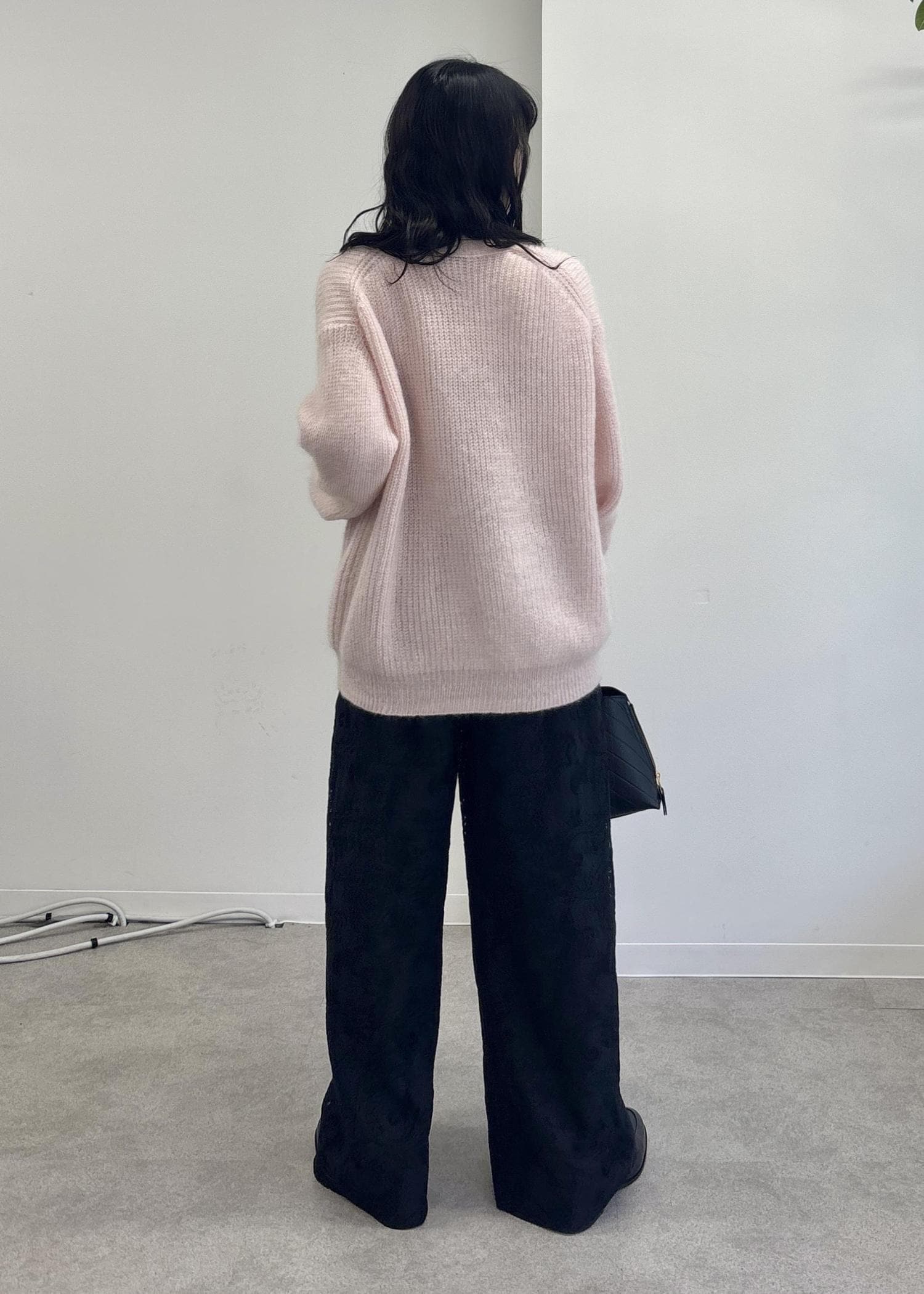 ふんわり感と優しいピンクカラーが可愛らしい印象のモヘアカーディガンに総レースのワイドパンツを合わせたコーディネート。