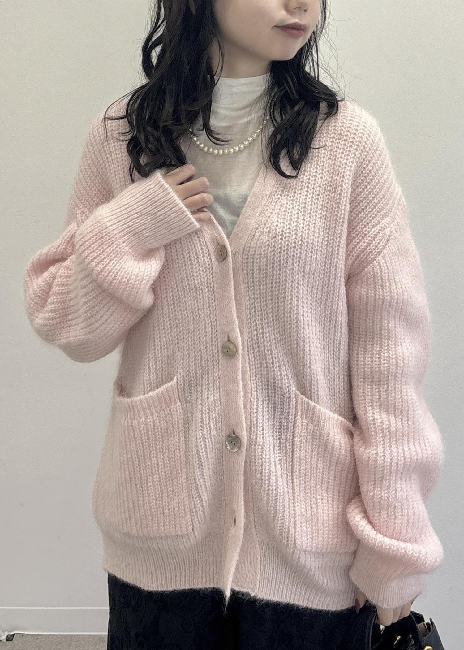 ROPÉスーパーキッドモヘヤVネックカーディガン/イージーケアピンク系 / F¥41,800レビュー着丈はお尻がしっかりと隠れる長さ。