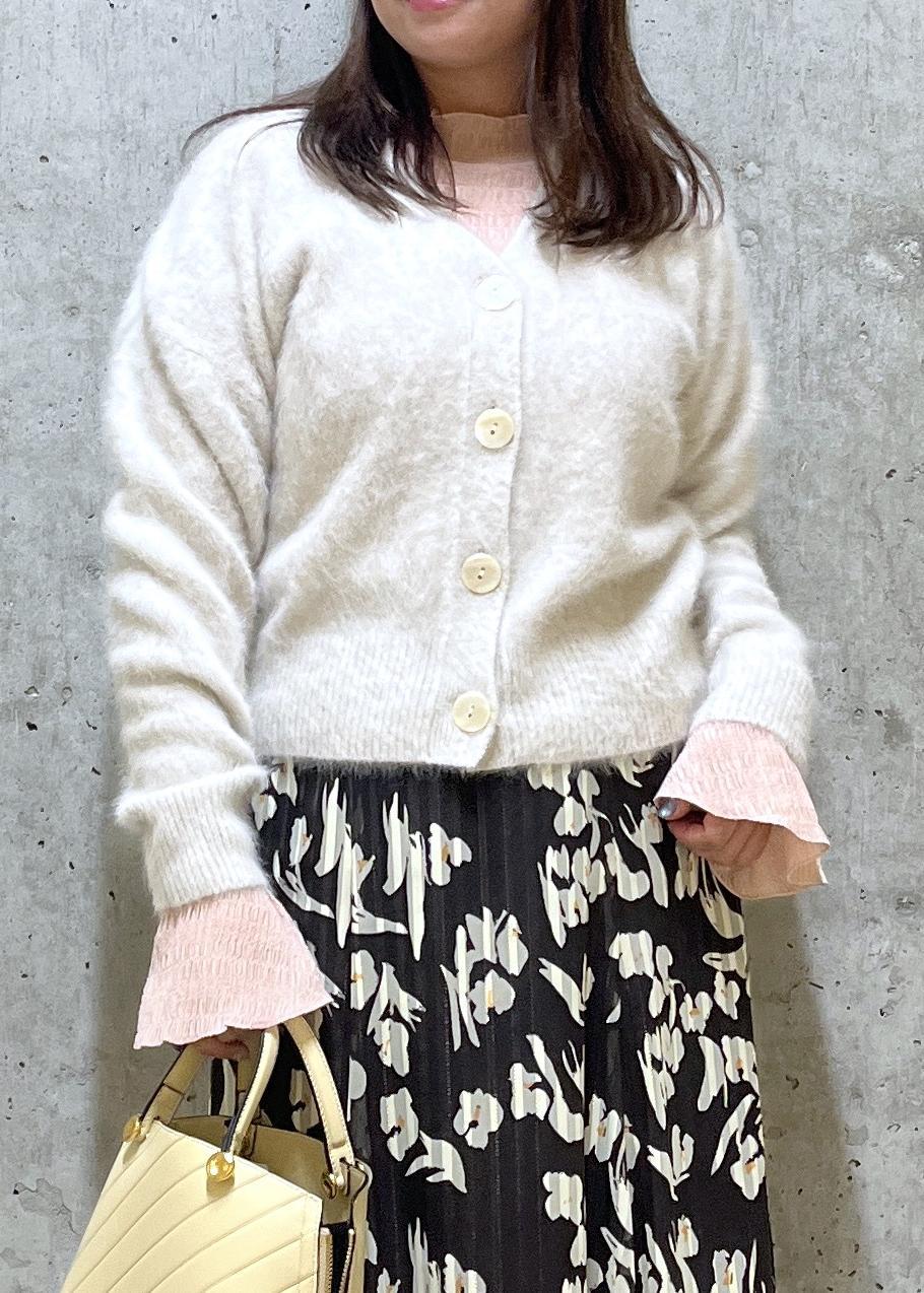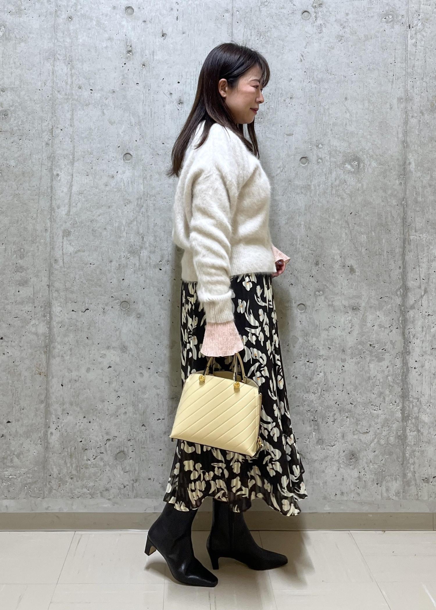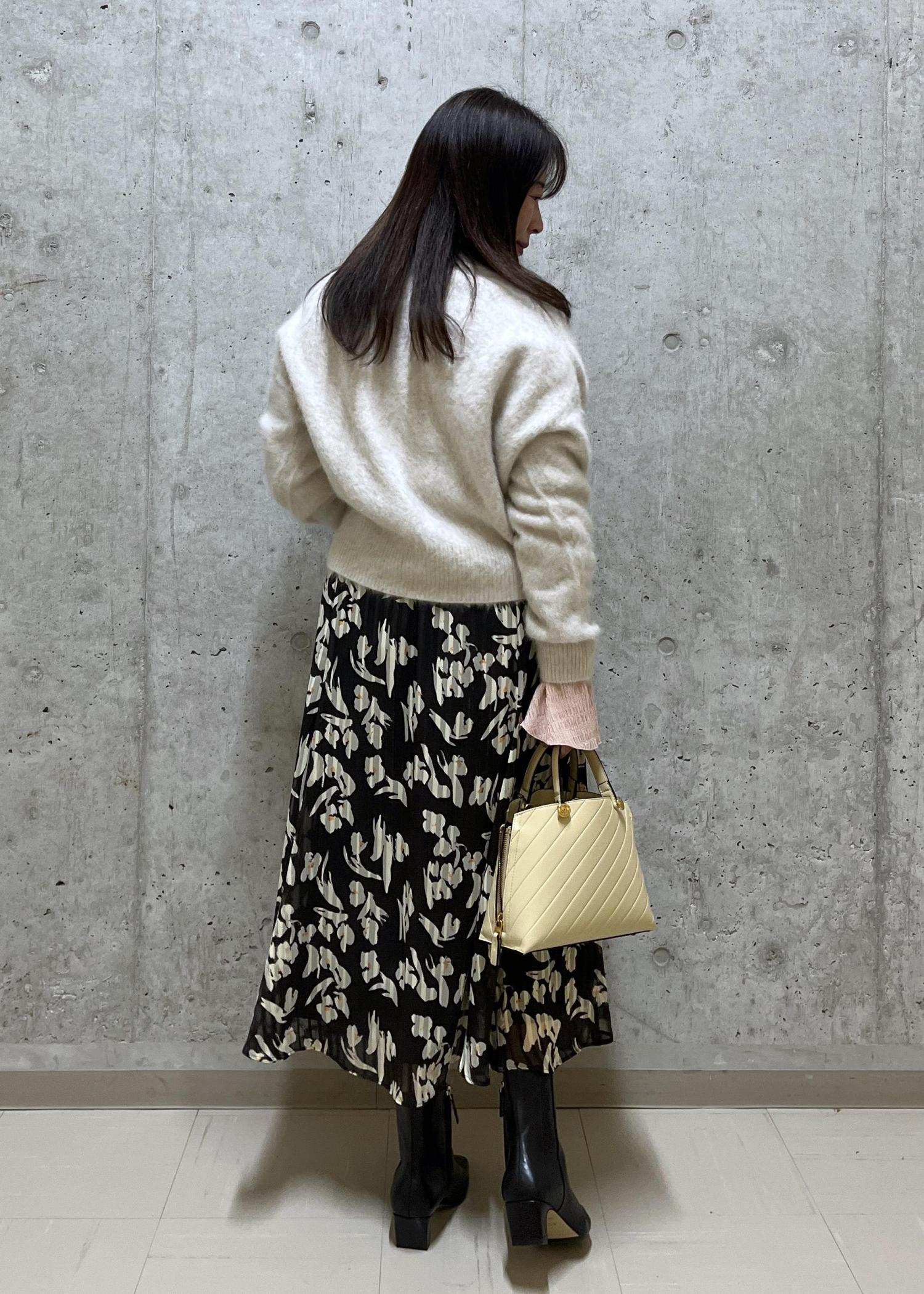 ふわっとしたニットと花柄のスカートと合わせて、大人可愛い雰囲気にしました。