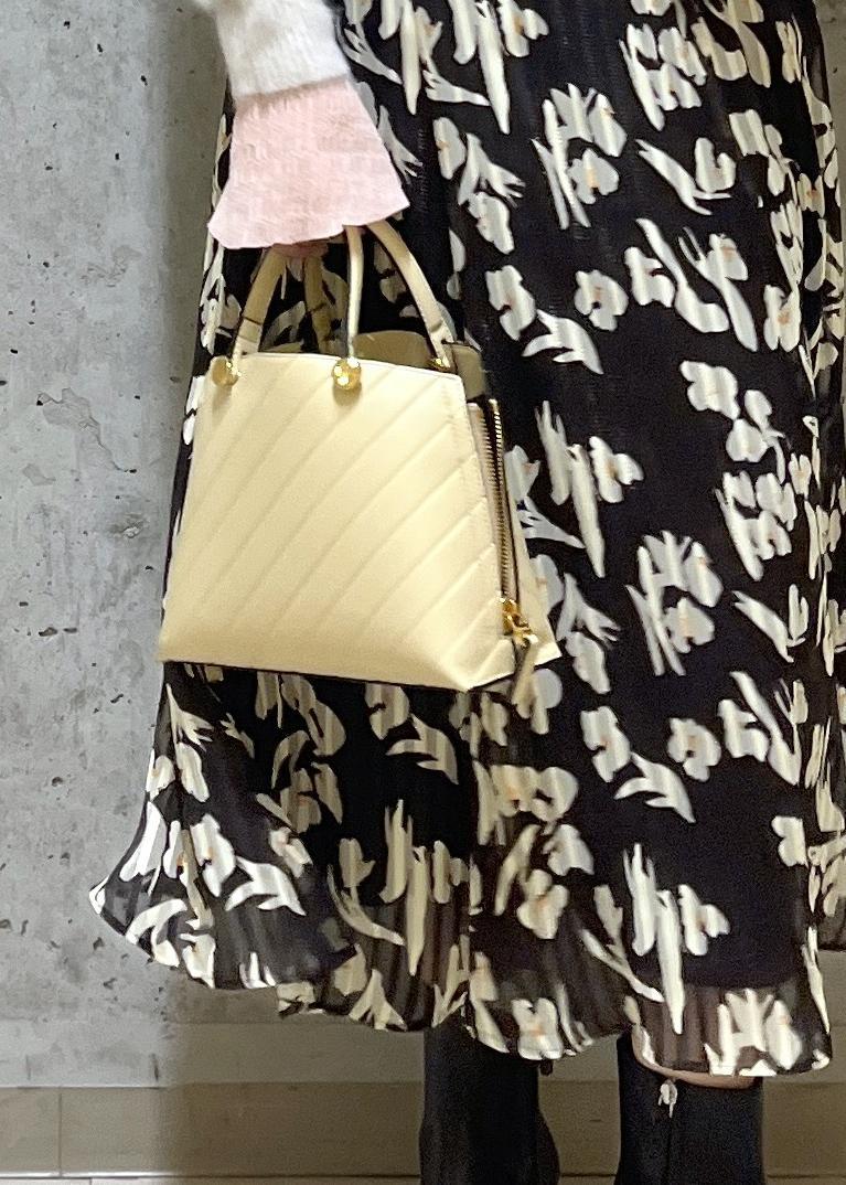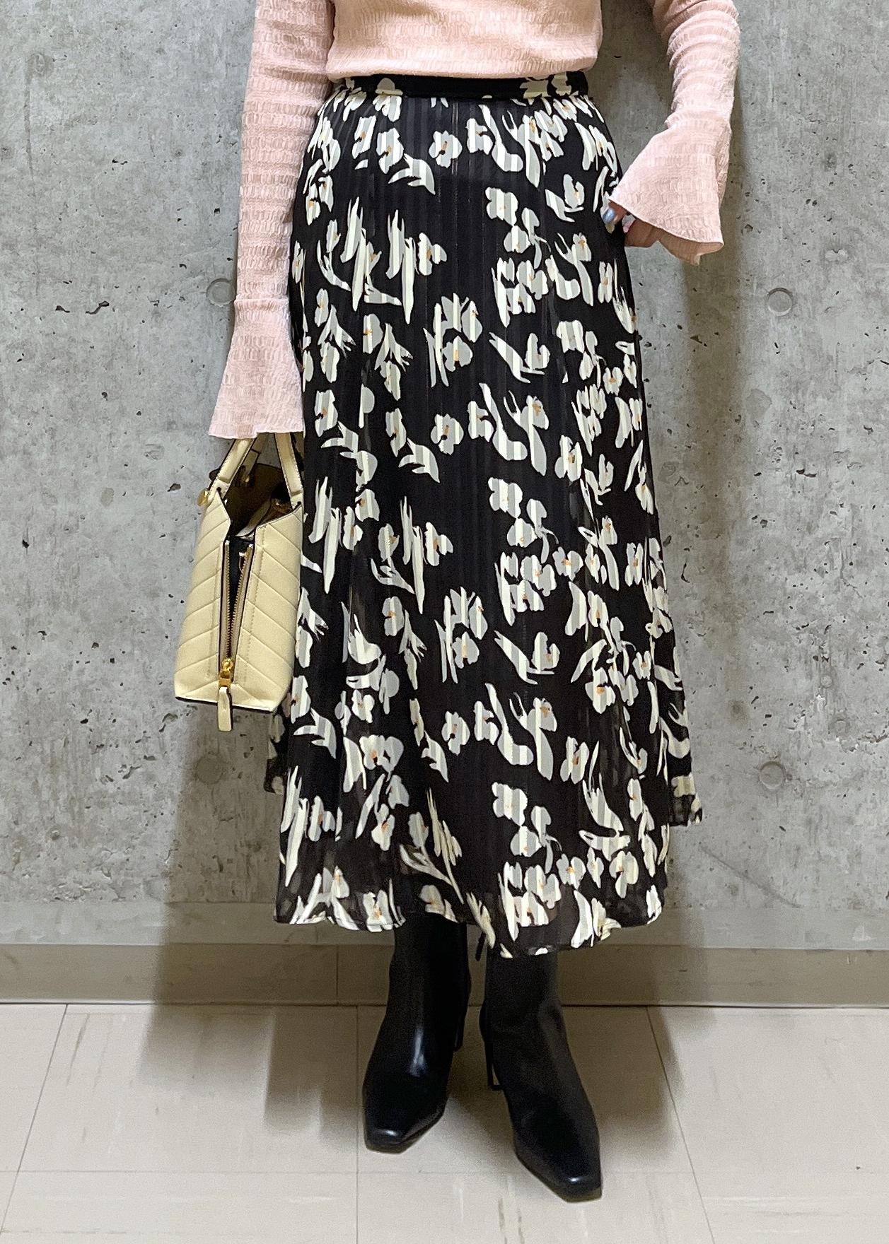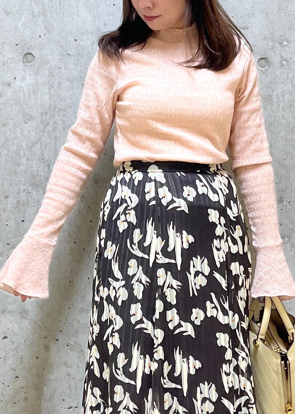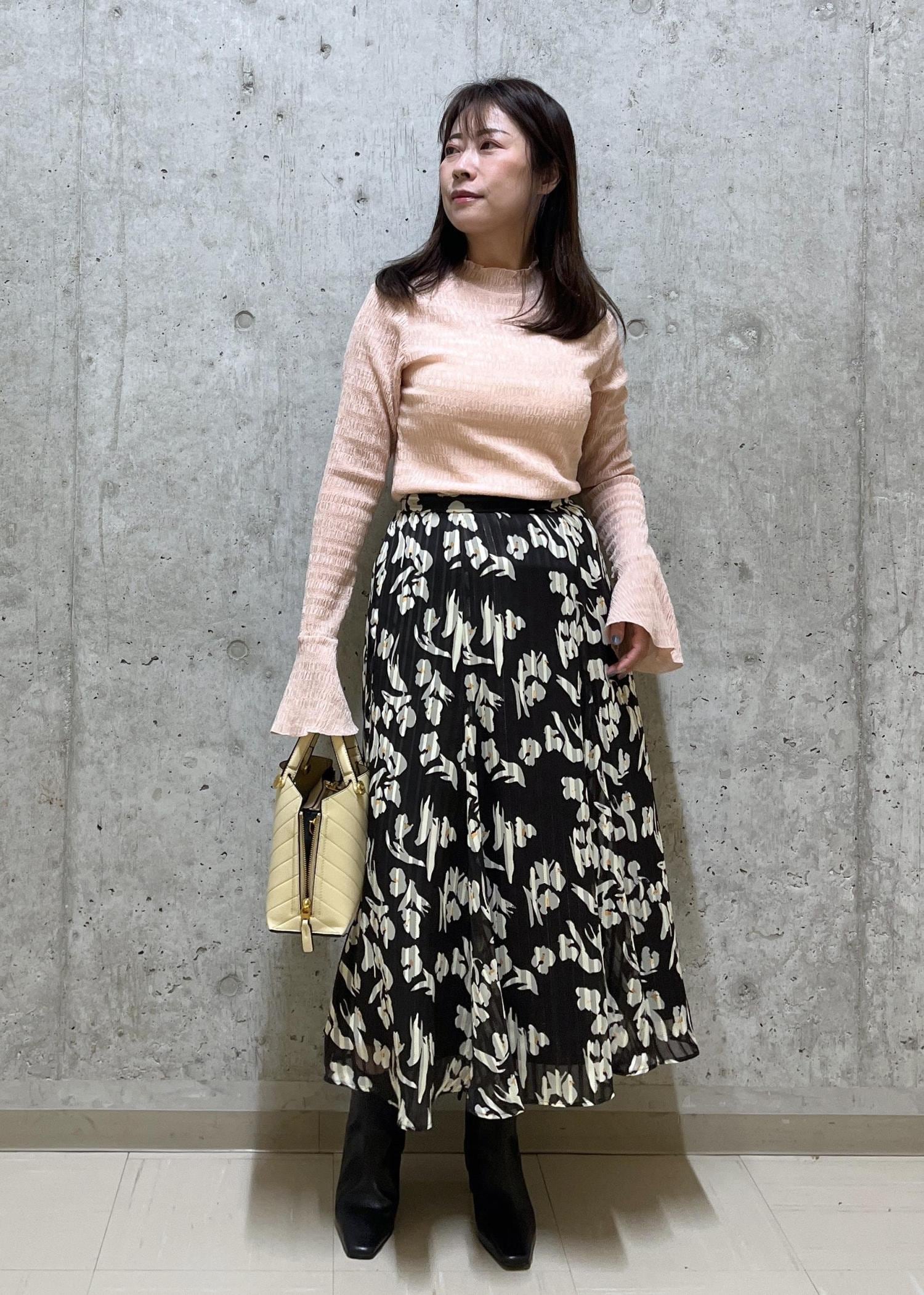 ふわっとしたニットと花柄のスカートと合わせて、大人可愛い雰囲気にしました。
