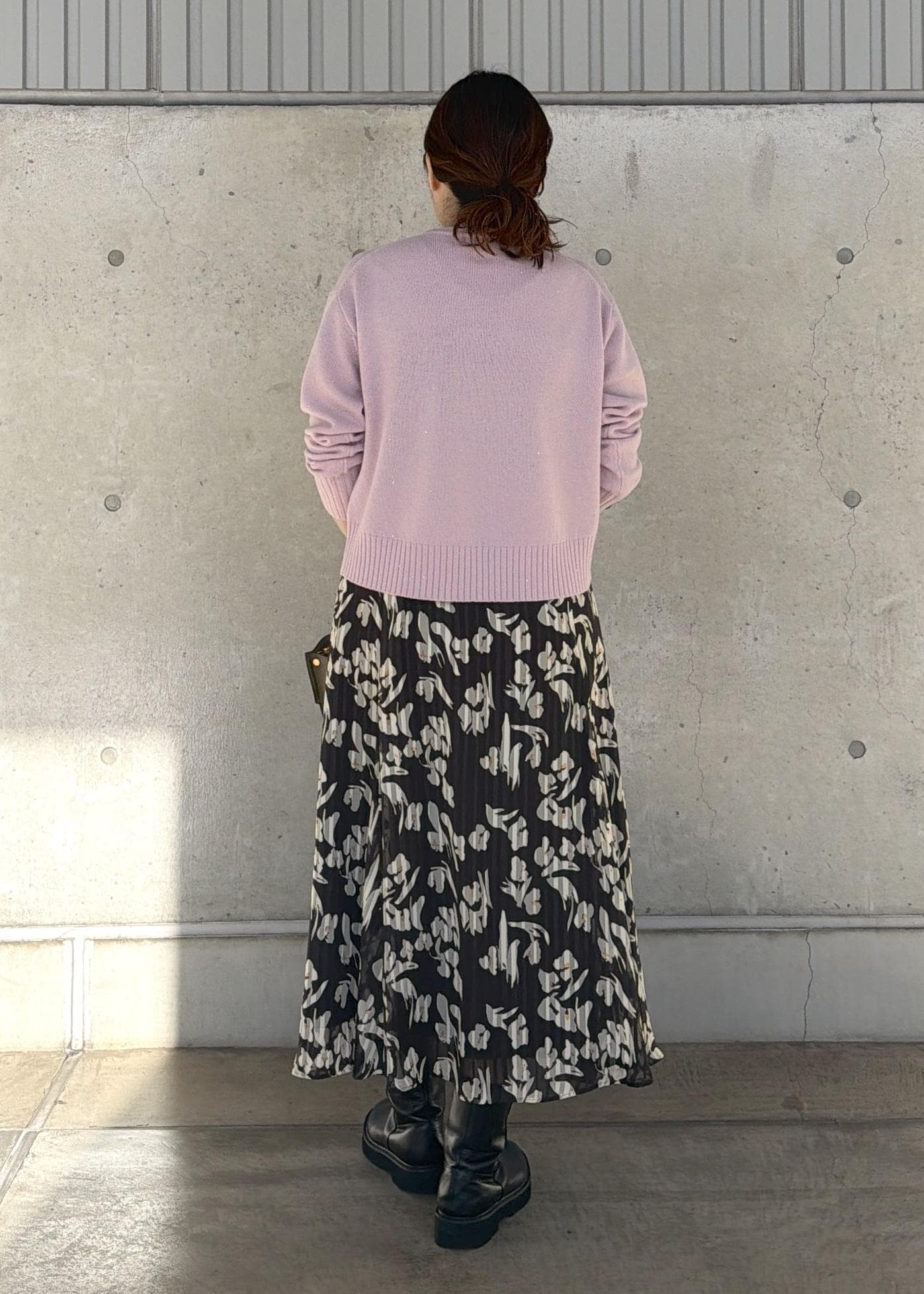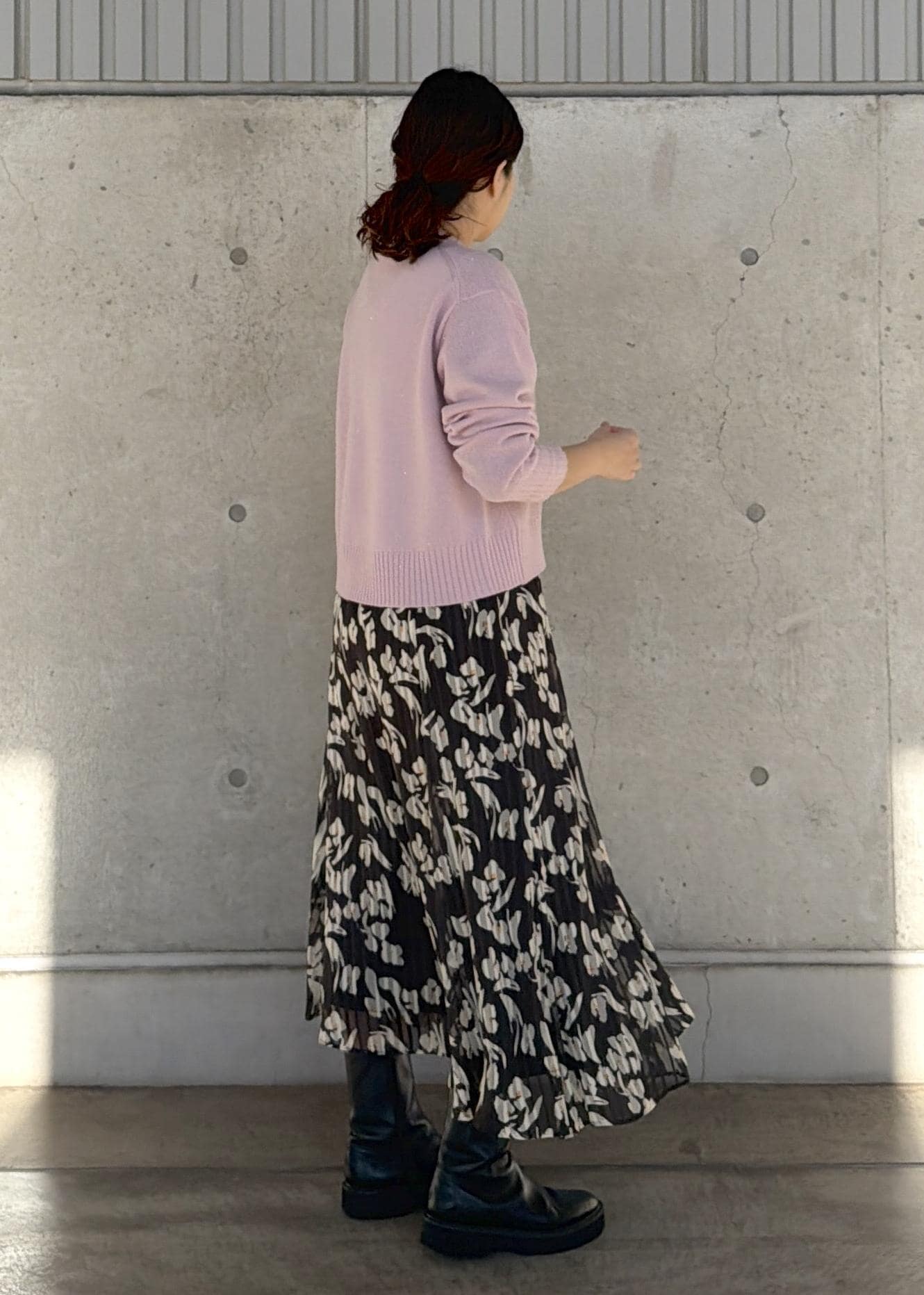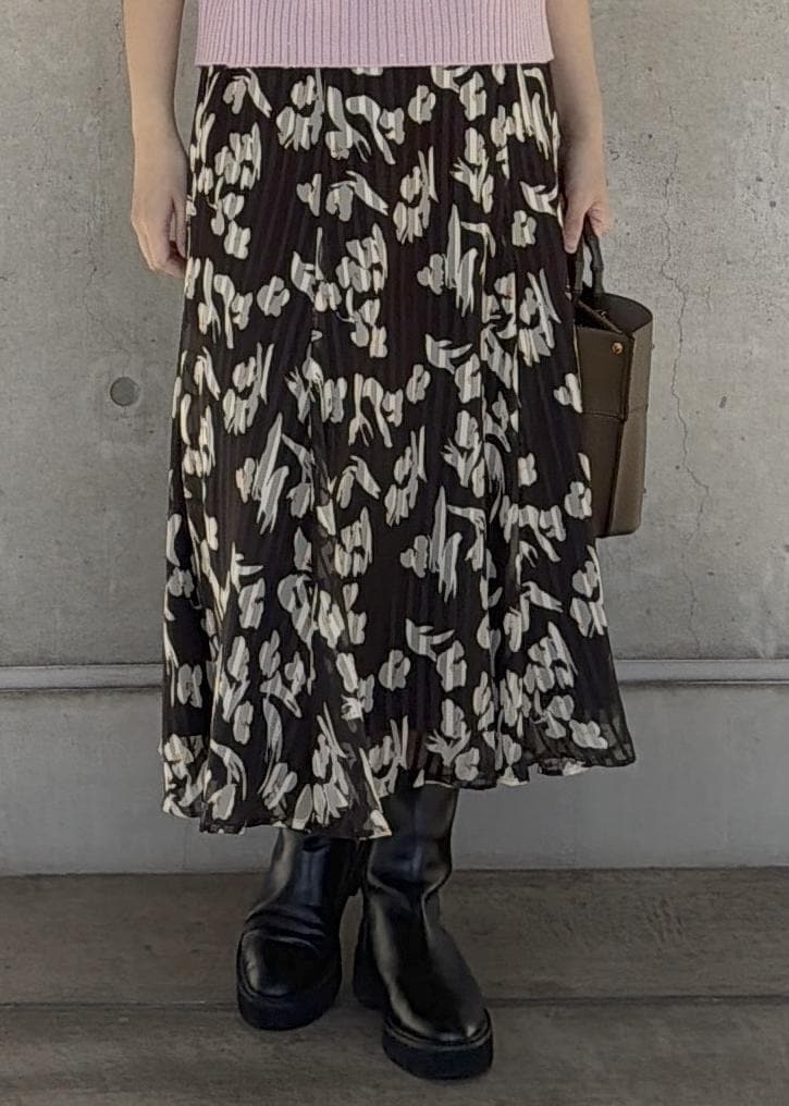 冬はアウターがあるのでシンプルになりがちですが、ロングコートを合わせても少しチラッと除く丈感の柄スカートがあると少し華やかにしてくれます。