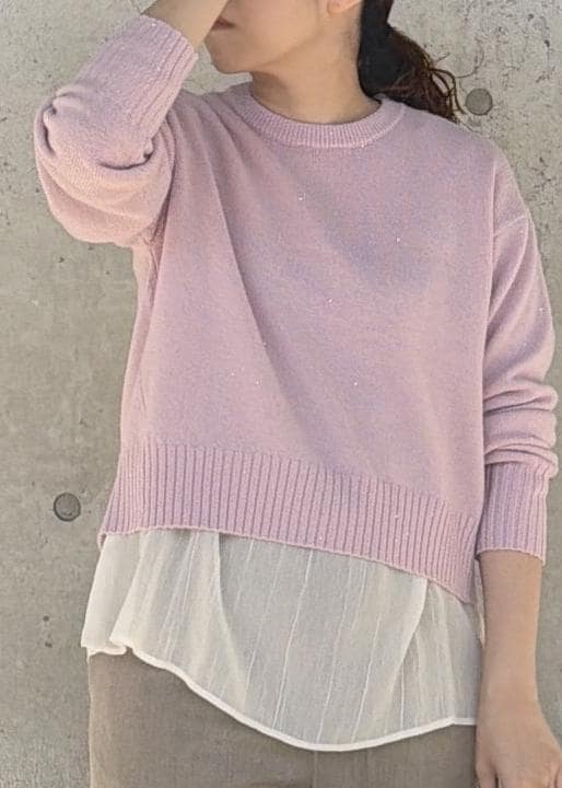 短丈で程よいゆとりがありレイヤードしていただきやすく、全体にさり気なくスパンコールの入った華やかなニットです。また、ラウンドになっている裾のラインが女性らしい柔らかな印象にしてくれます。