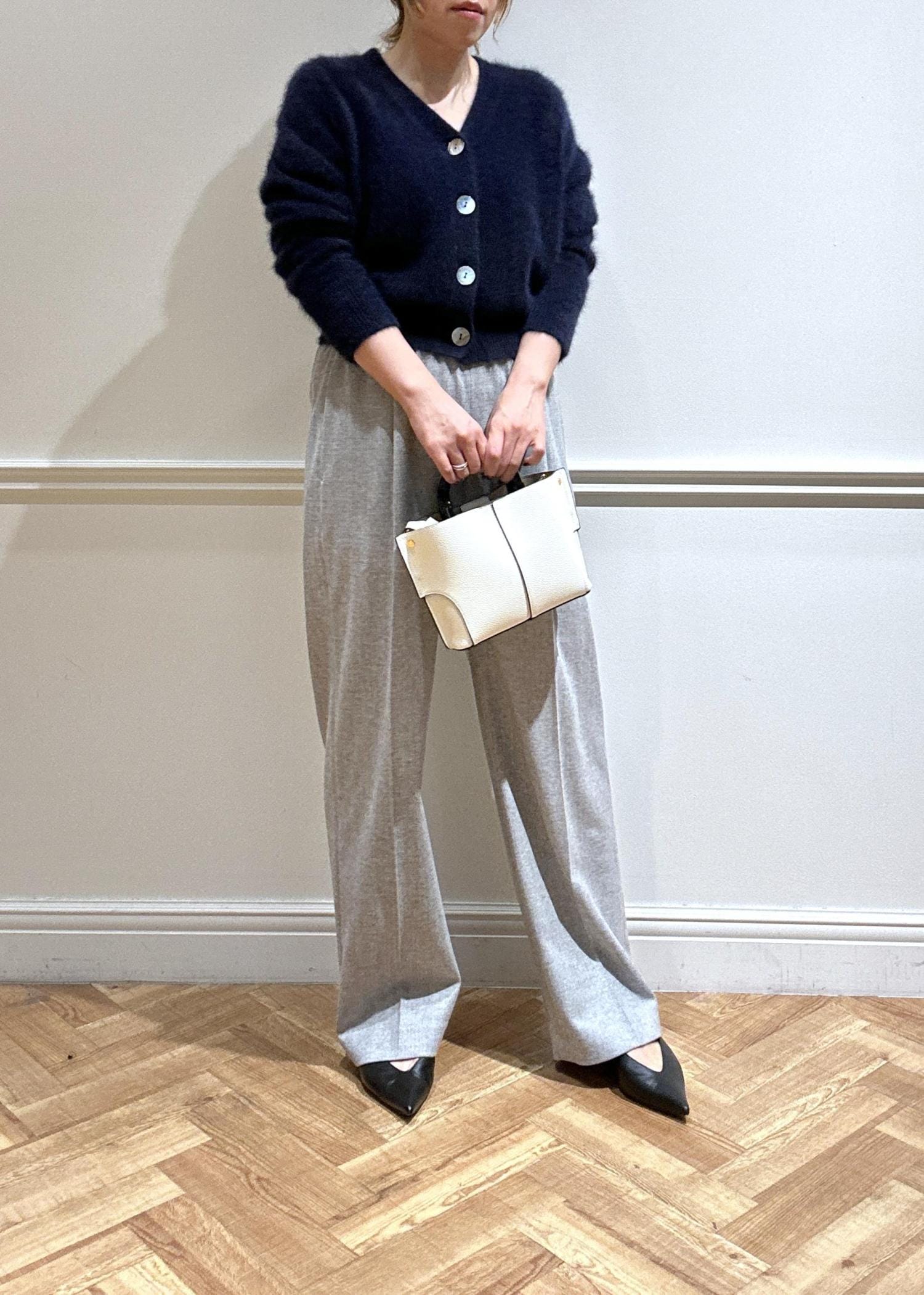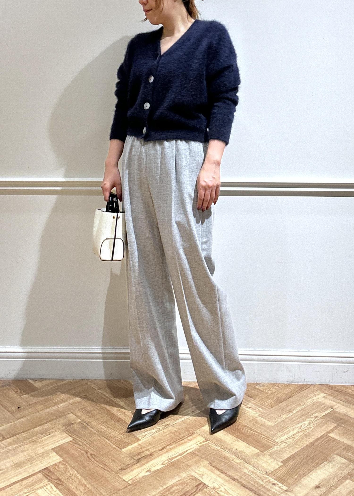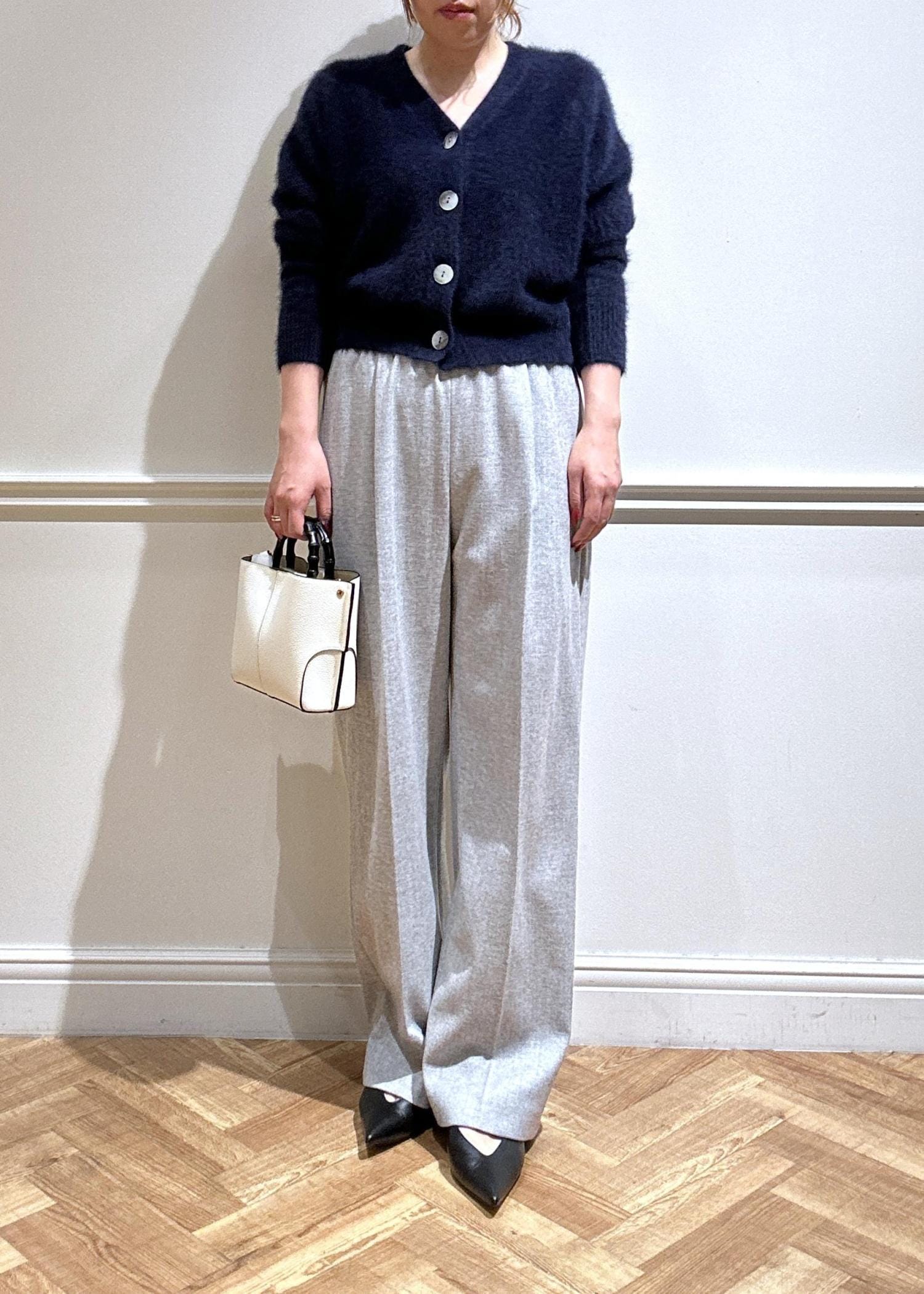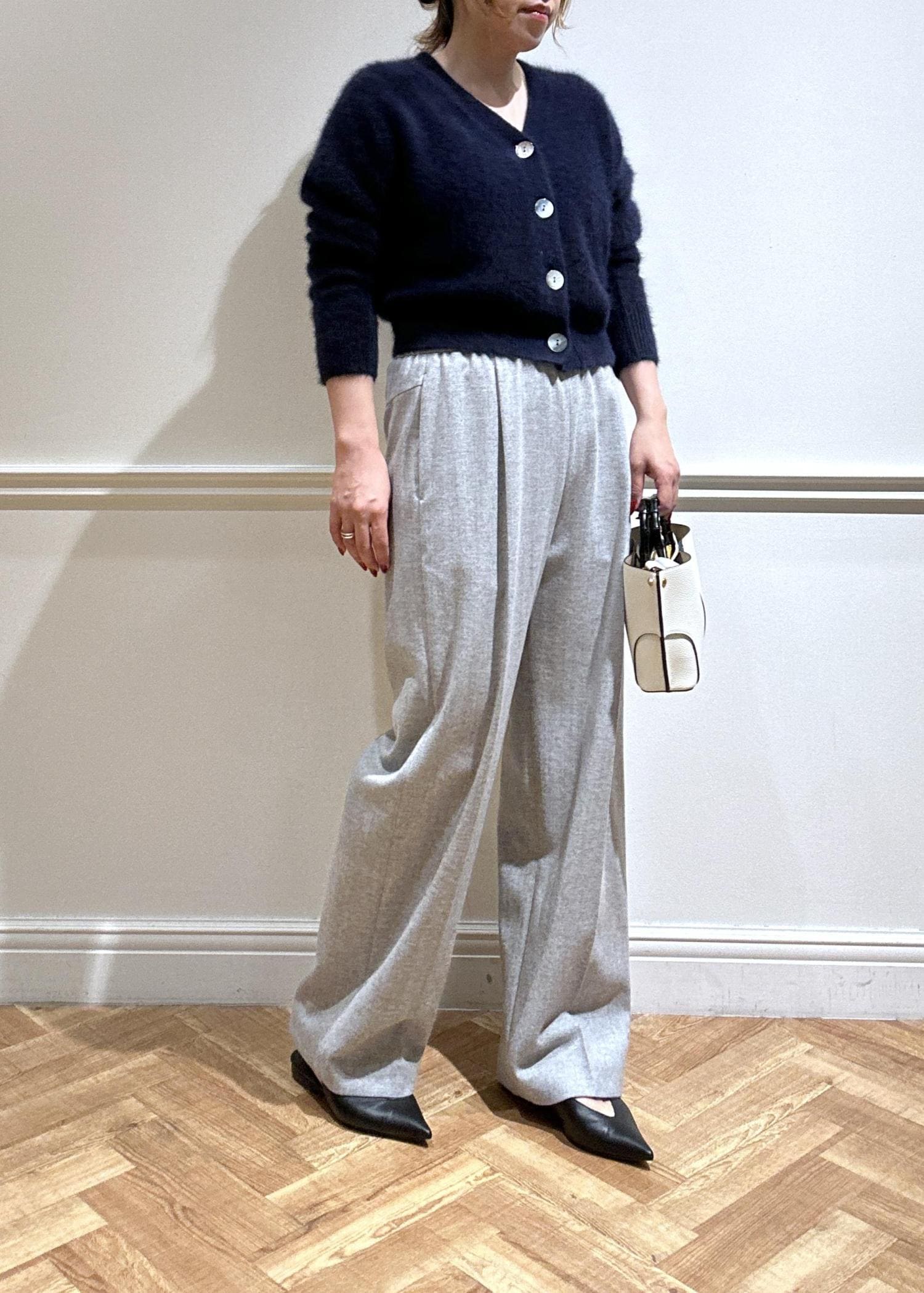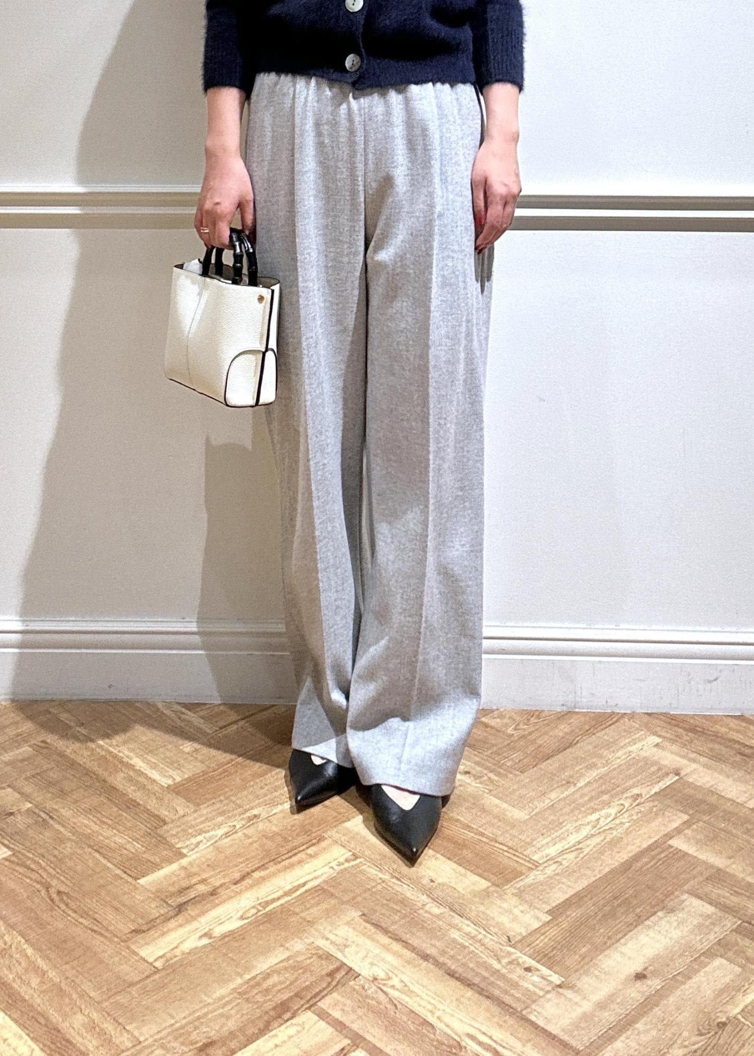 パンツはウエストゴムで楽ちん。ウール100%で温かくワイドすぎないシルエットがきれいに見せてくれます◎