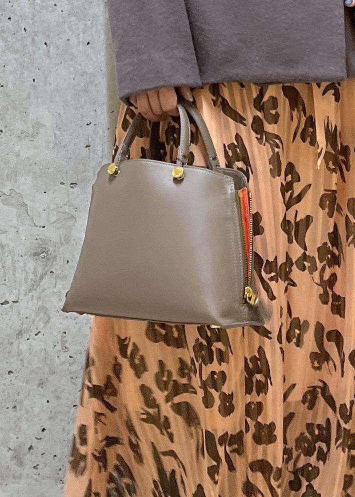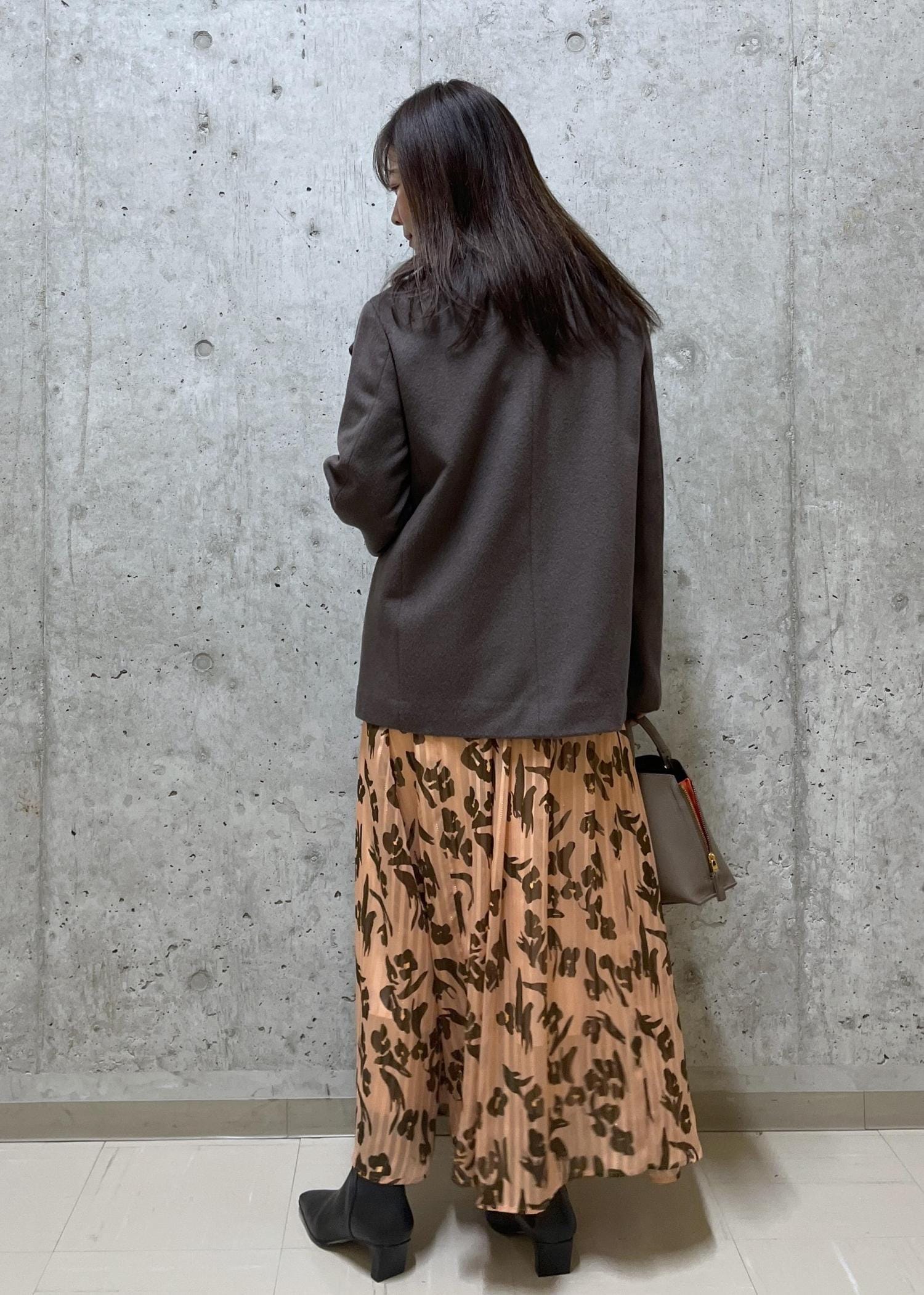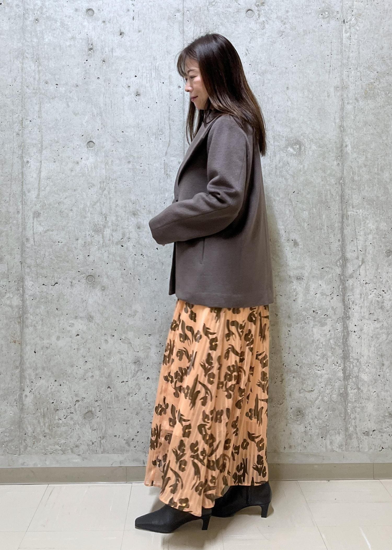 花柄とオレンジの色合いが、落ち着いた中にも華やかな雰囲気にしてくれるコーディネートです。