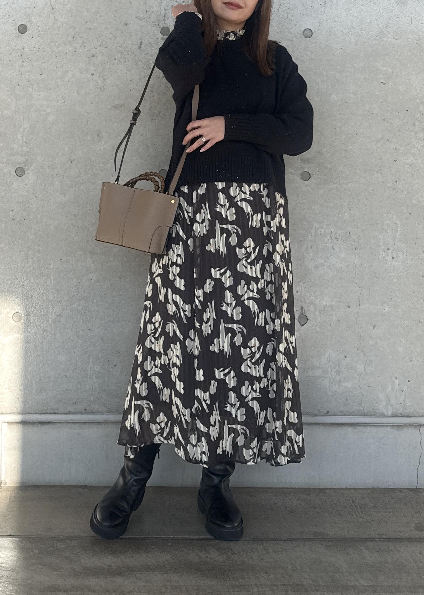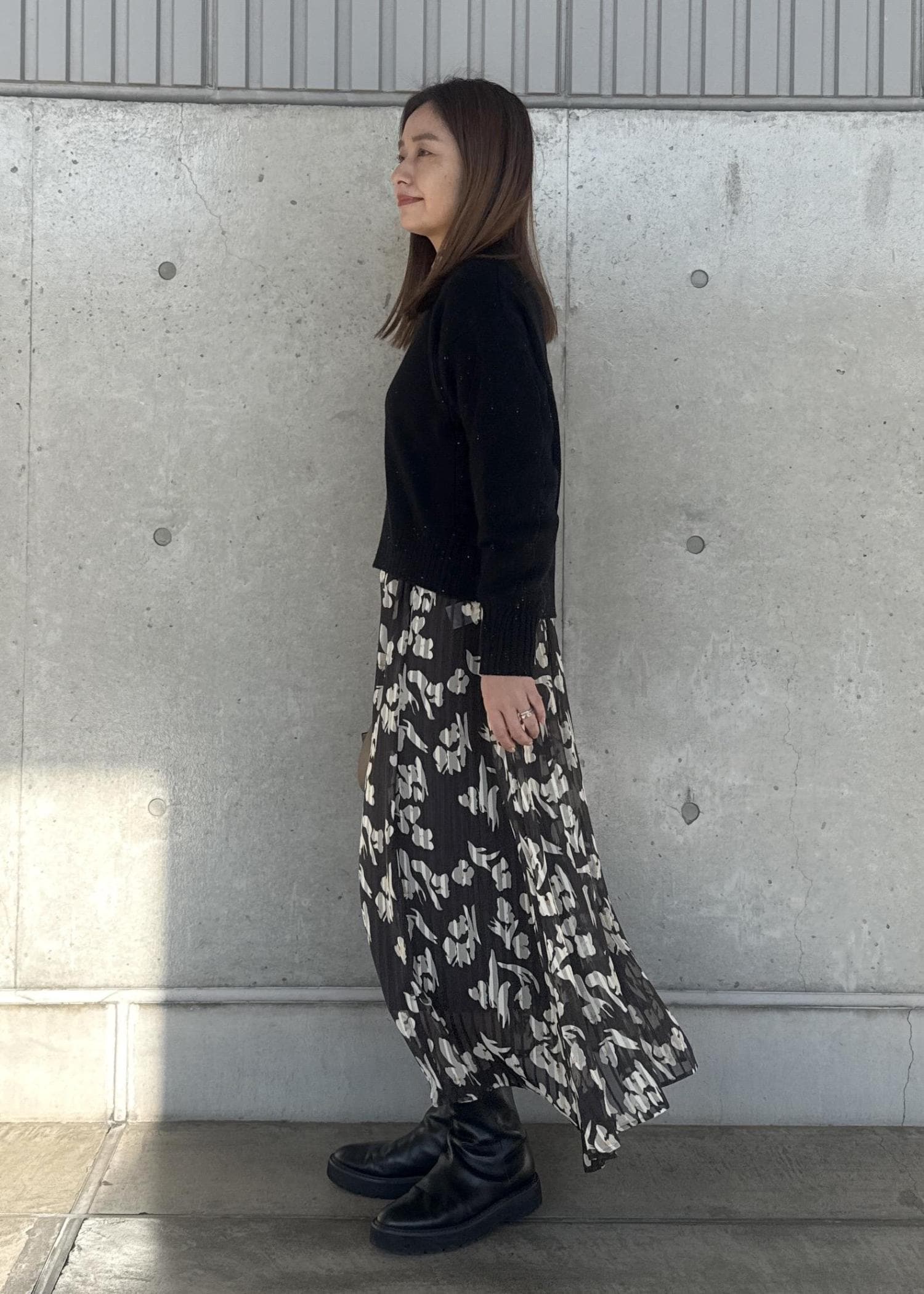 着丈は、161センチの私が着用してふくらはぎくらいでした。たっぷりとした着丈なので、コーディネートの際に迷わずに羽織っていいただけます。