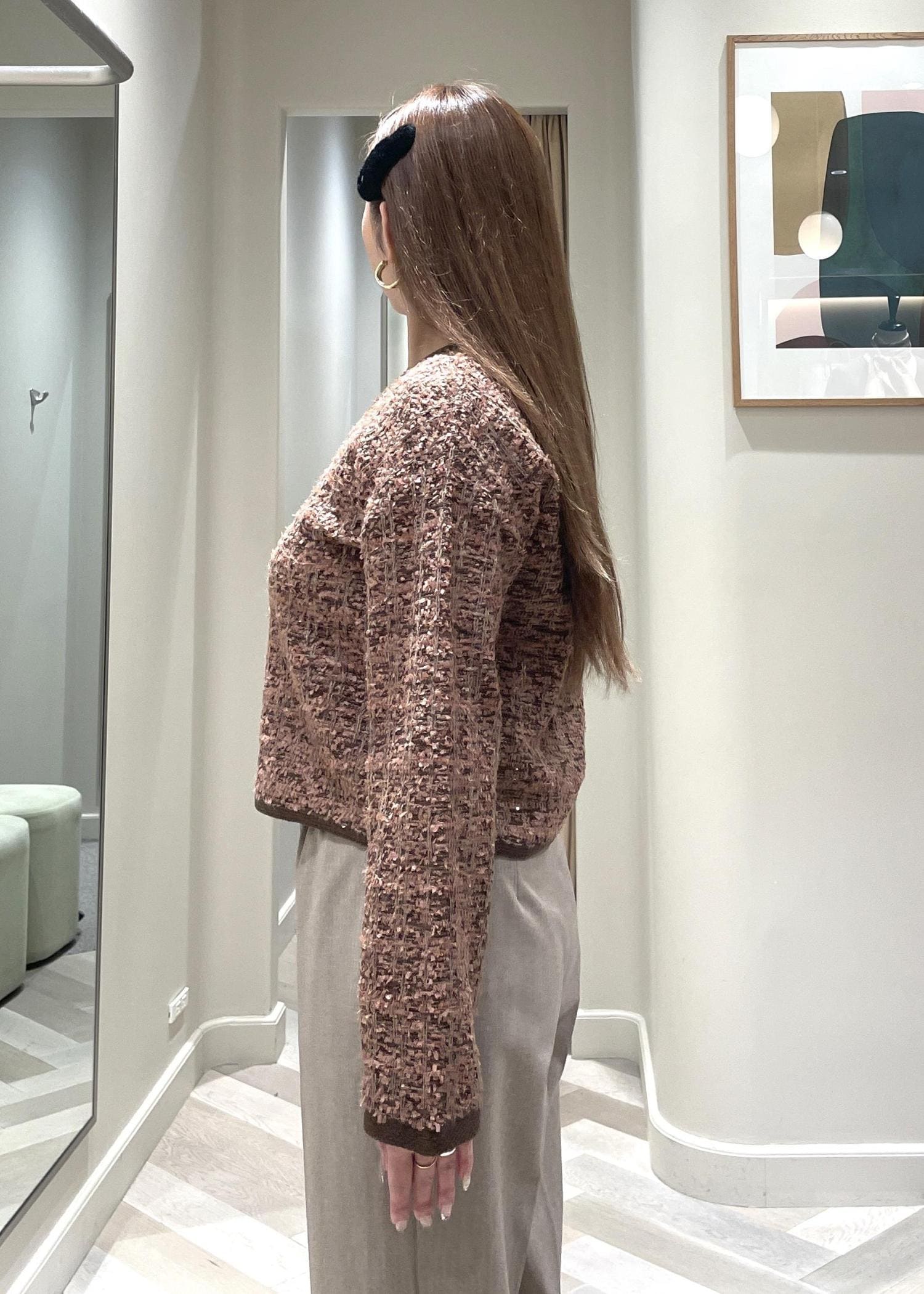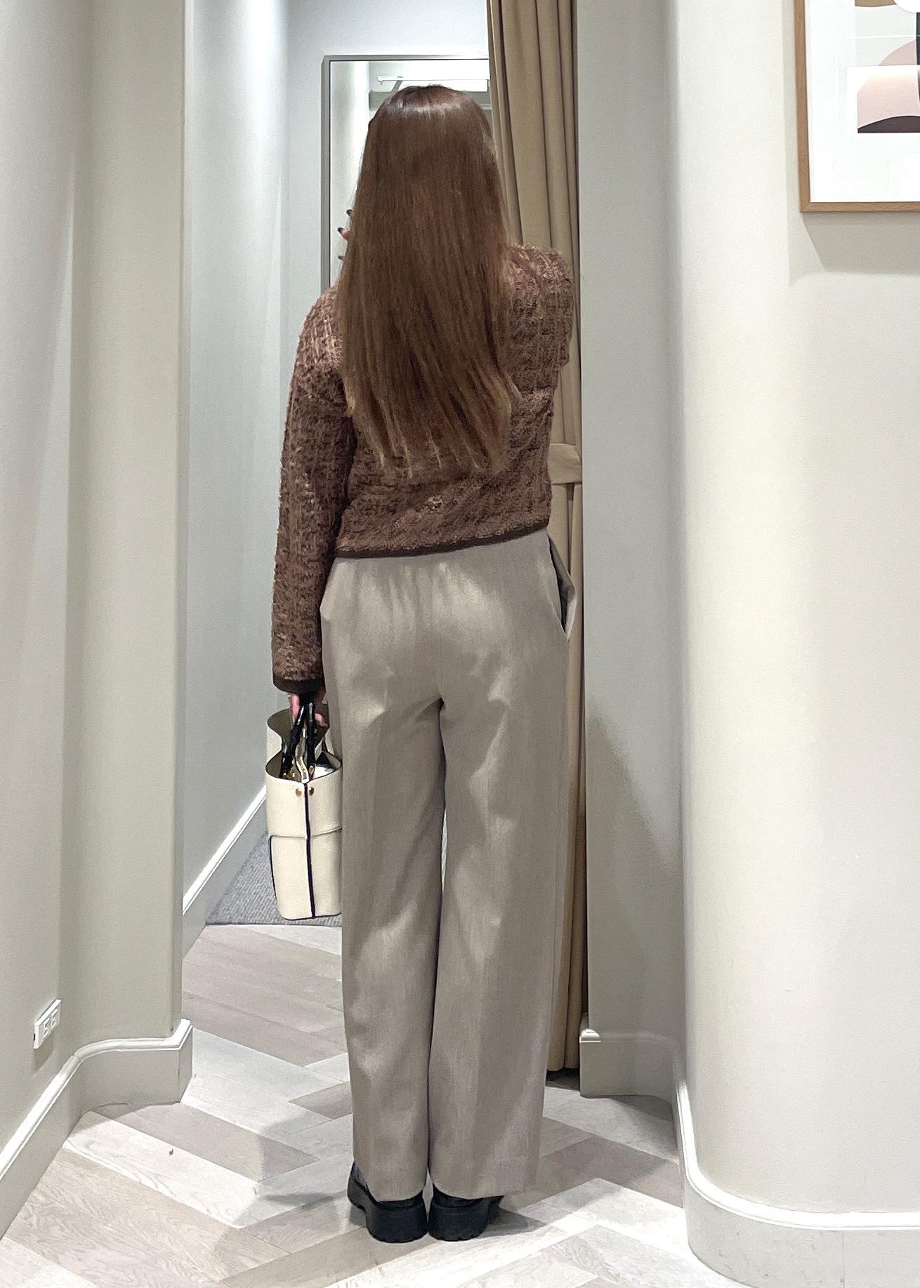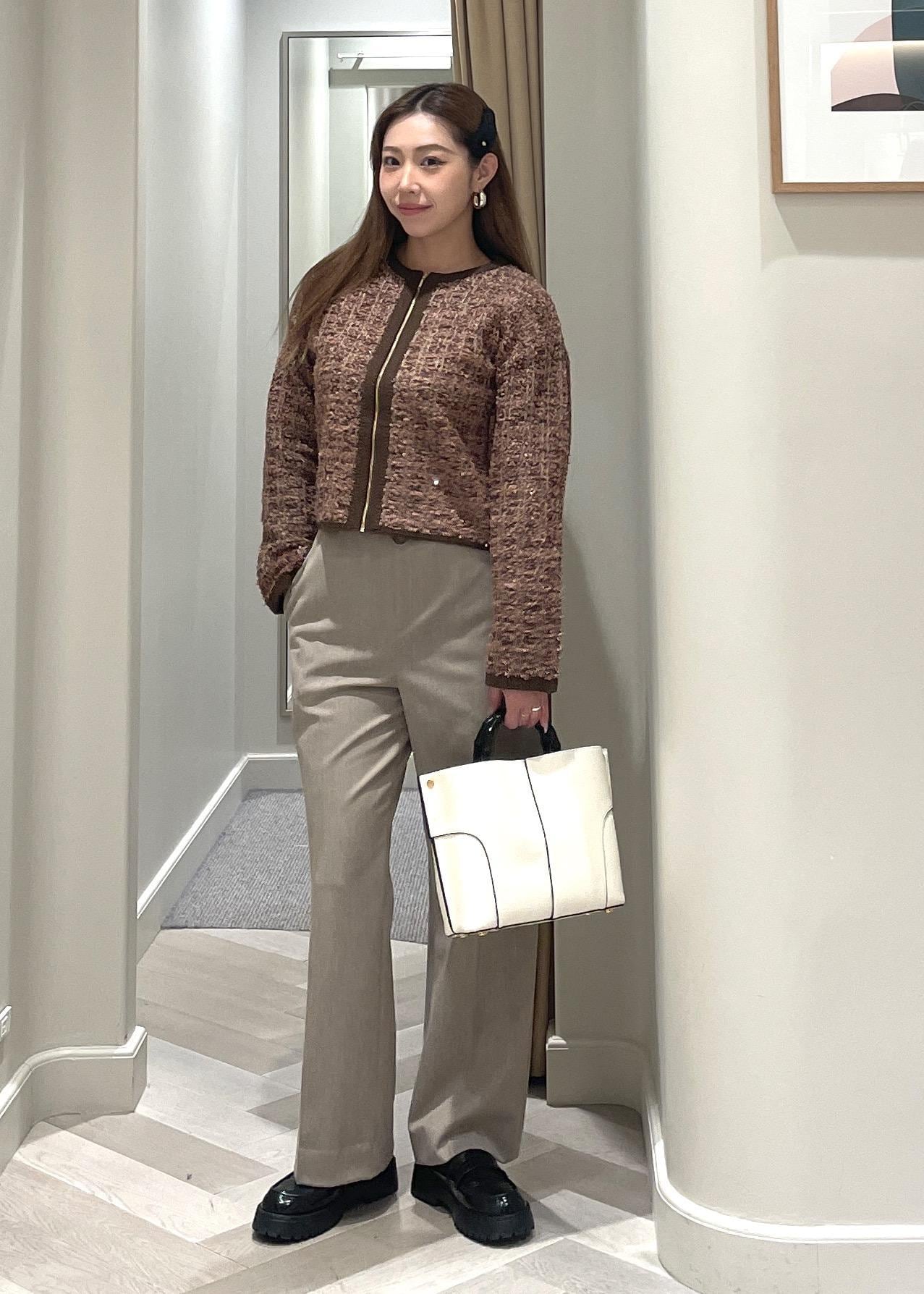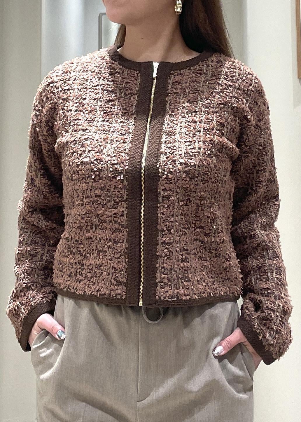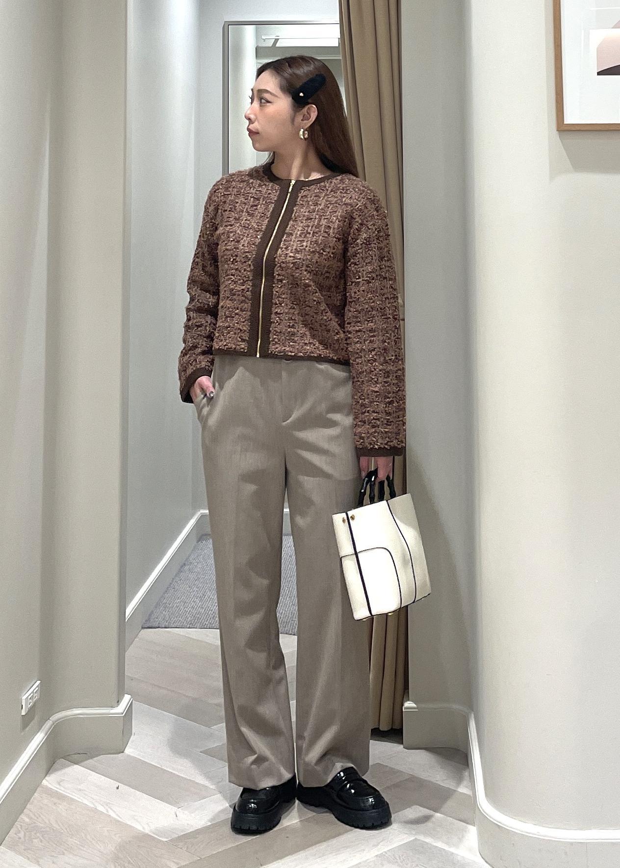ROPÉツイードZIPノーカラーカーディガン/イージーケアブラウン系 / F¥25,300レビュー丈感は、160cmが着用でおへそ下辺り。
