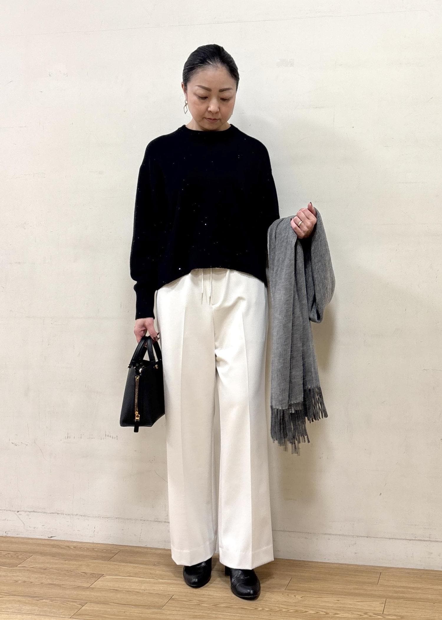細かいスパンコールで上品かつ華やかさのあるニットはシンプルな組み合わせで大人っぽく。