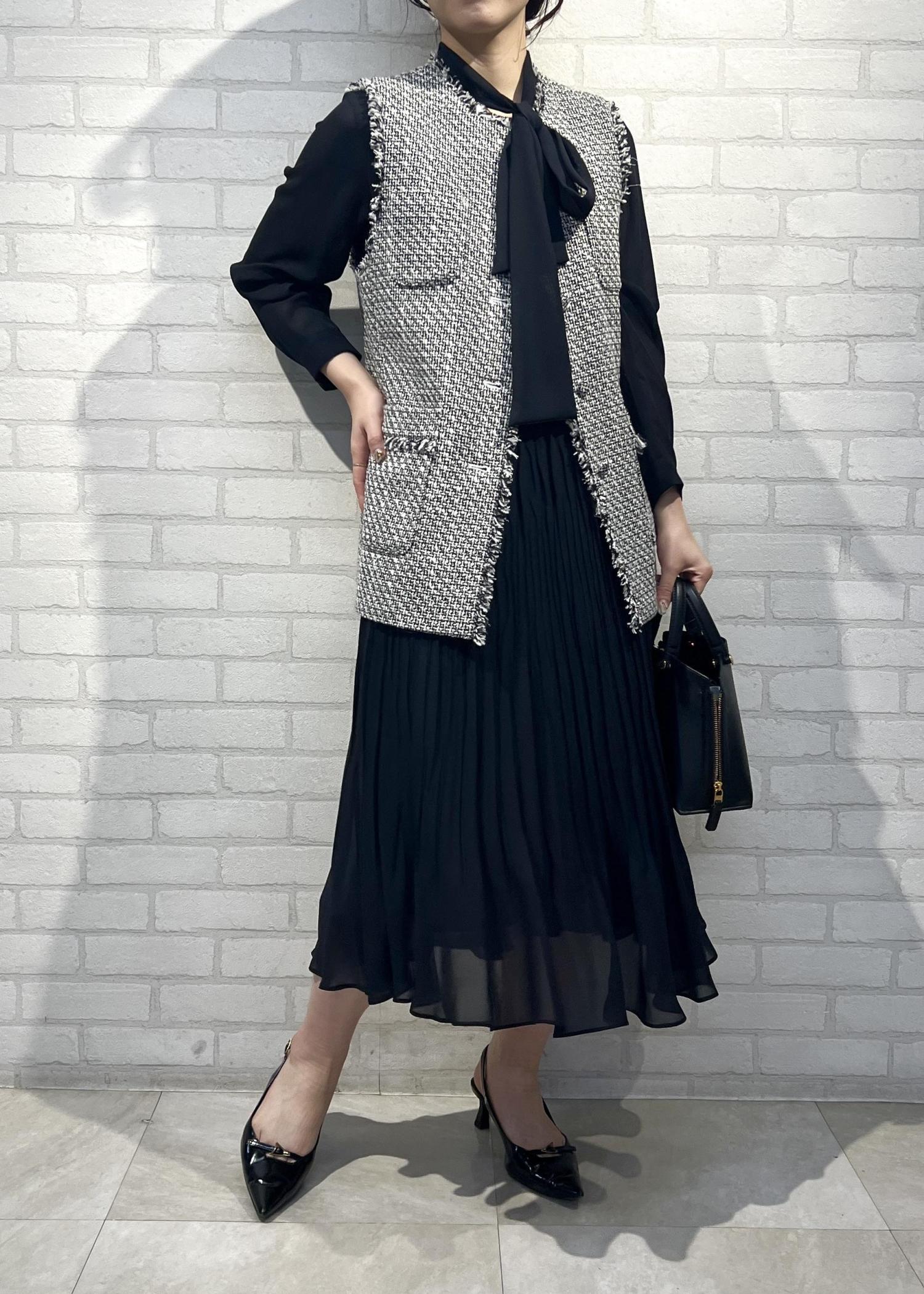 こなれ感の出るツイードジレを合わせたスタイリング。