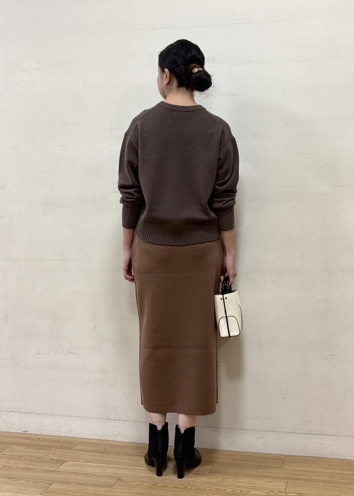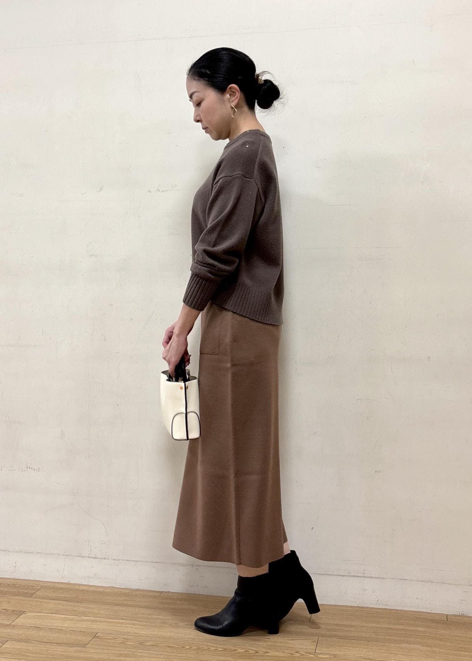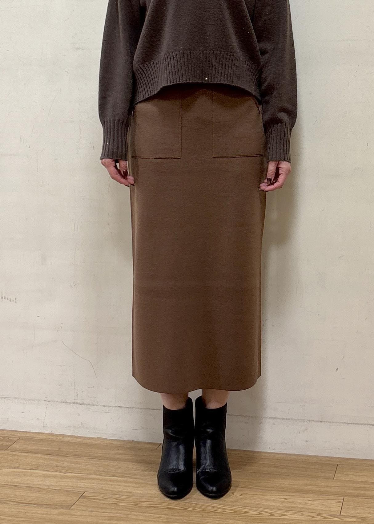 やや肉厚のニットスカートは体を包み込んでくれるような肌あたりのよい着心地。ブラウン系のワントーンで温かみのあるコーディネートにしました。