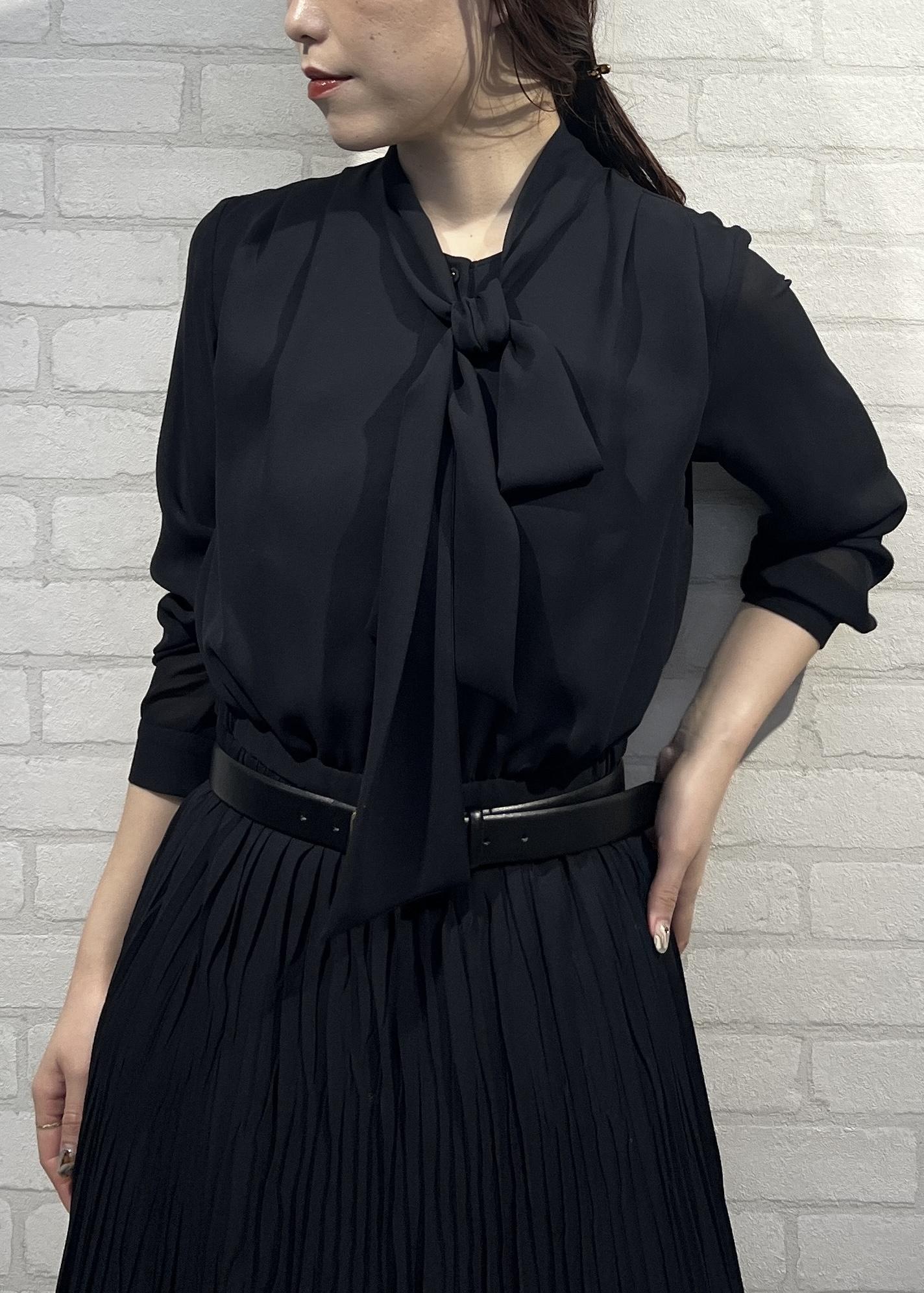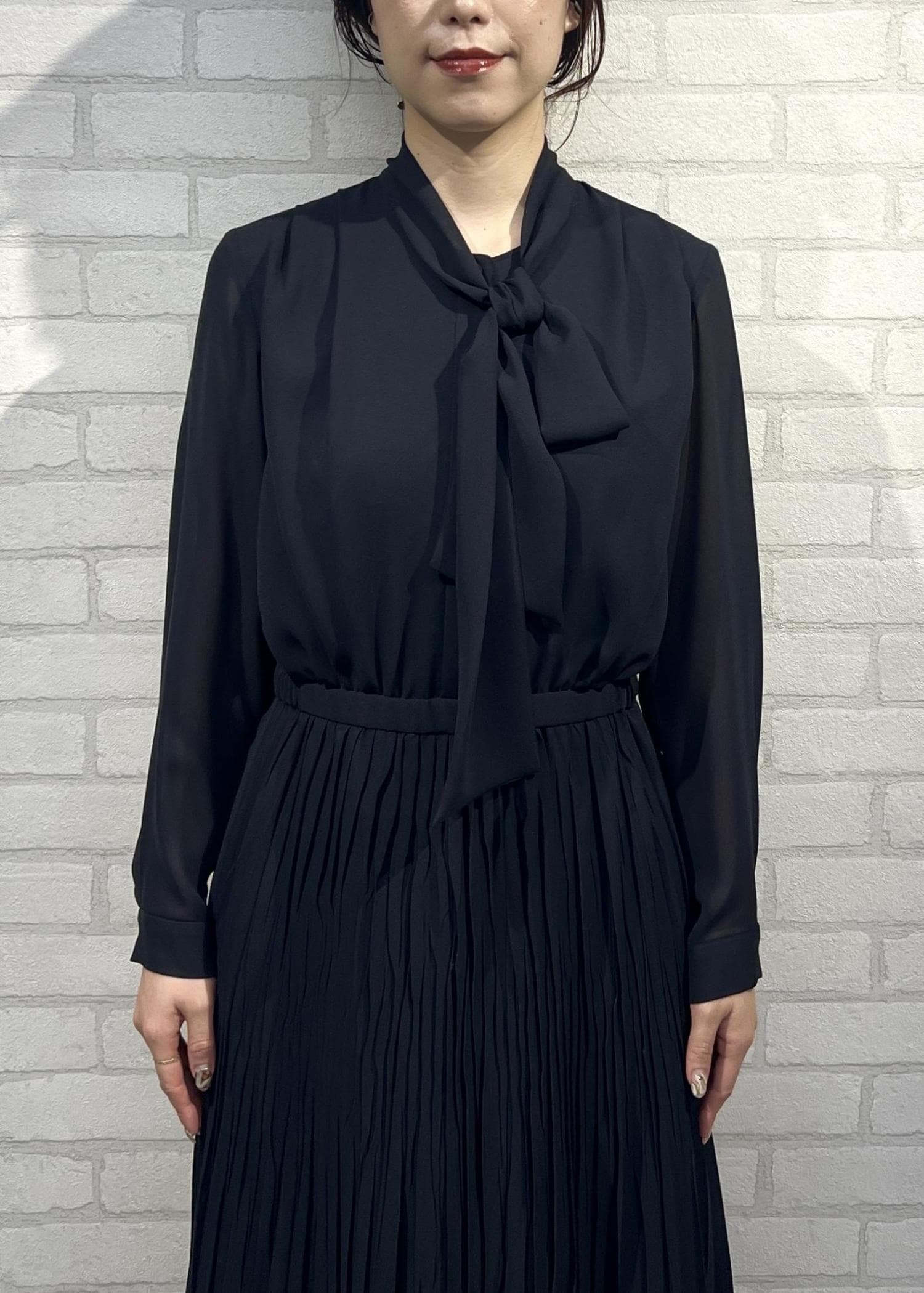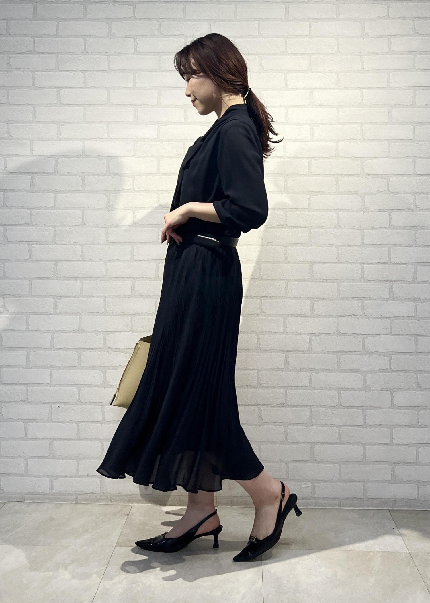 ROPÉジョーゼットシフォンプリーツワンピース/26SSネイビー / 38¥49,500レビュー着丈はふくらはぎ半分くらいまでのミモレ丈。裾にシアー感があるので、重たくなりすぎず通年使いやすいです◎