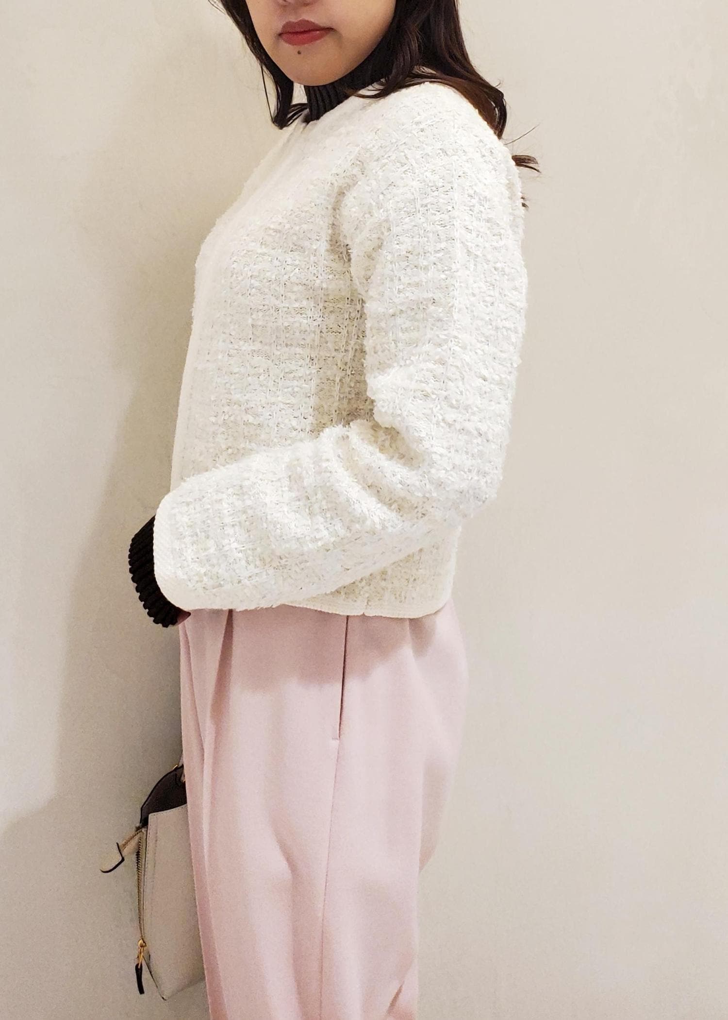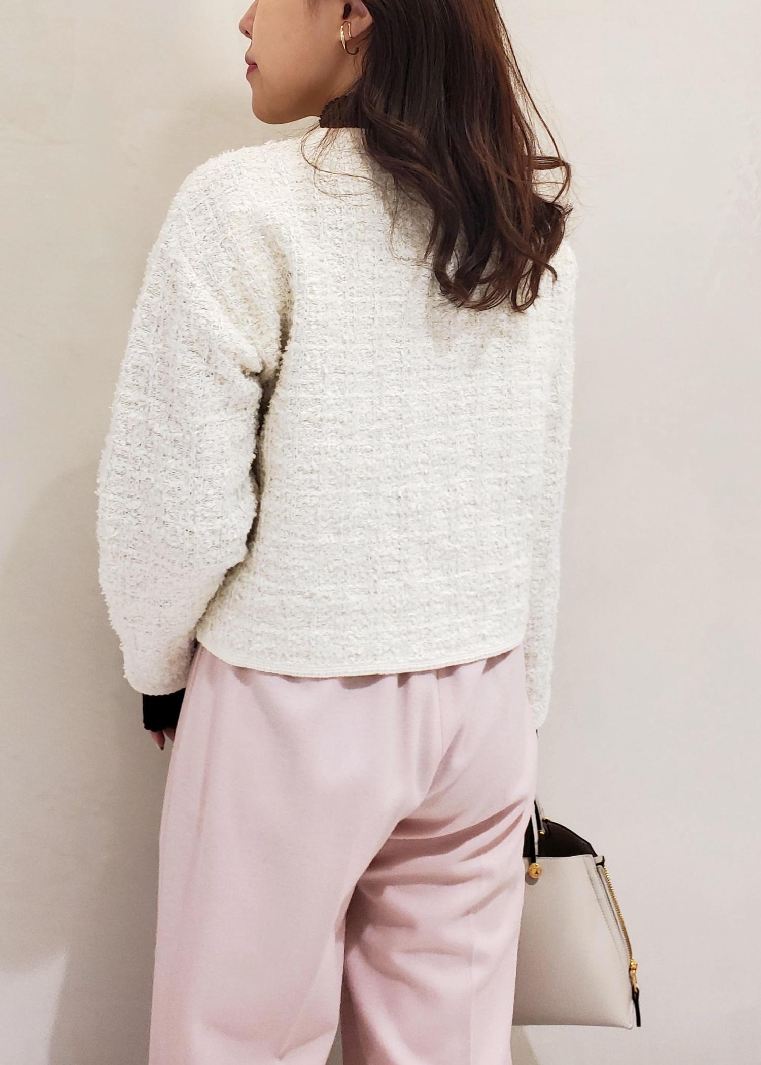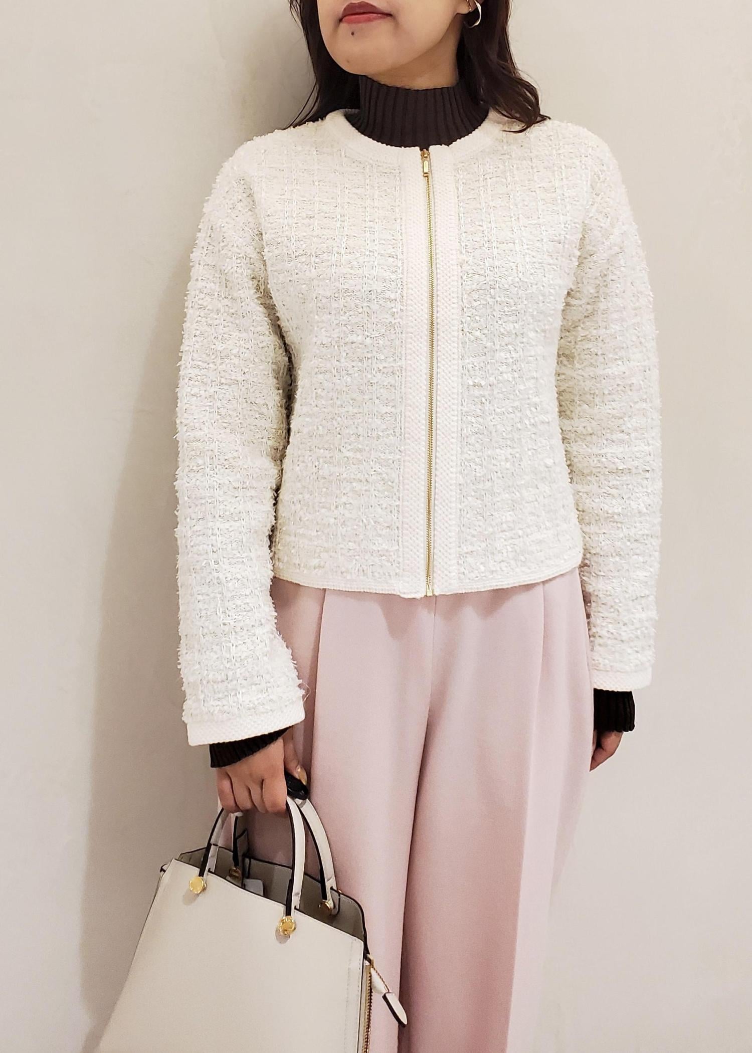 ROPÉツイードZIPノーカラーカーディガン/イージーケアキナリ / F¥25,300レビュー中にニットなど重ねられるくらいのゆとり感があります。