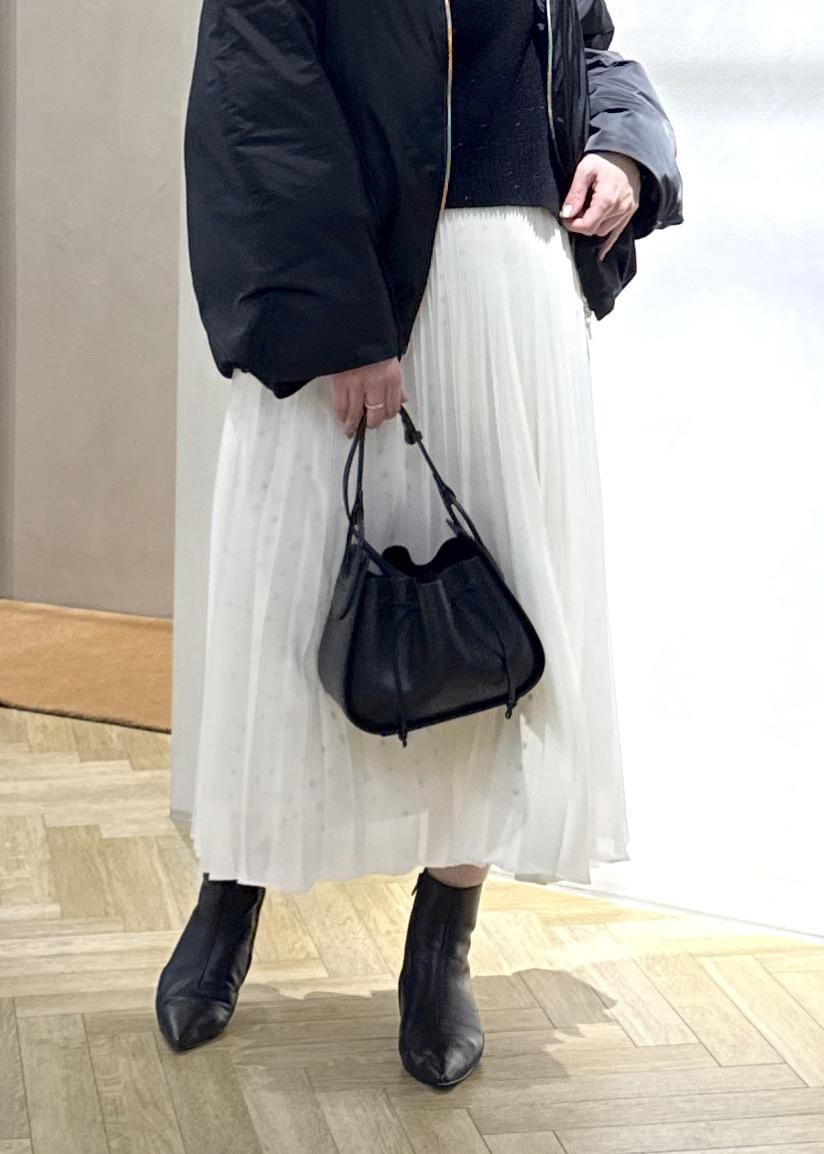 細かなプリーツで広がりをおさえたラインでいつもは気になる腰周りやヒップは気にならず。