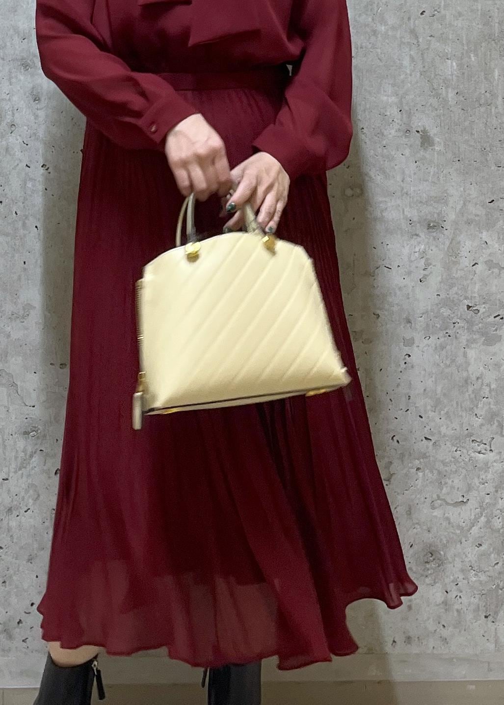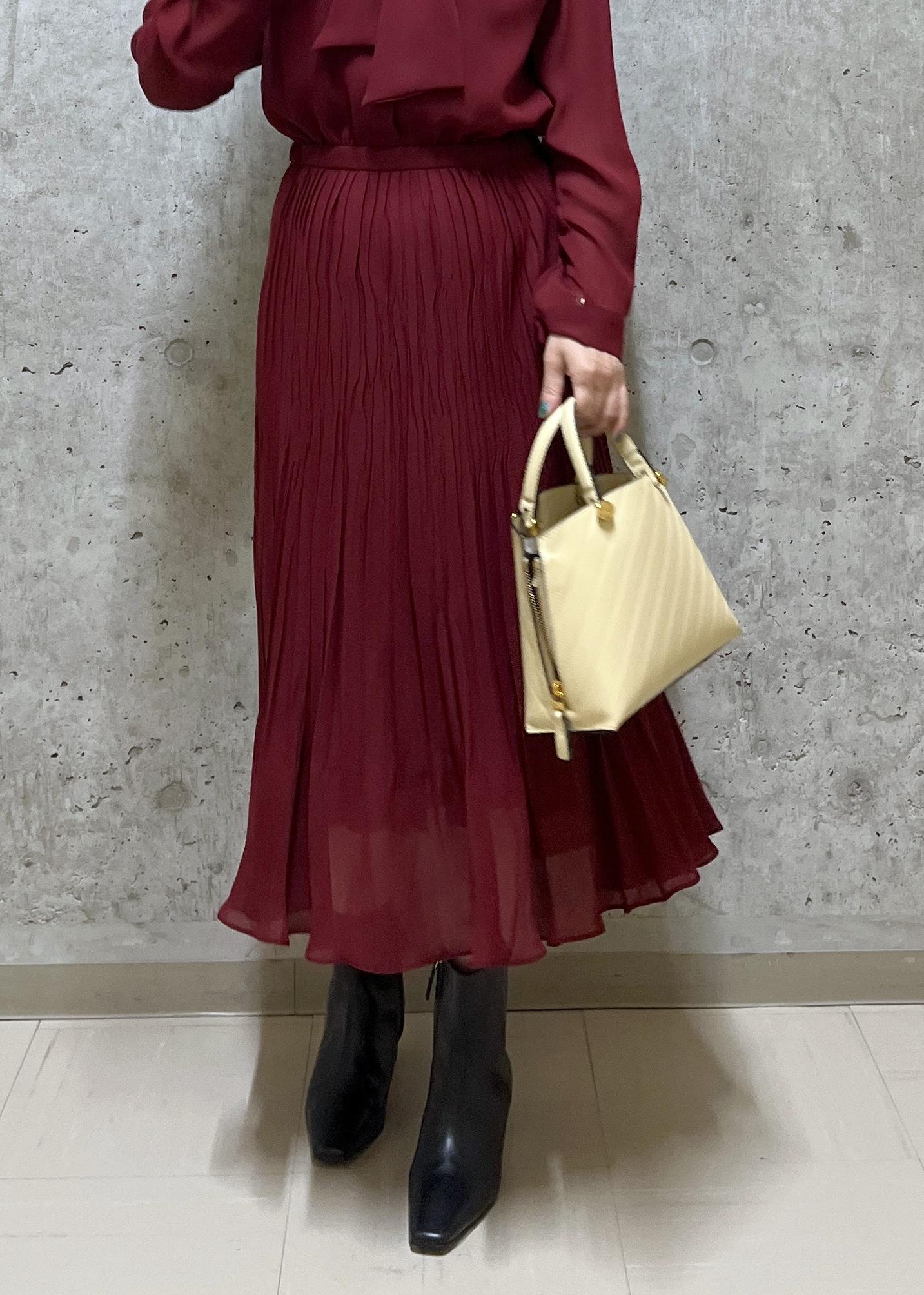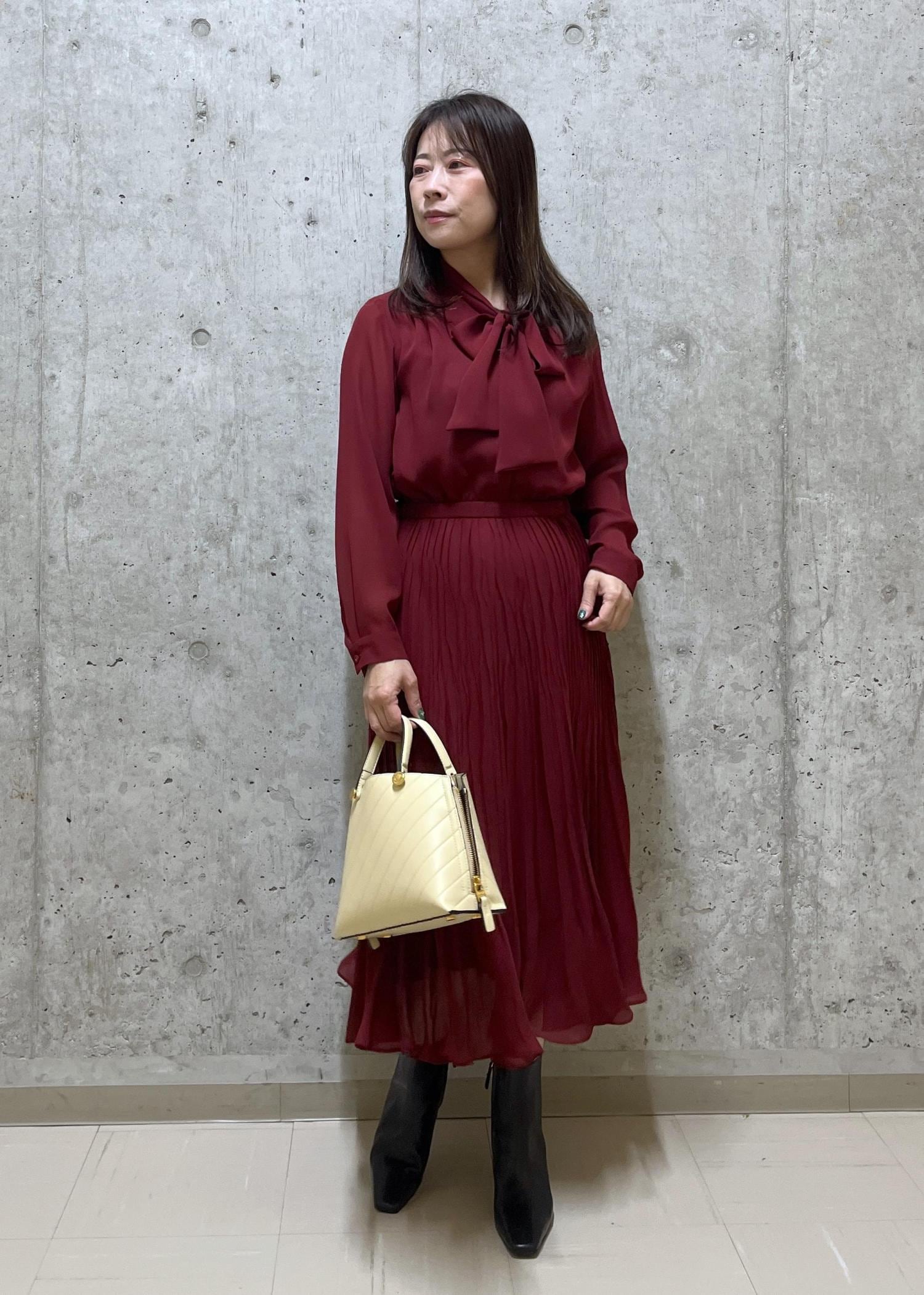 ROPÉジョーゼットシフォンプリーツワンピース/26SSワイン / 36¥49,500レビューふくらはぎ辺りの着丈で、低身長の方にも長すぎず、短すぎない丈感でした。