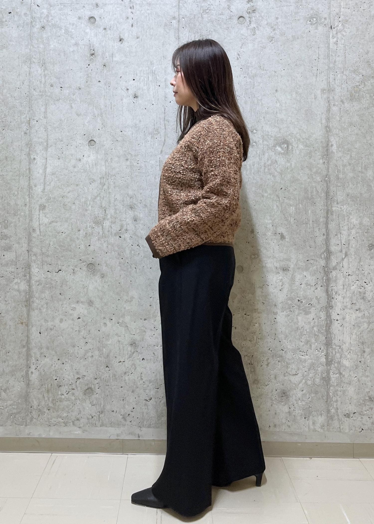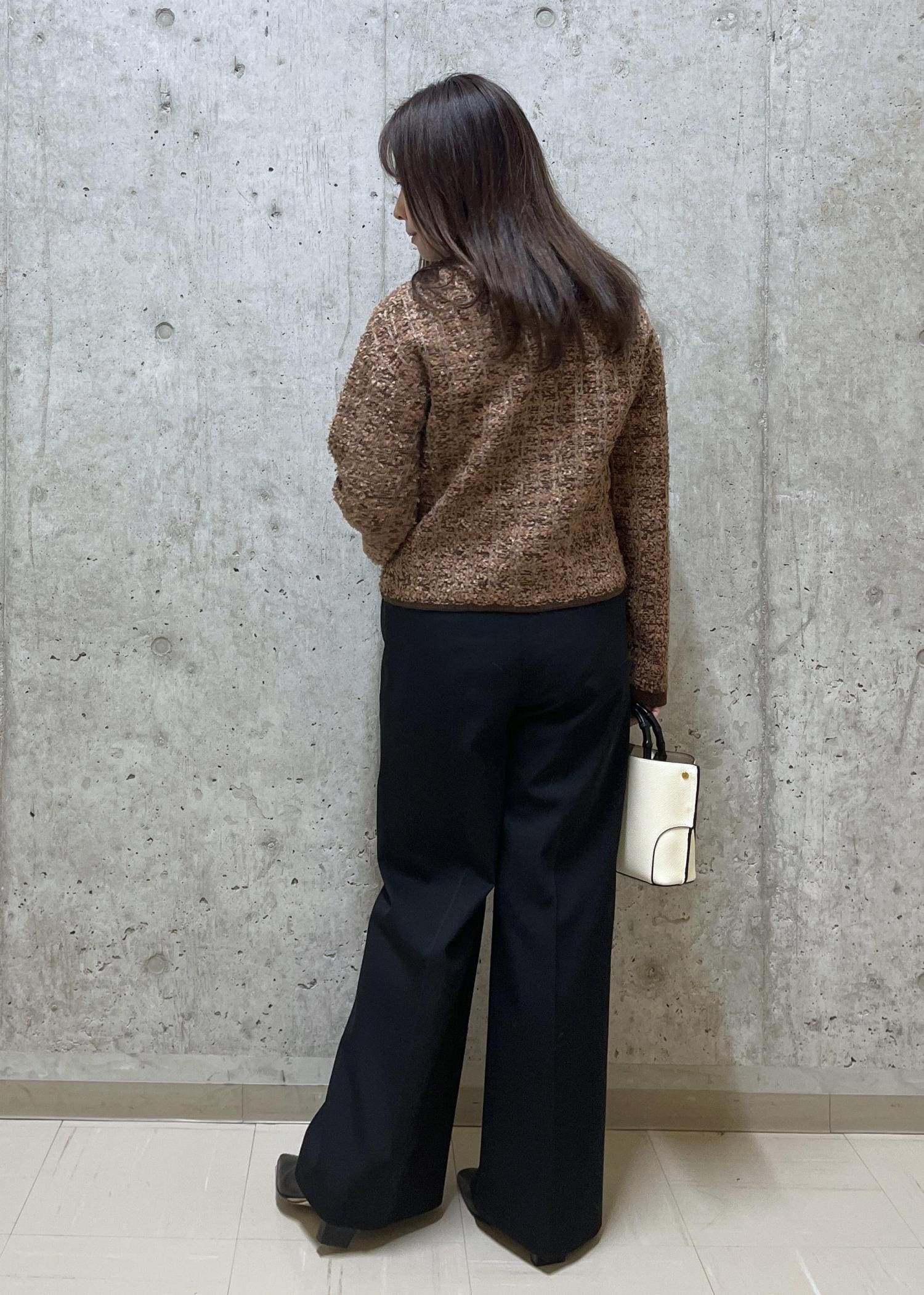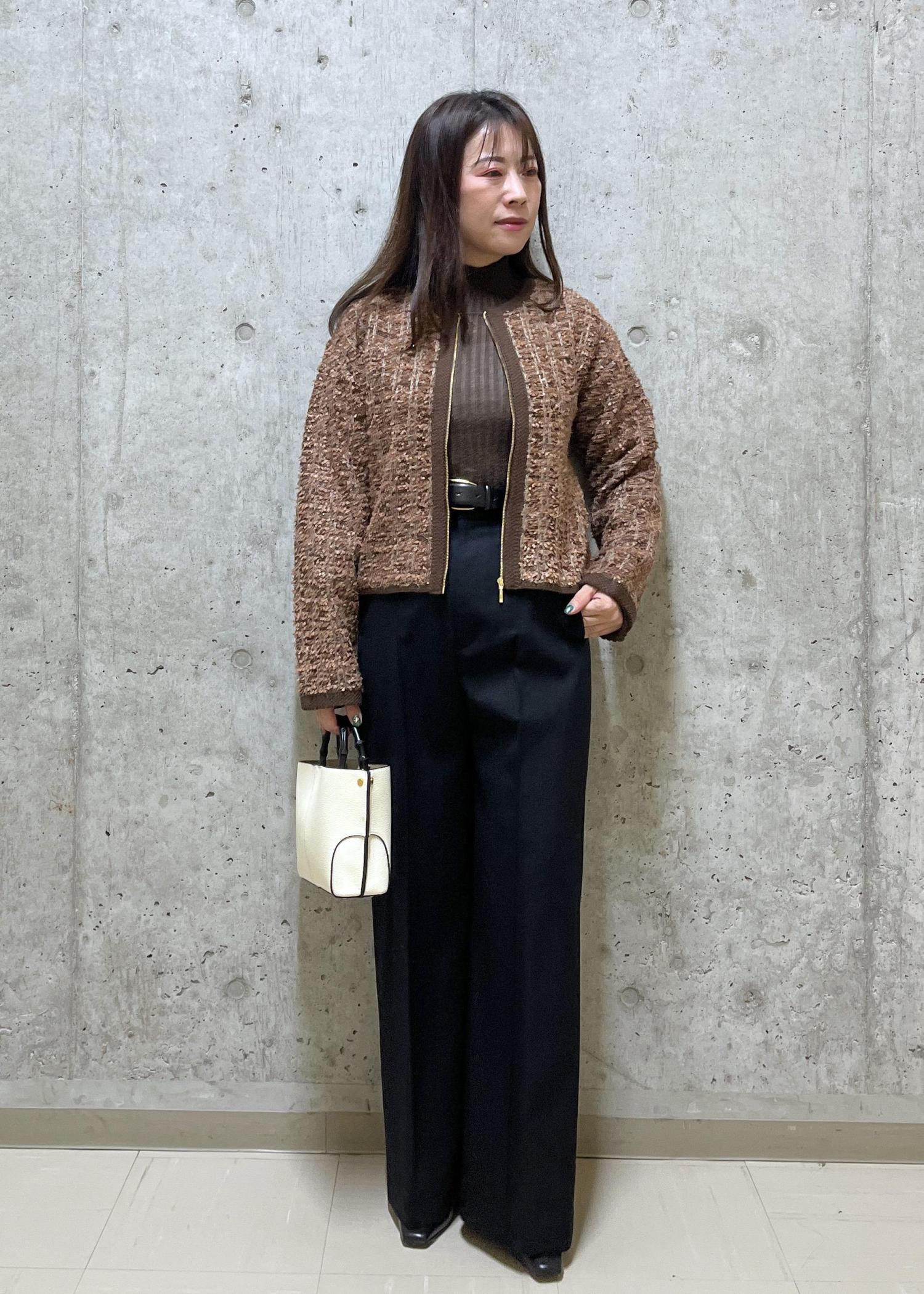 ブラウンのニットツイードは黒のパンツでかっこよくしました。