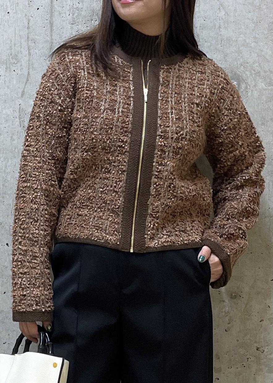 ROPÉツイードZIPノーカラーカーディガン/イージーケアブラウン系 / F¥25,300レビューヒップにかかる程のコンパクトの丈ですが、ゆったりとしていて薄手のニットと重ねても窮屈感なく着れました。