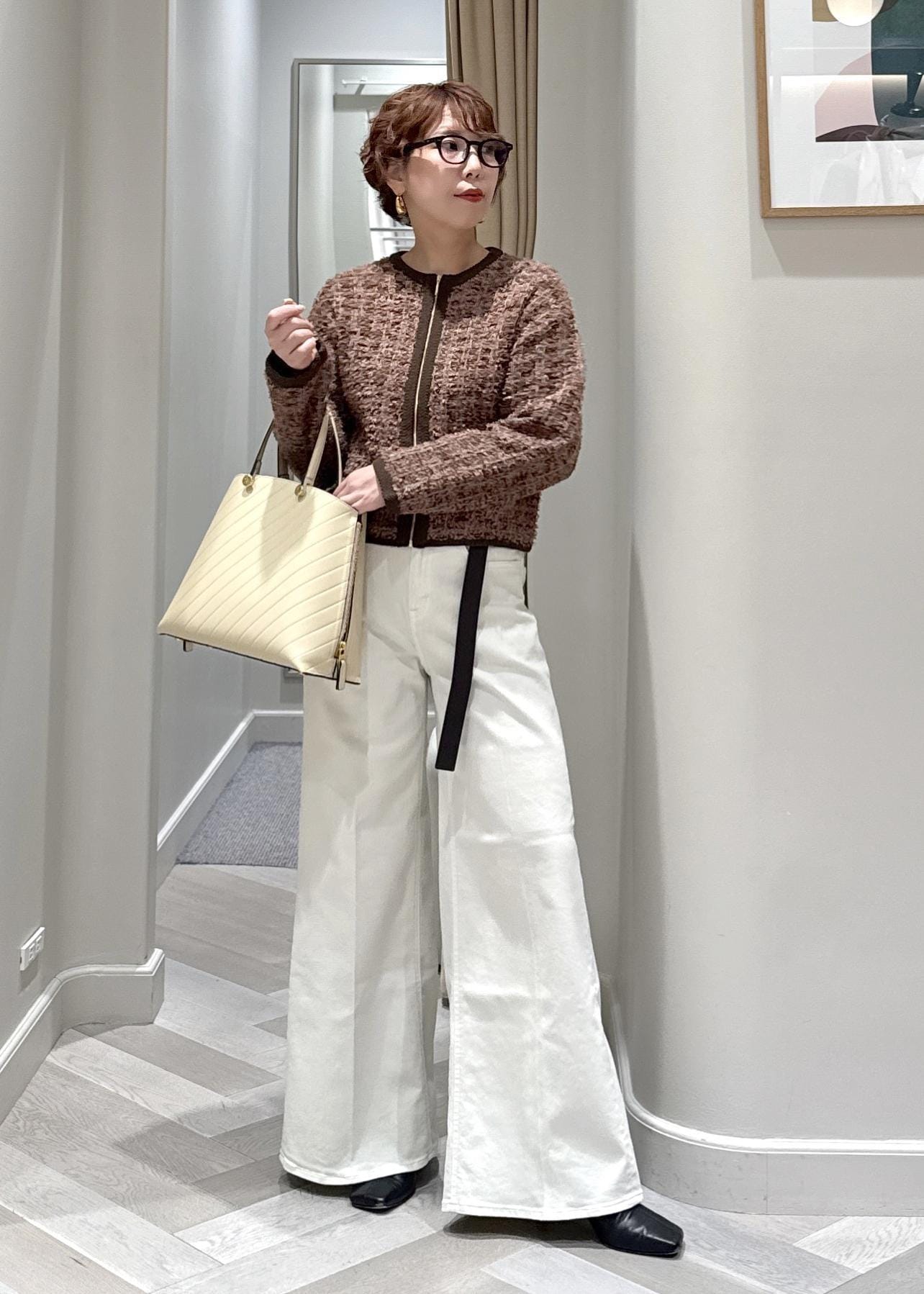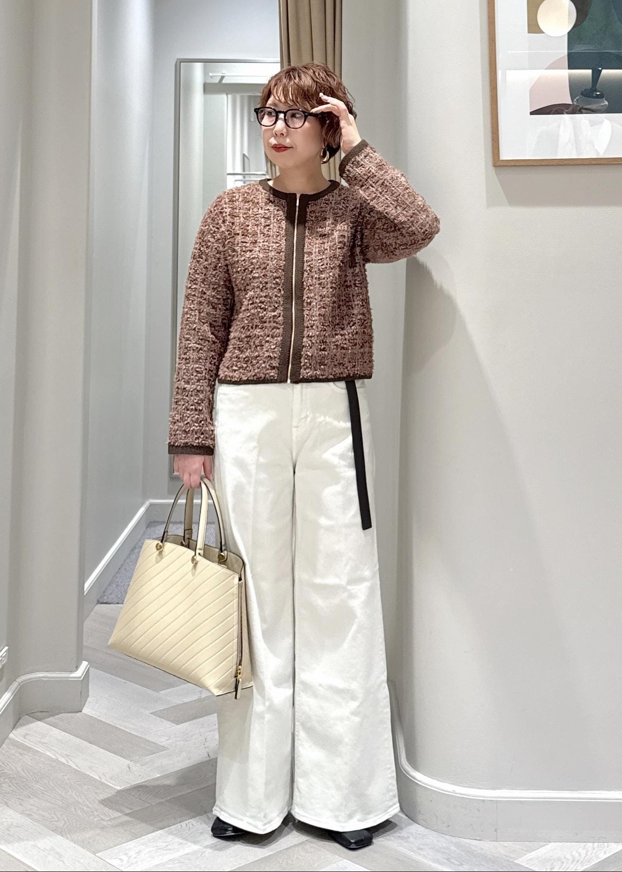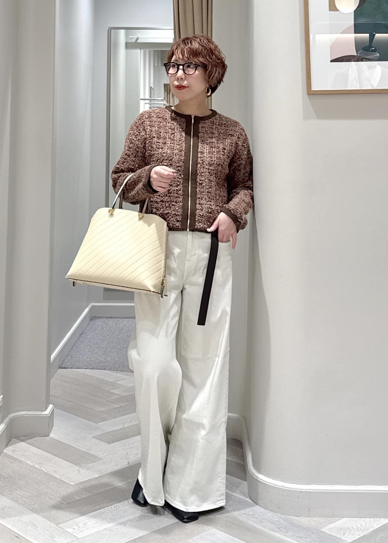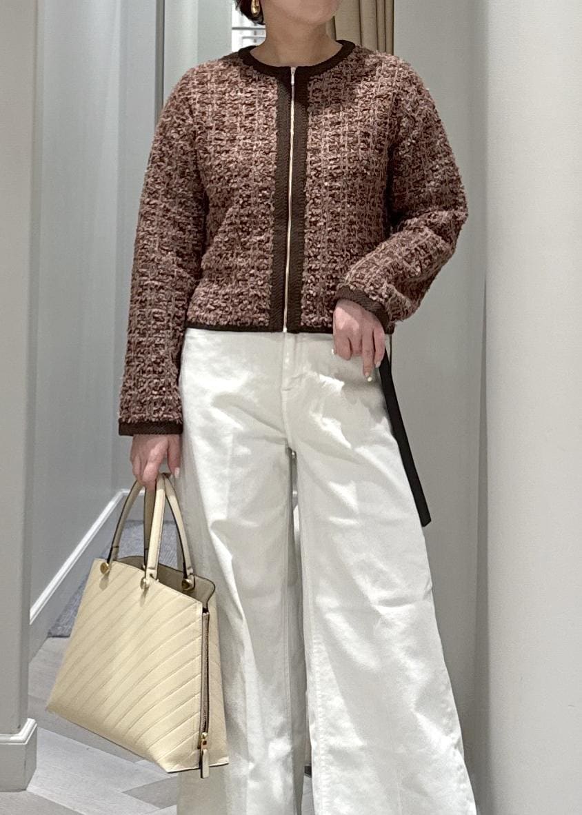 ROPÉツイードZIPノーカラーカーディガン/イージーケアブラウン系 / F¥25,300レビューきちんと見えするのにリラックスした着心地。