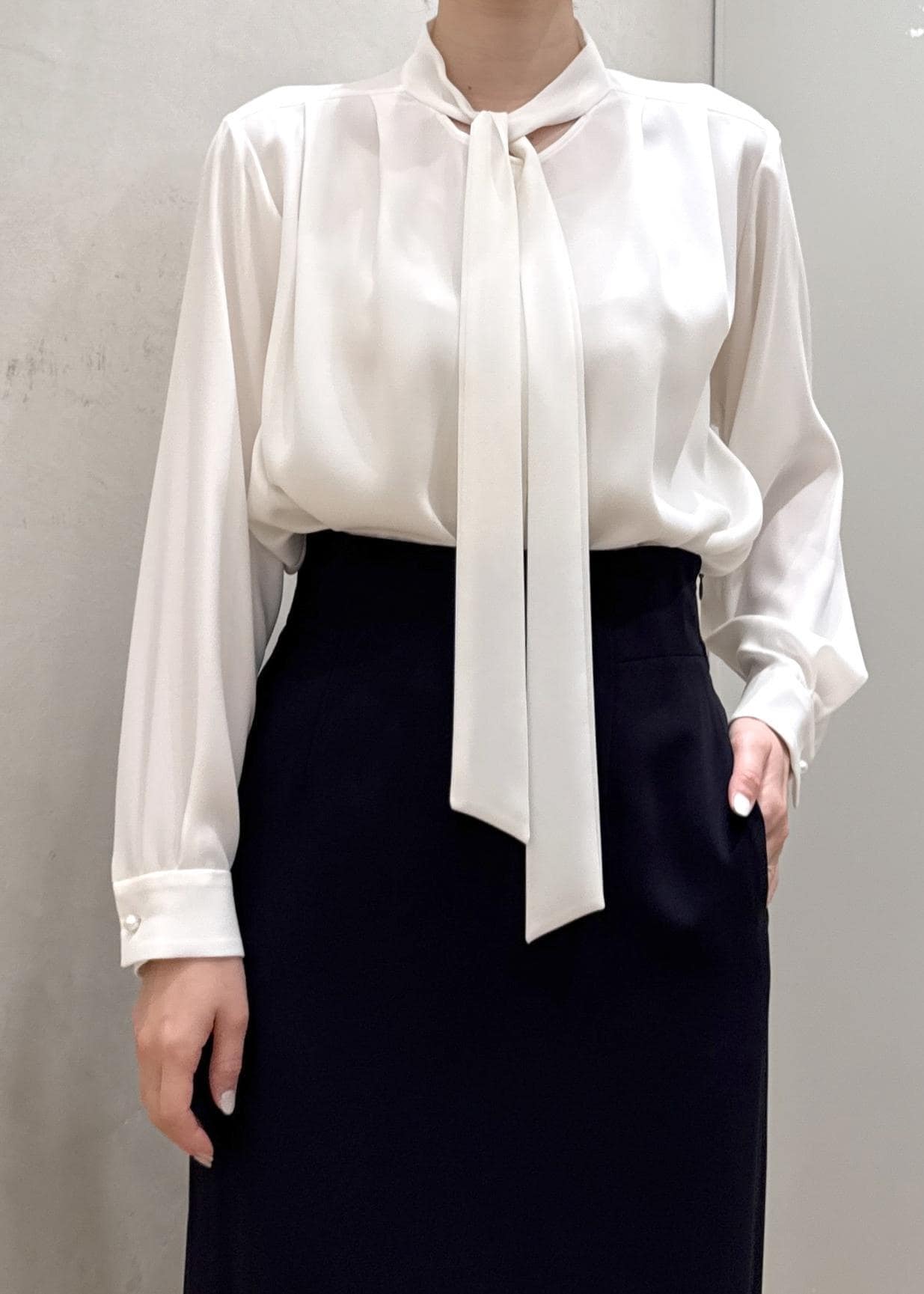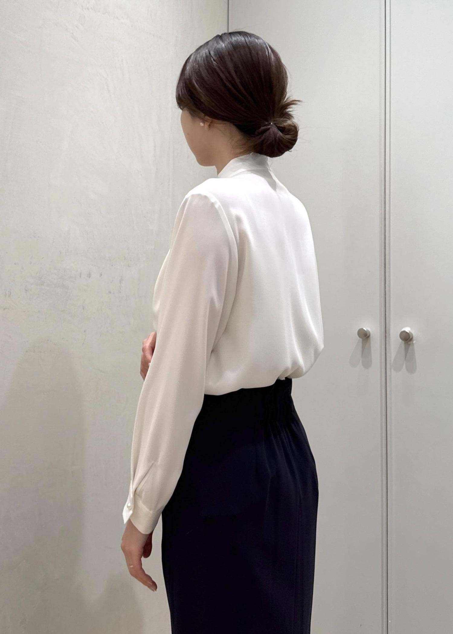 ROPÉボウタイブラウス/イージーケア・26SSホワイト / F¥22,000レビューややゆとりがあるサイズ感で、ヒップにかかる長さです。シワになりにくく、ご自宅でのお洗濯可能。
