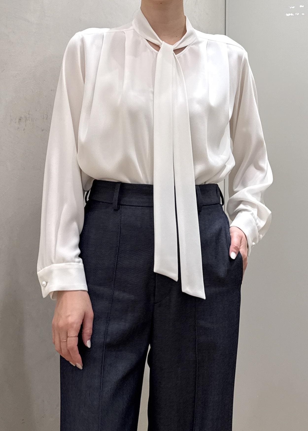 ROPÉボウタイブラウス/イージーケア・25AWホワイト / F¥22,000レビューややゆとりがあるサイズ感で、ヒップにかかる長さです。シワになりにくく、ご自宅でのお洗濯可能。