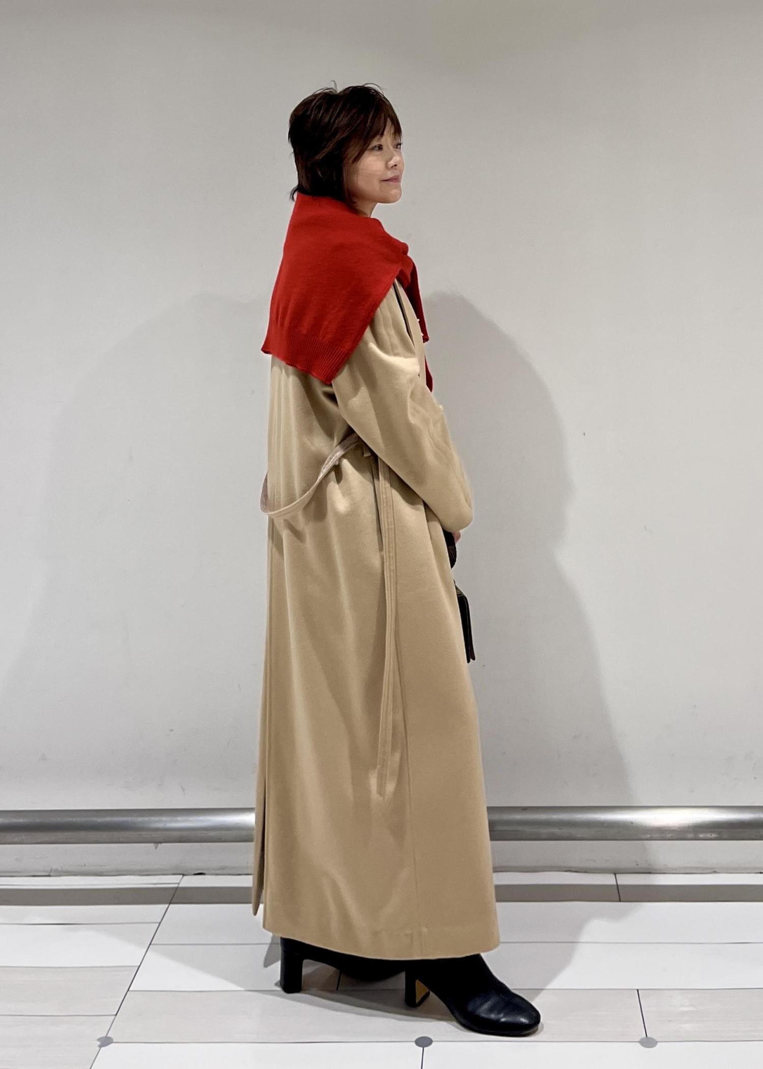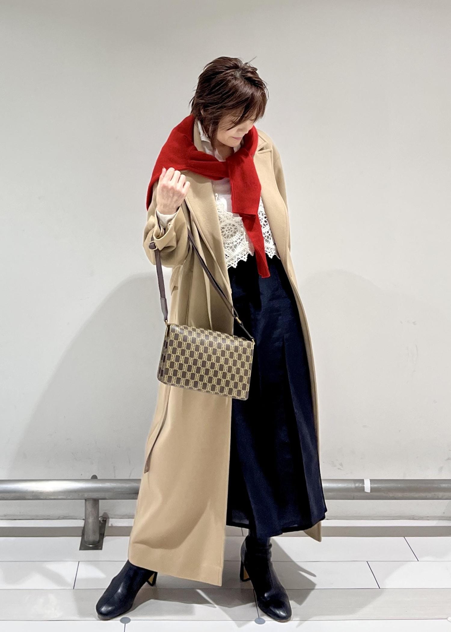 今回はカシミヤの赤のニットをアクセントに親しいお友達とのランチをイメージした着こなしにしてみました。