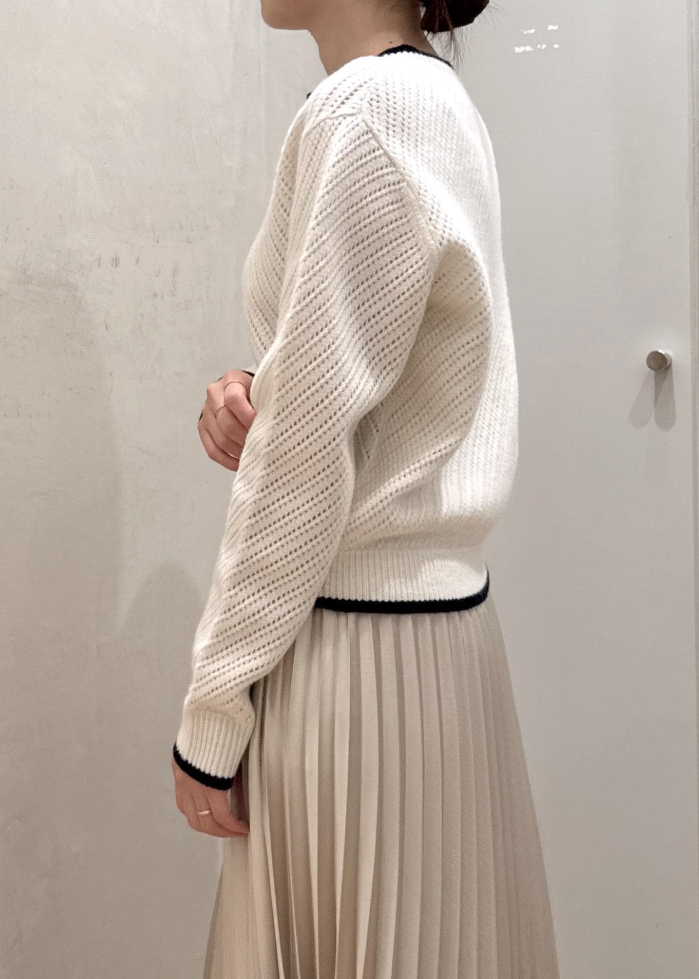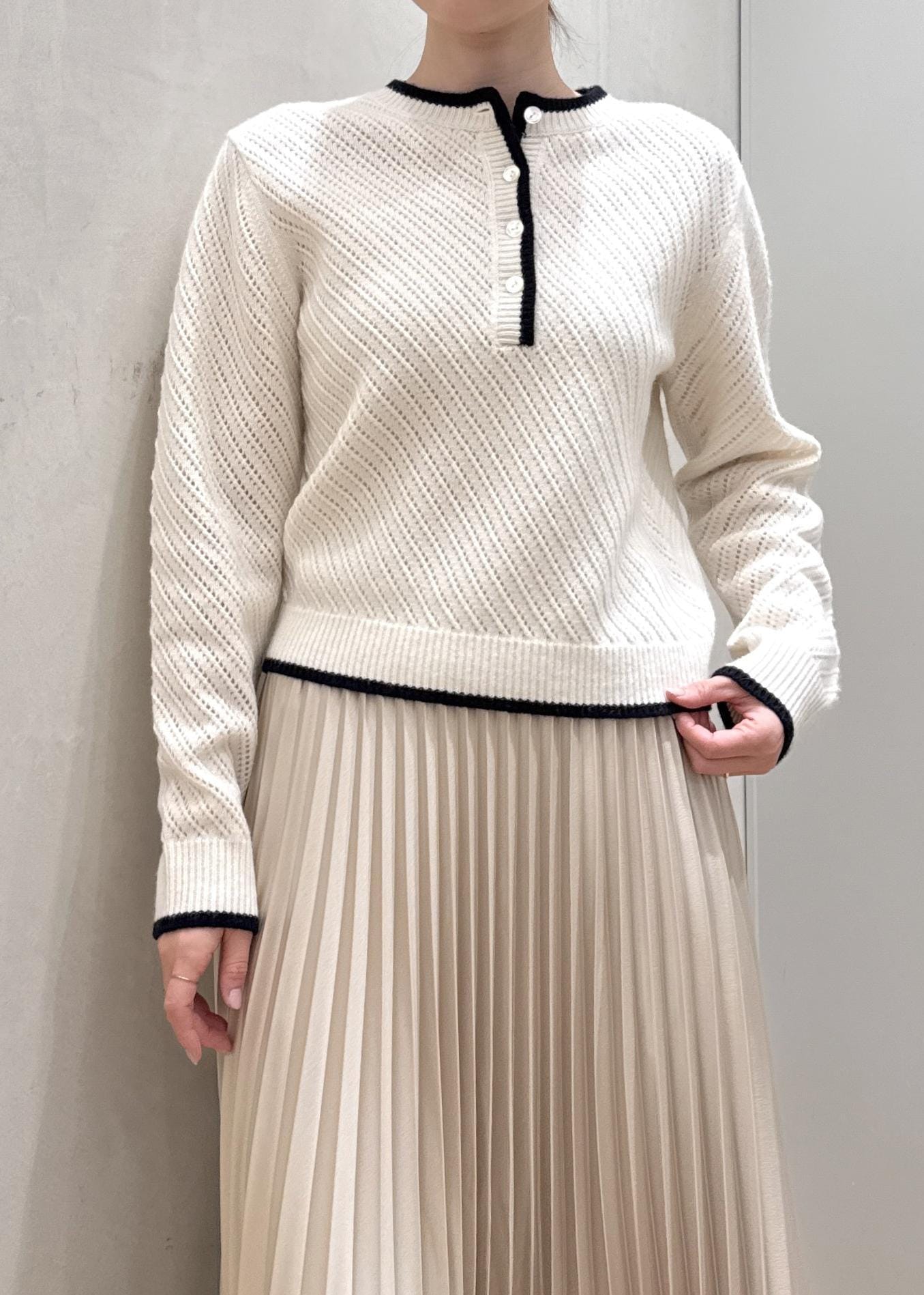 ROPÉカシミヤ混 透かし柄バイカラーニット/イージーケアオフホワイト / F¥27,500レビューカシミヤブレンドの肌触りが柔らかい素材。